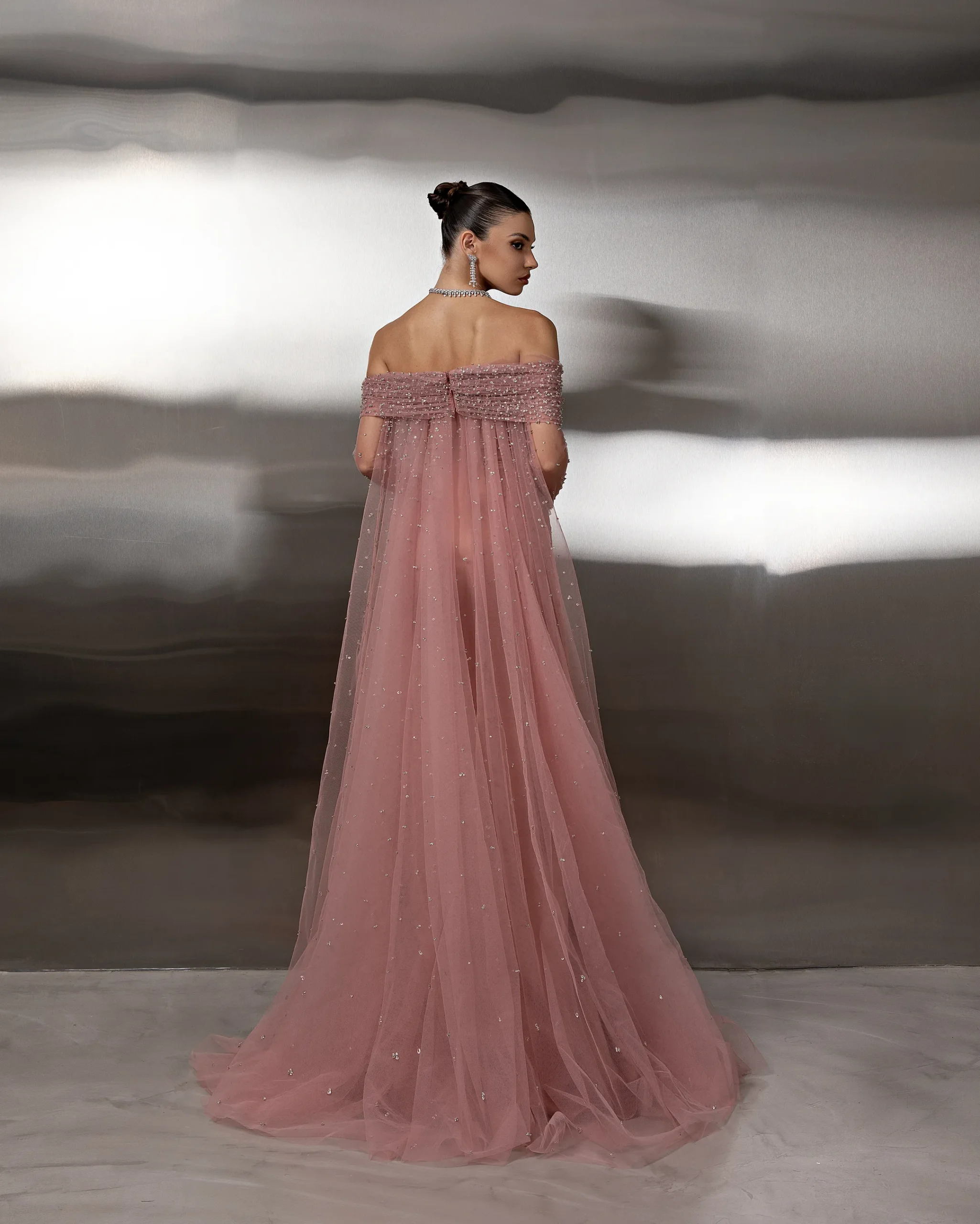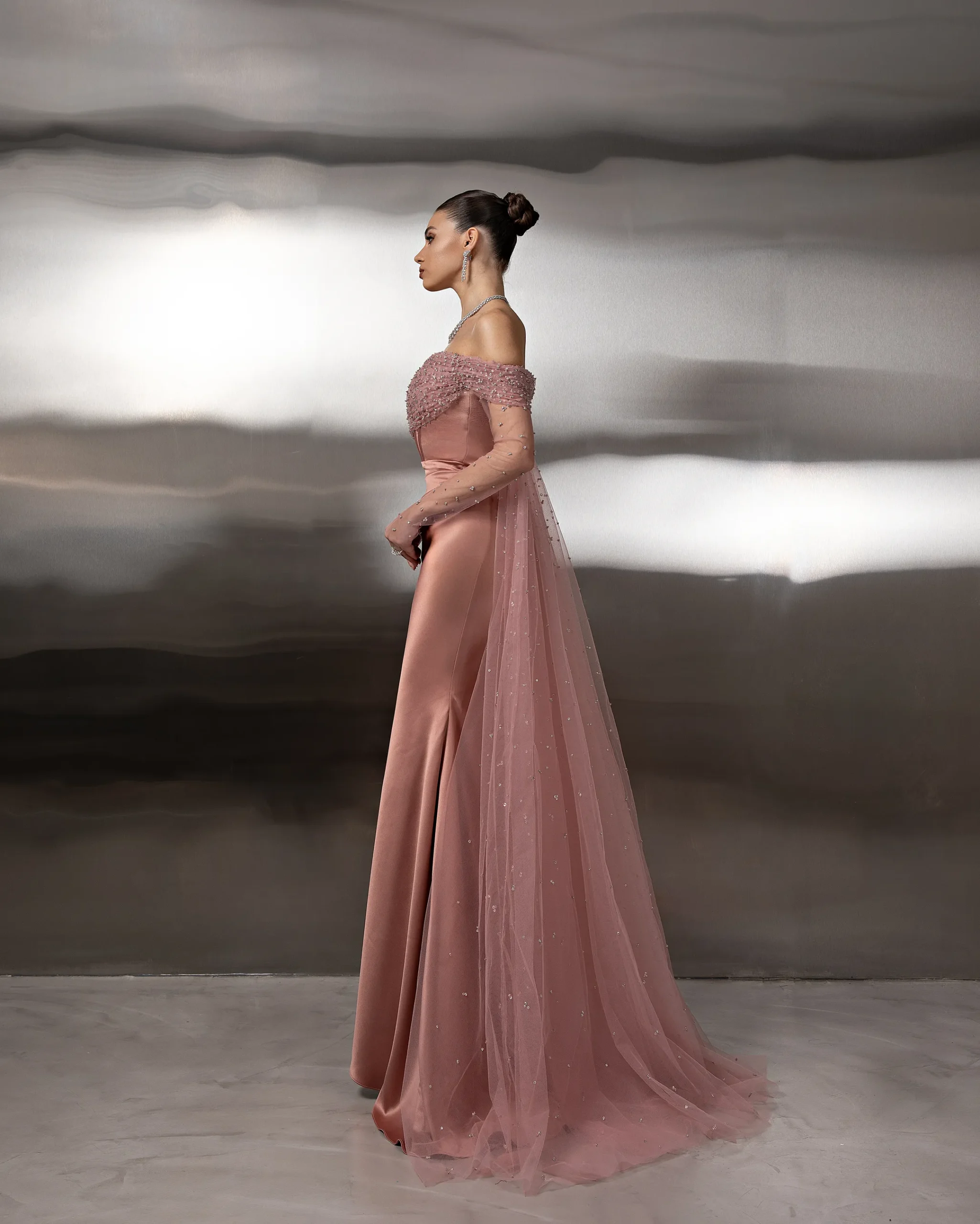 Elegant floor-length gown with an off-shoulder beaded tulle overlay, featuring a softly flowing sheer cape-style back embellished with delicate beadwork for a refined, ethereal finish. This dress is custom made by order to ensure a perfect fit.