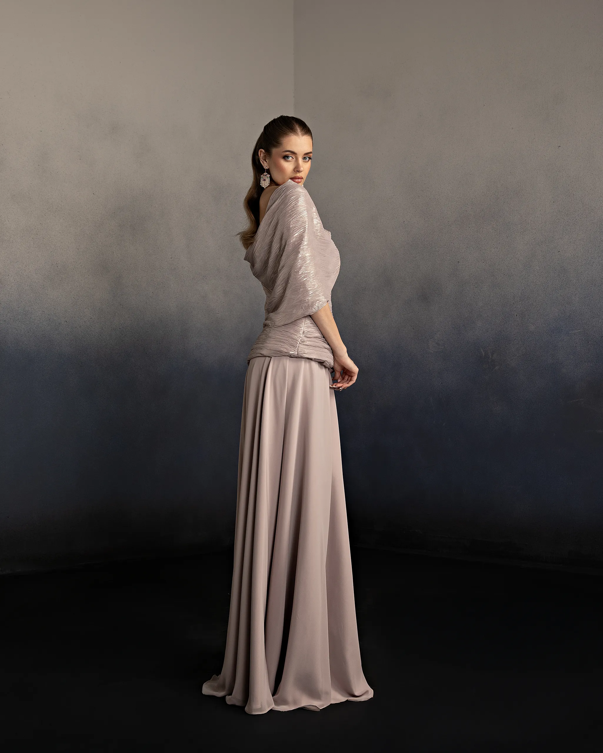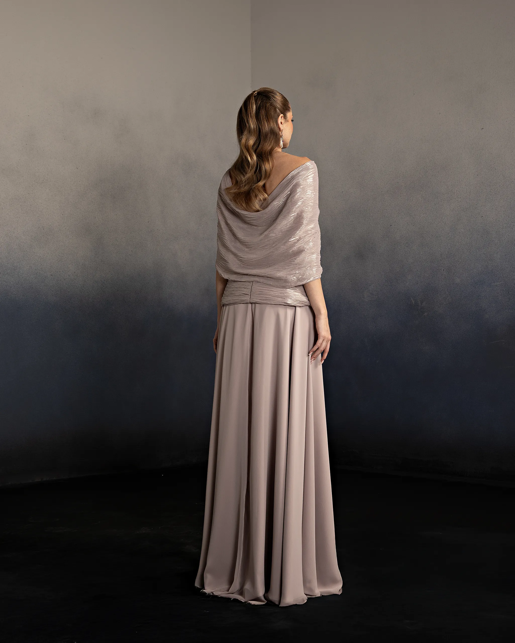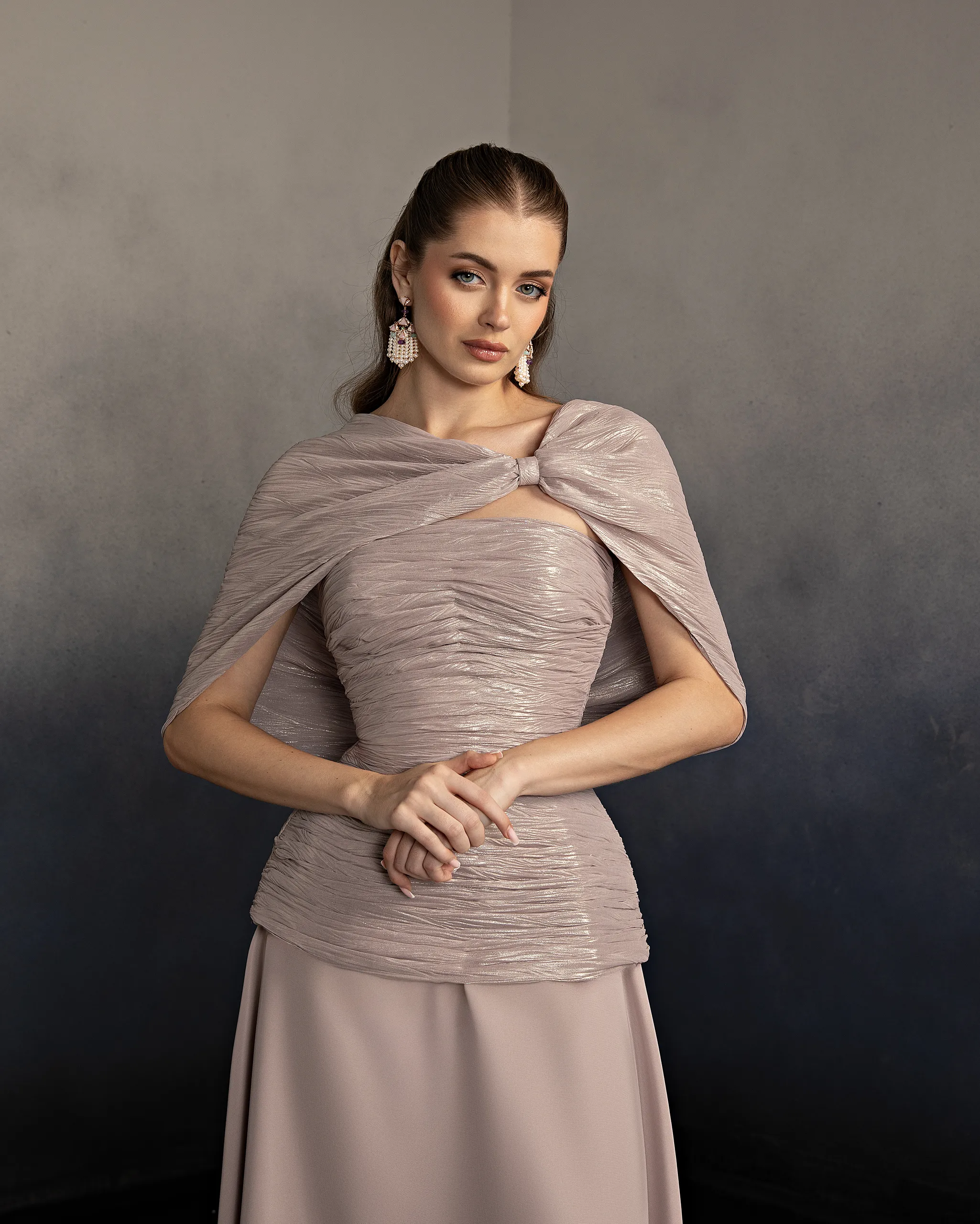 Three-piece evening set featuring a fitted ruched top, matching draped cape, and a flowing A-line skirt. Designed with soft structure and elegant movement for a graceful look. This dress is custom made by order to ensure a perfect fit.