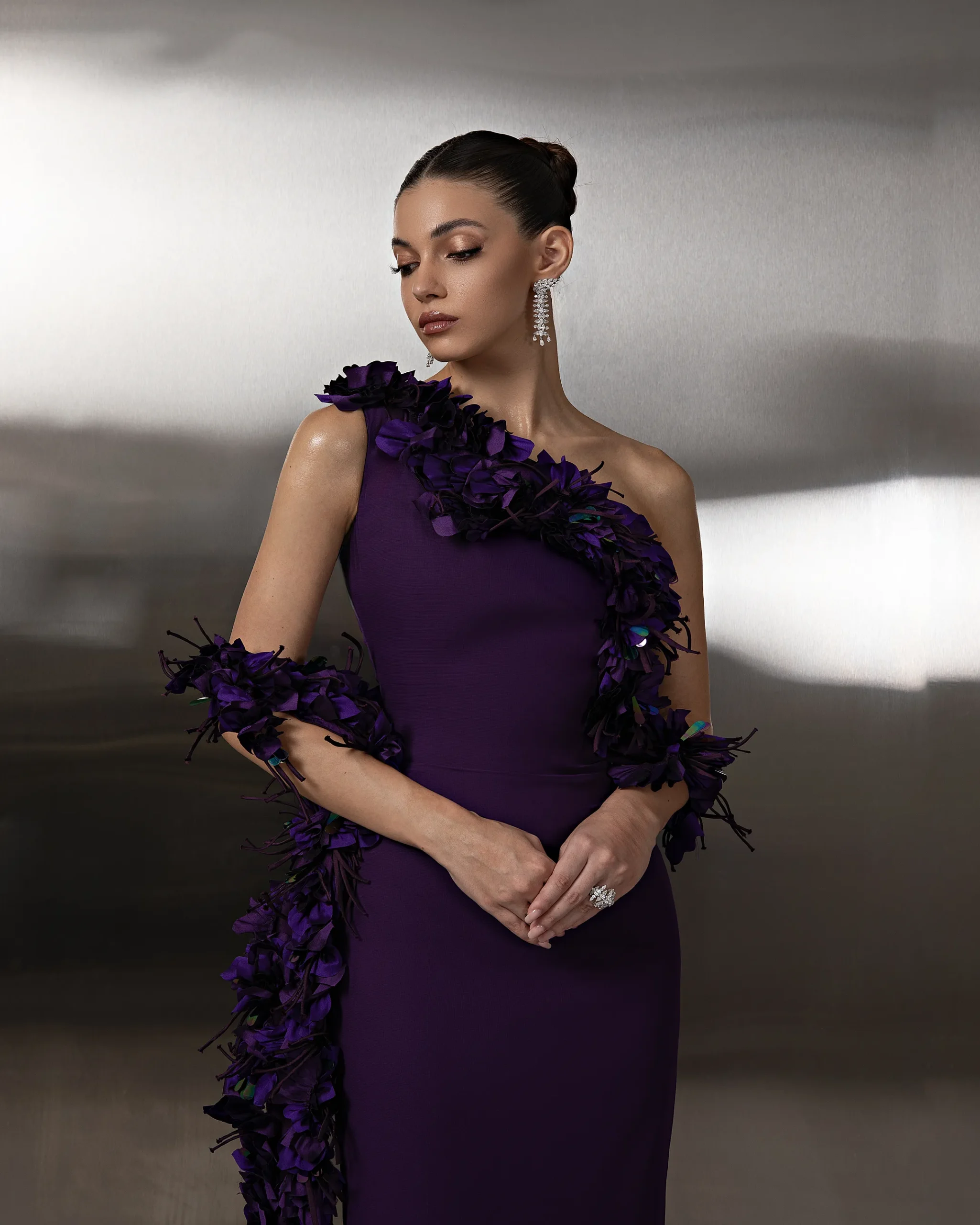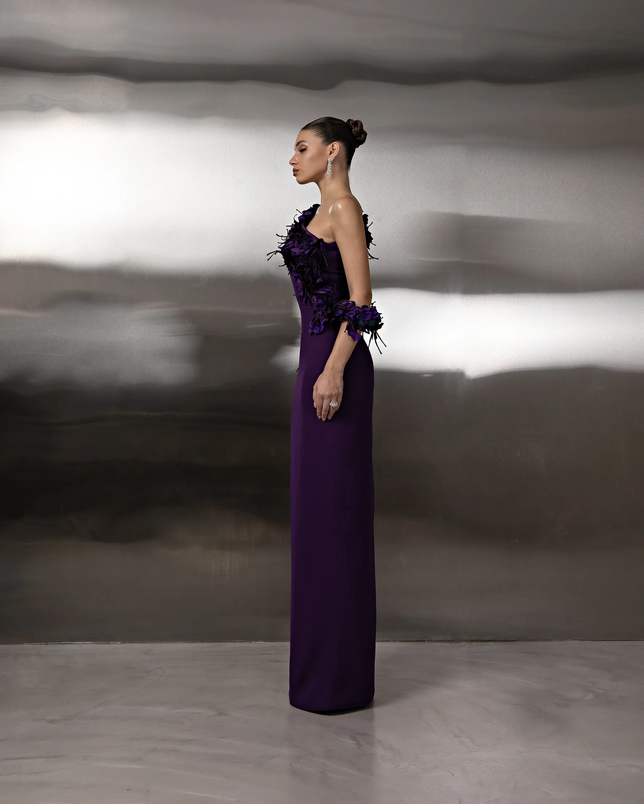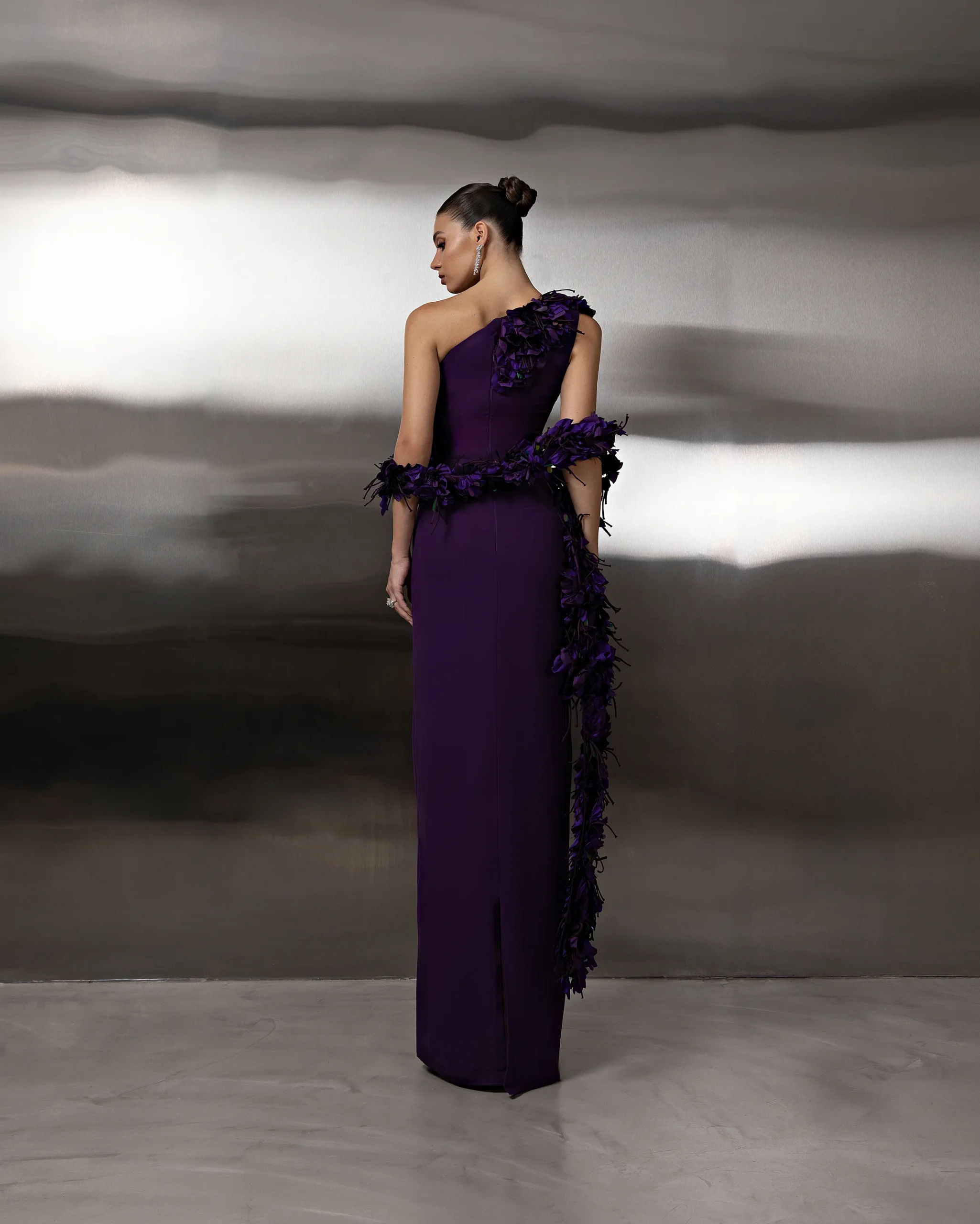 A one-shoulder column gown featuring a sleek silhouette with cascading floral appliqué shawl detailing for an elegant, sculptural finish. This dress is custom made by order to ensure a perfect fit.