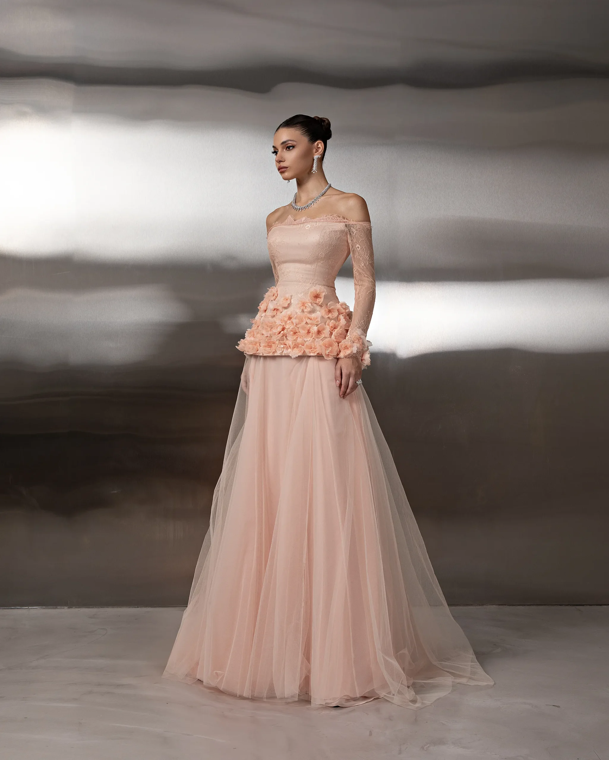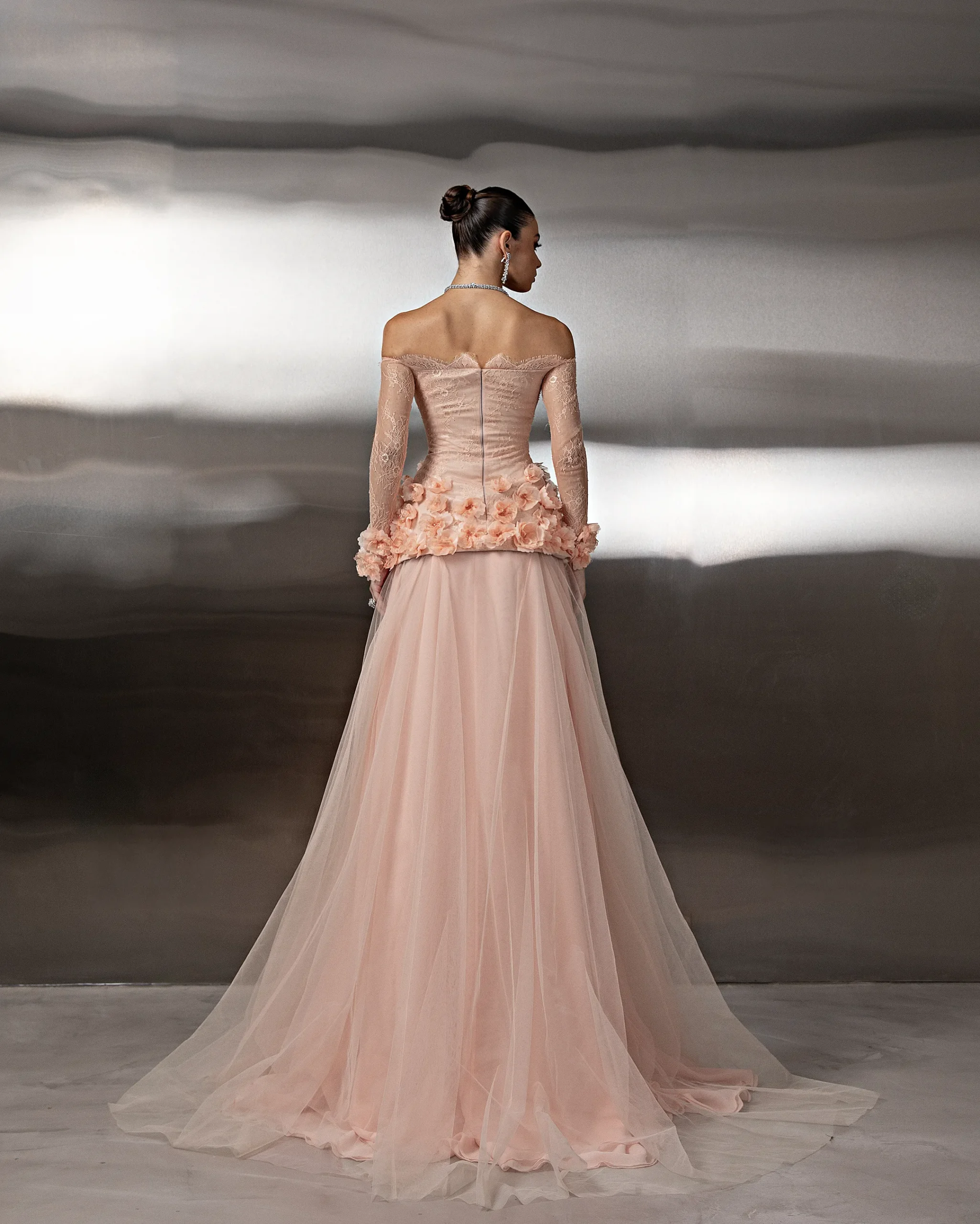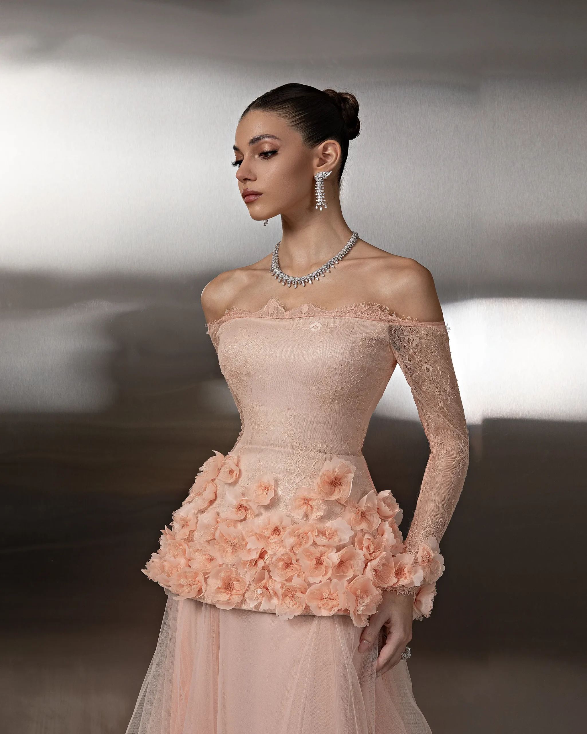 Two-piece set featuring an off-shoulder lace top with delicate floral appliqué detailing, paired with a flowing tulle and chiffon skirt for a soft, elegant silhouette. This dress is custom made by order to ensure a perfect fit.