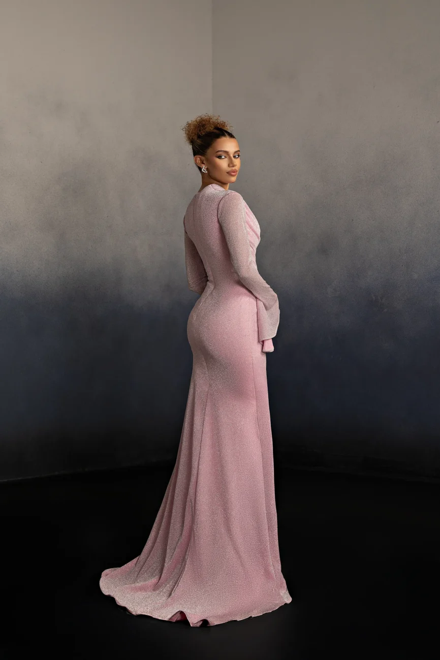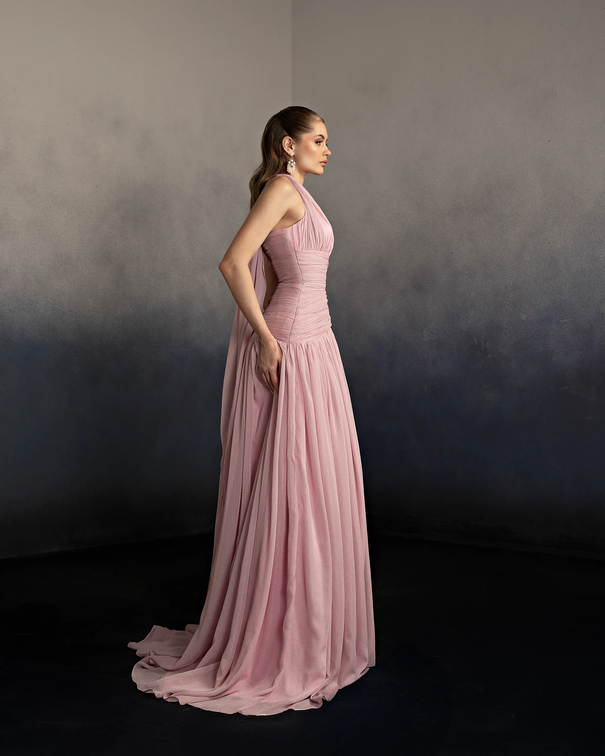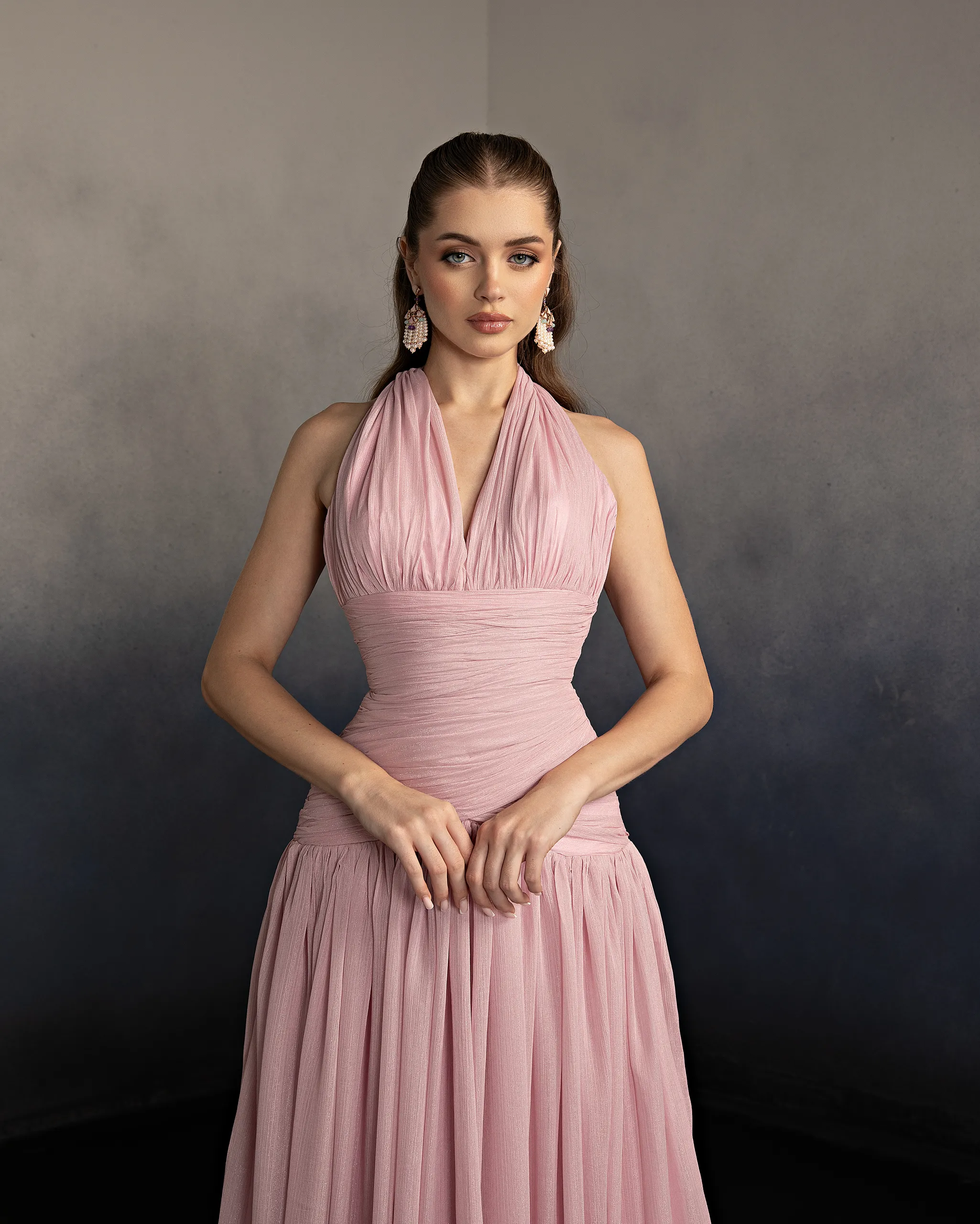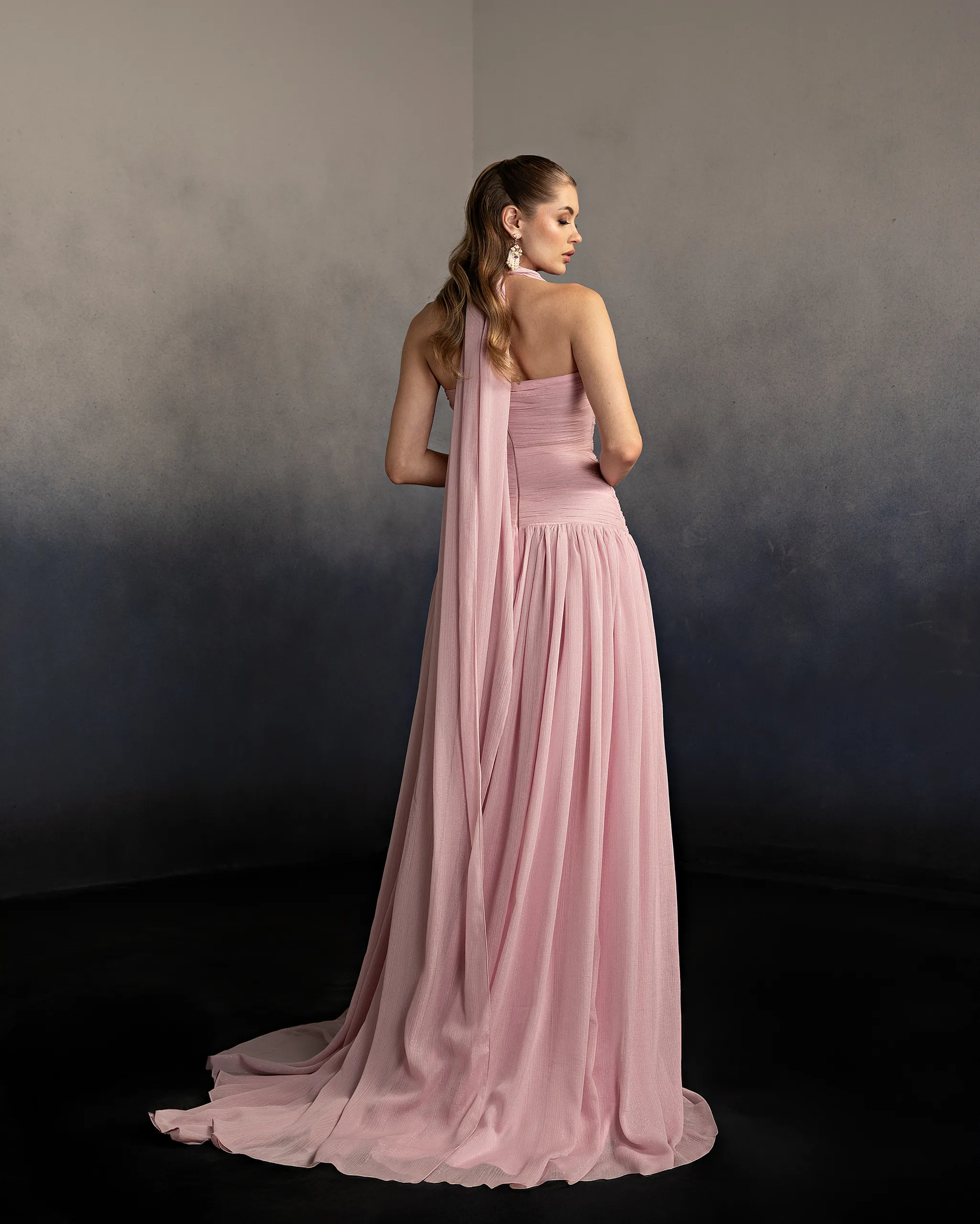 Halter neck evening gown with a softly draped bodice and gathered flowing skirt. The neckline ties at the back, creating an elegant open-back detail and a graceful silhouette. This dress is custom made by order to ensure a perfect fit.