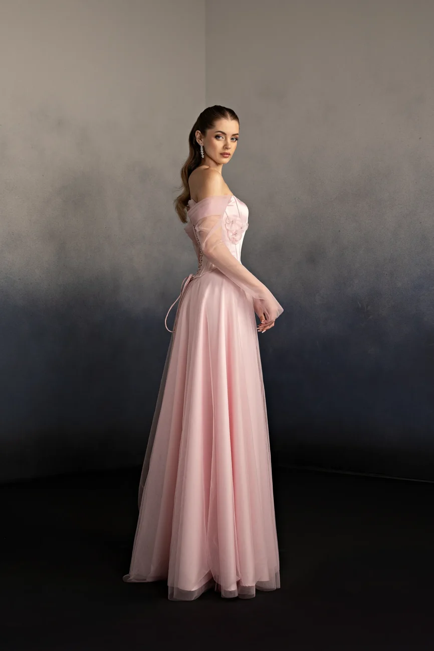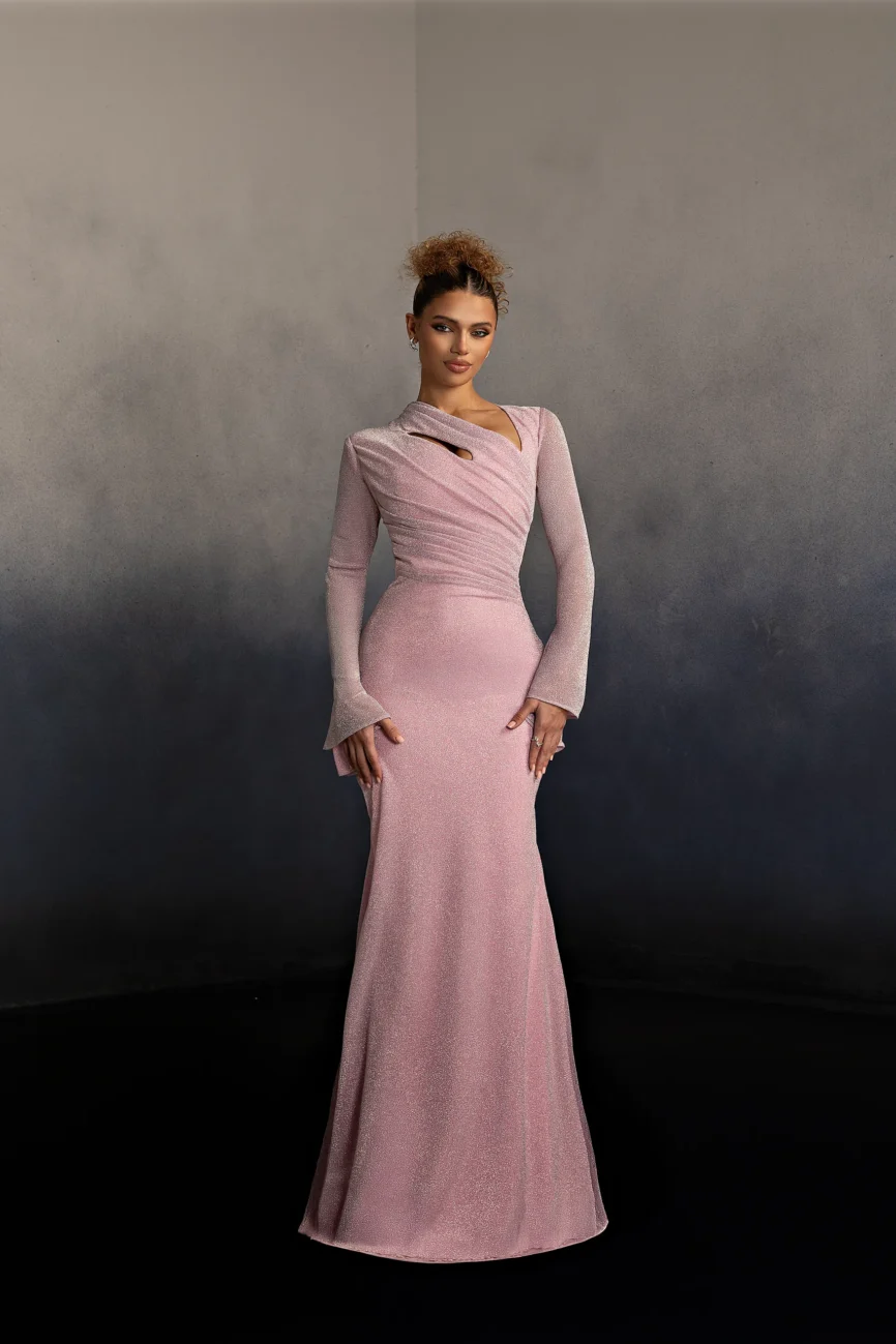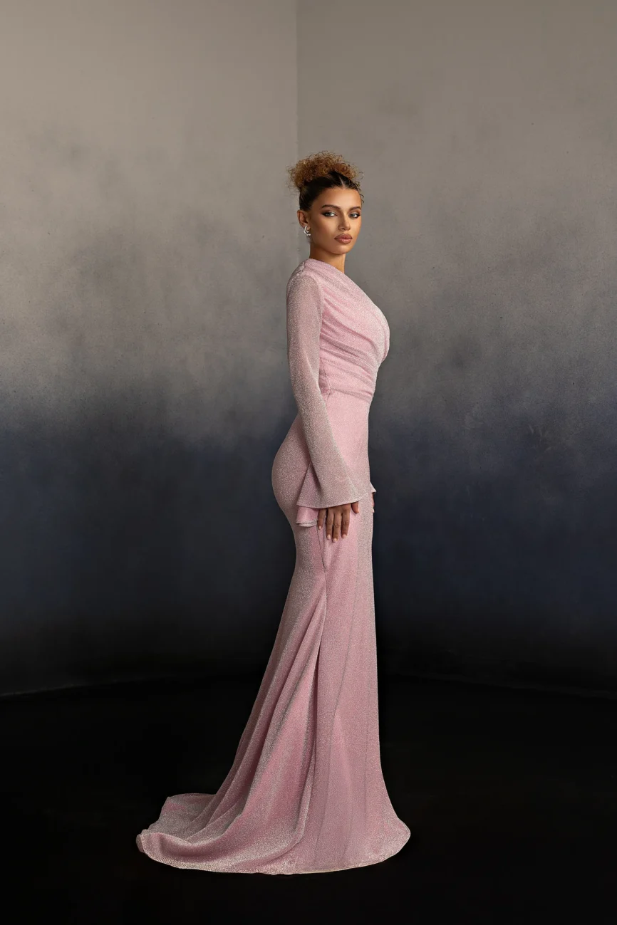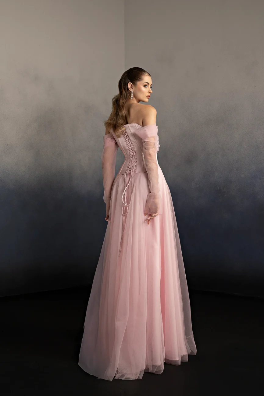 Halter neck evening gown with a softly draped bodice and gathered flowing skirt. The neckline ties at the back, creating an elegant open-back detail and a graceful silhouette. This dress is custom made by order to ensure a perfect fit.