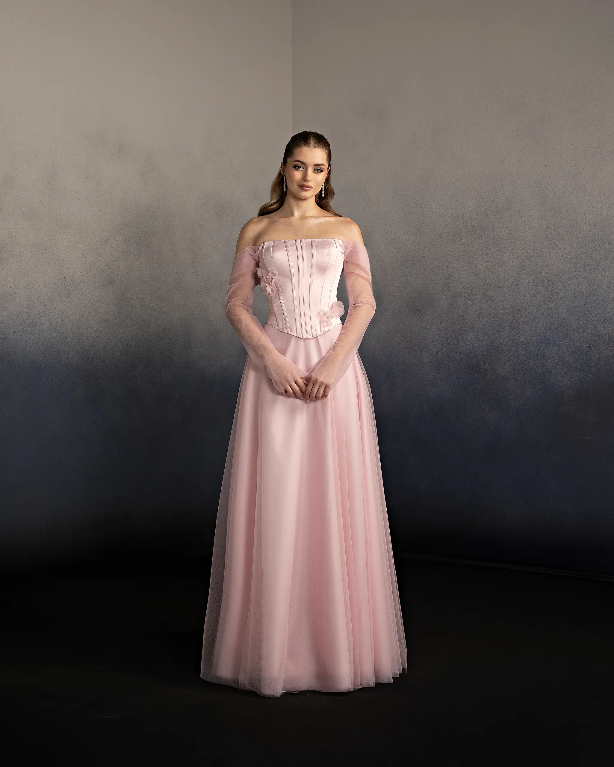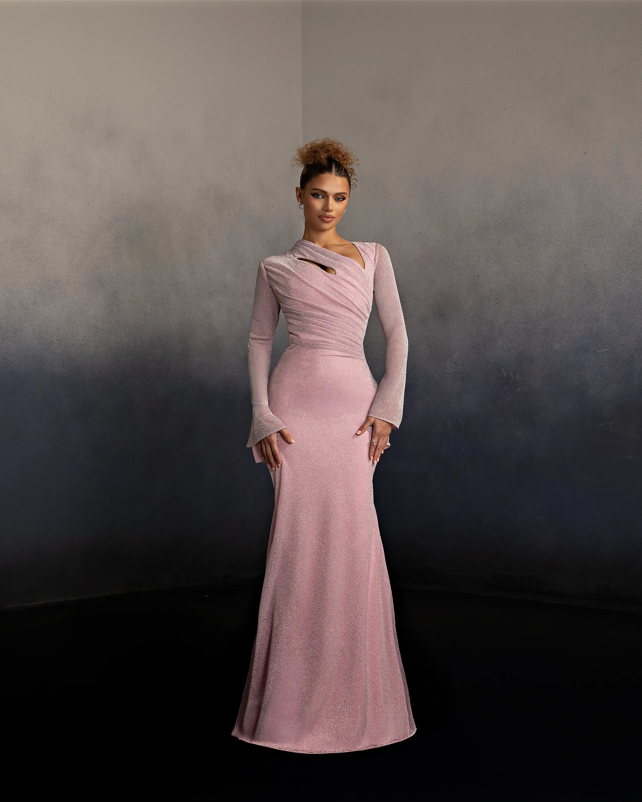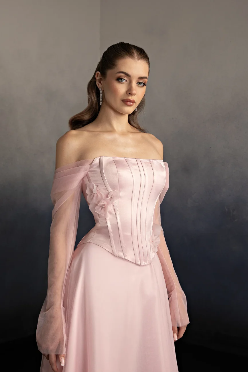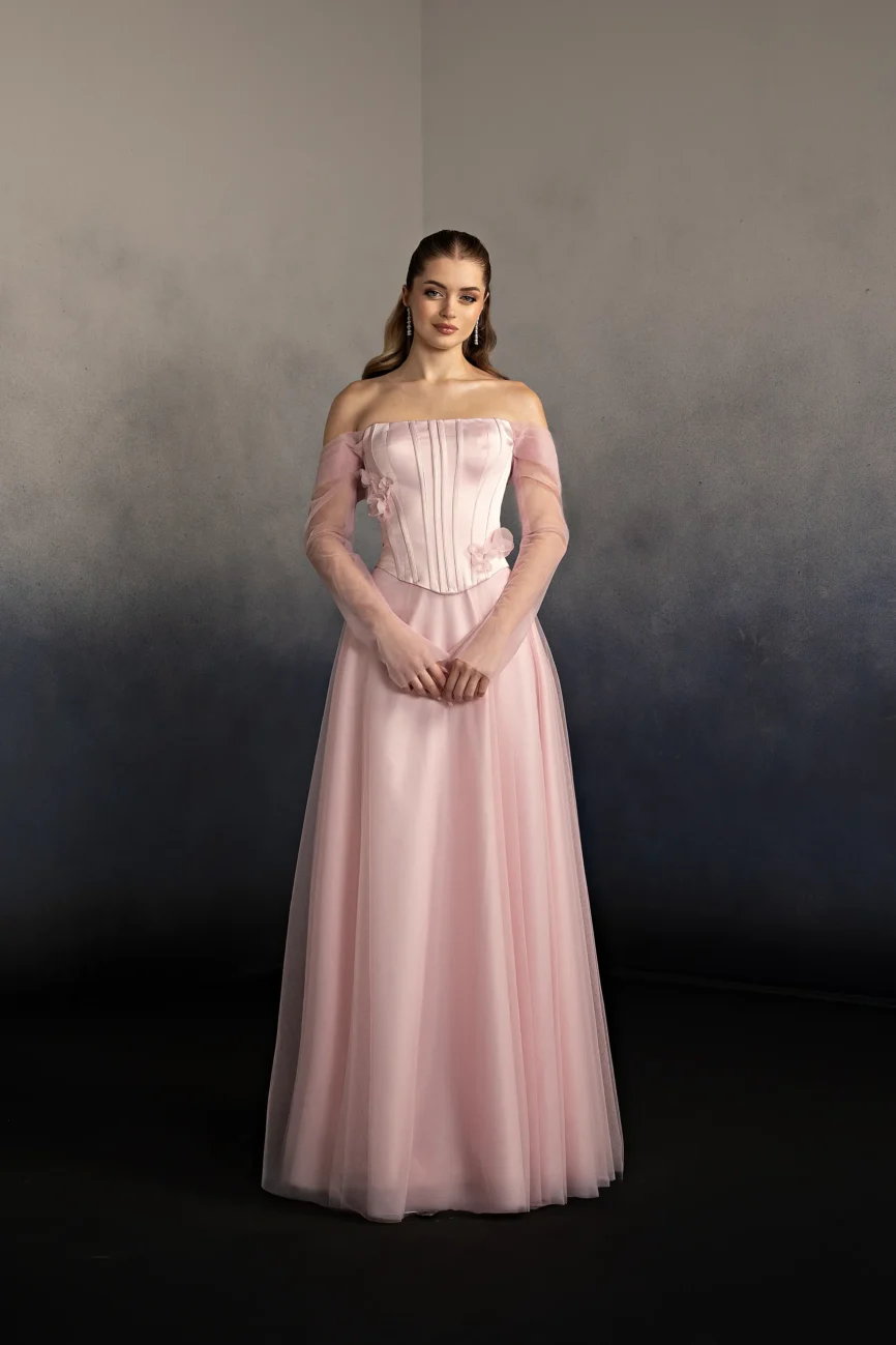 Halter neck evening gown with a softly draped bodice and gathered flowing skirt. The neckline ties at the back, creating an elegant open-back detail and a graceful silhouette. This dress is custom made by order to ensure a perfect fit.