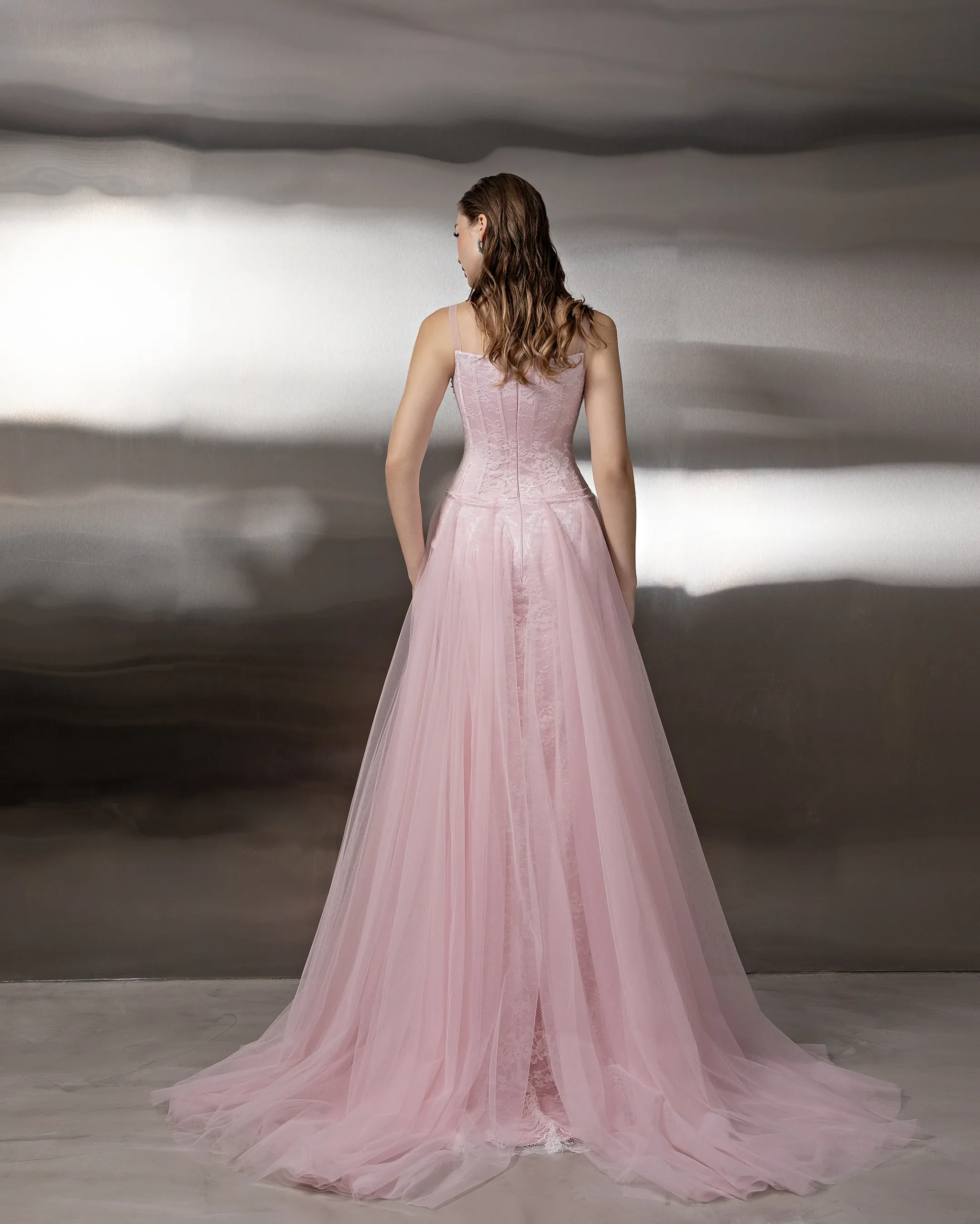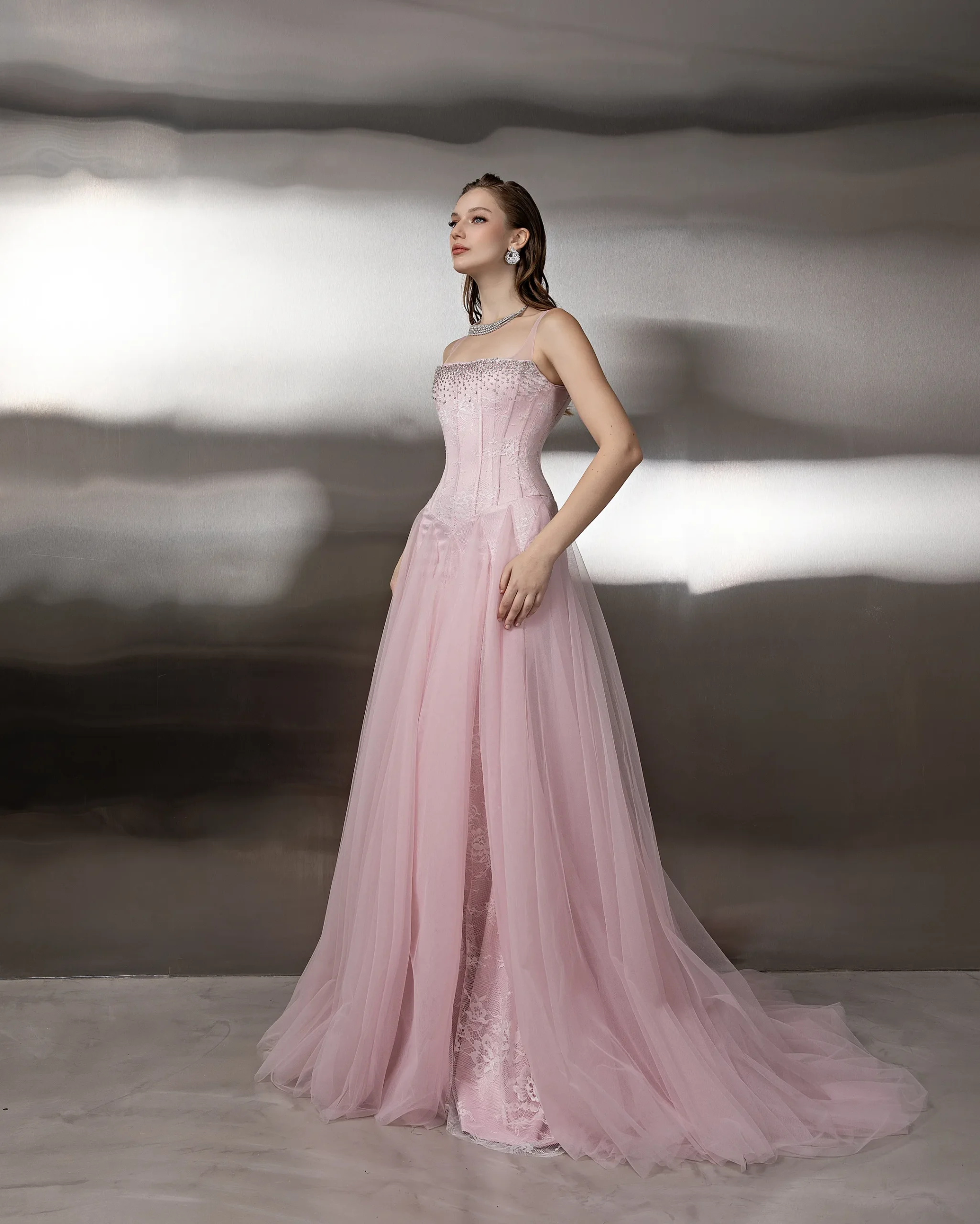 Refined evening gown featuring a structured embellished lace corset bodice with delicate straps, paired with a softly flowing tulle skirt for an elegant, balanced silhouette. This dress is custom made by order to ensure a perfect fit.