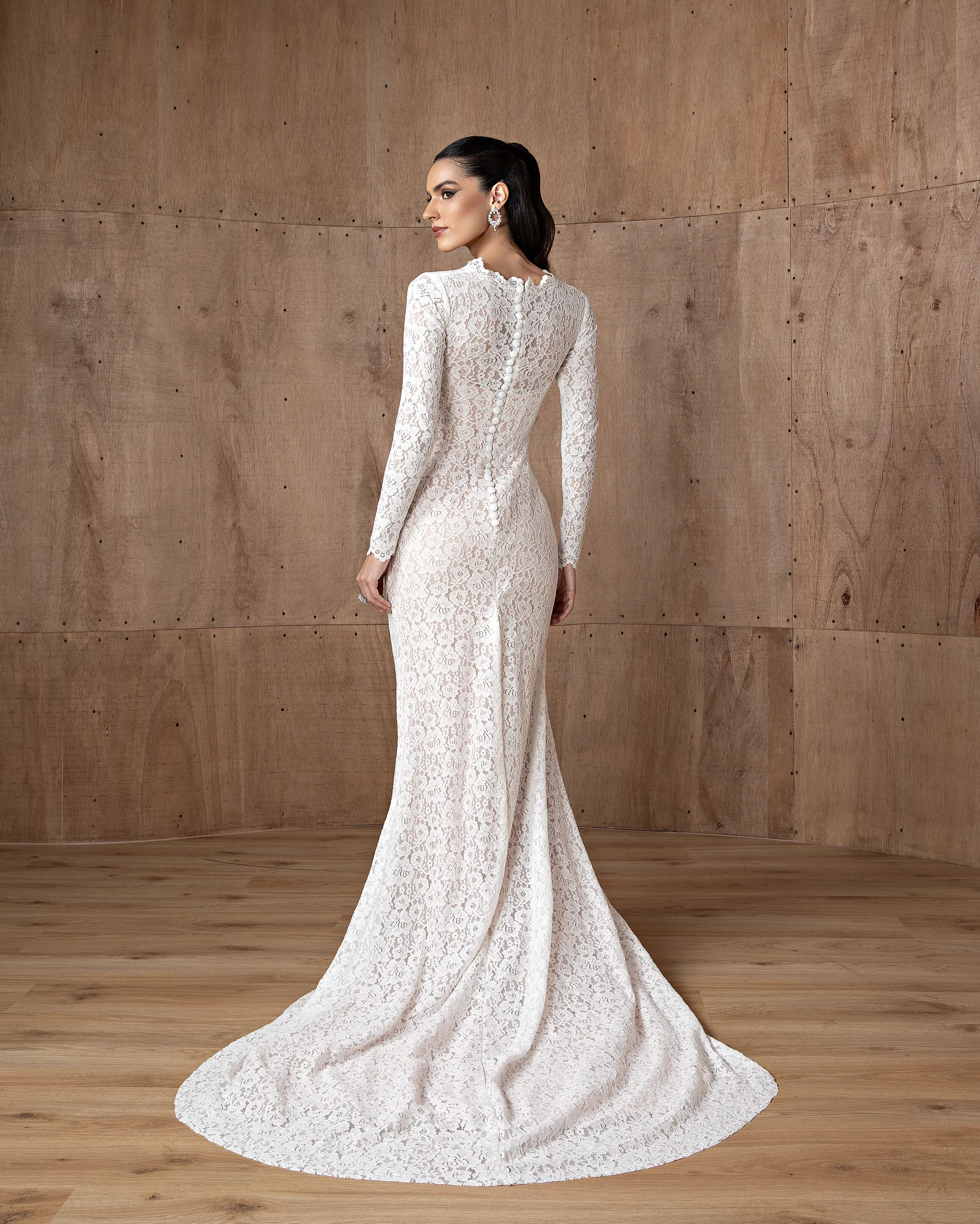 This lace mermaid gown features long sleeves and a sophisticated high neckline with scalloped eyelash trim, a structured inner corset bodice.This dress is custom made by order to ensure a perfect fit.