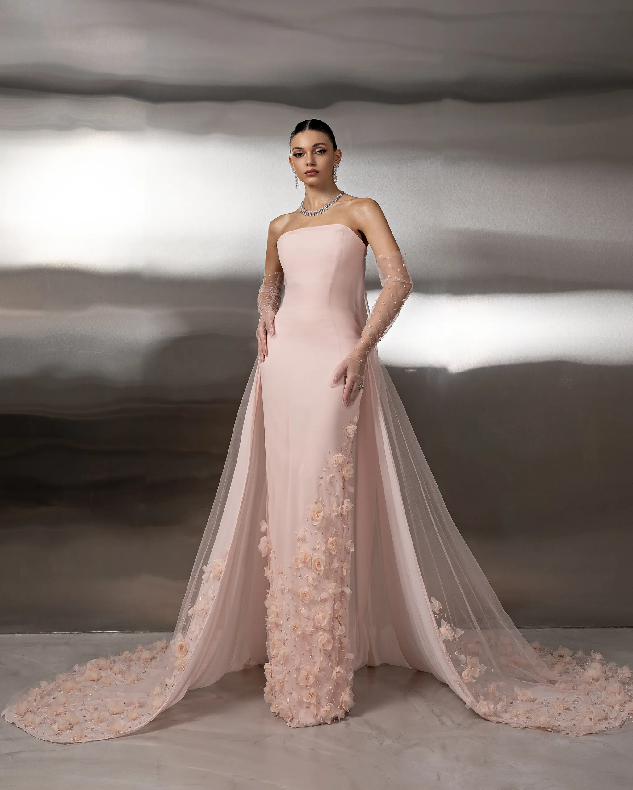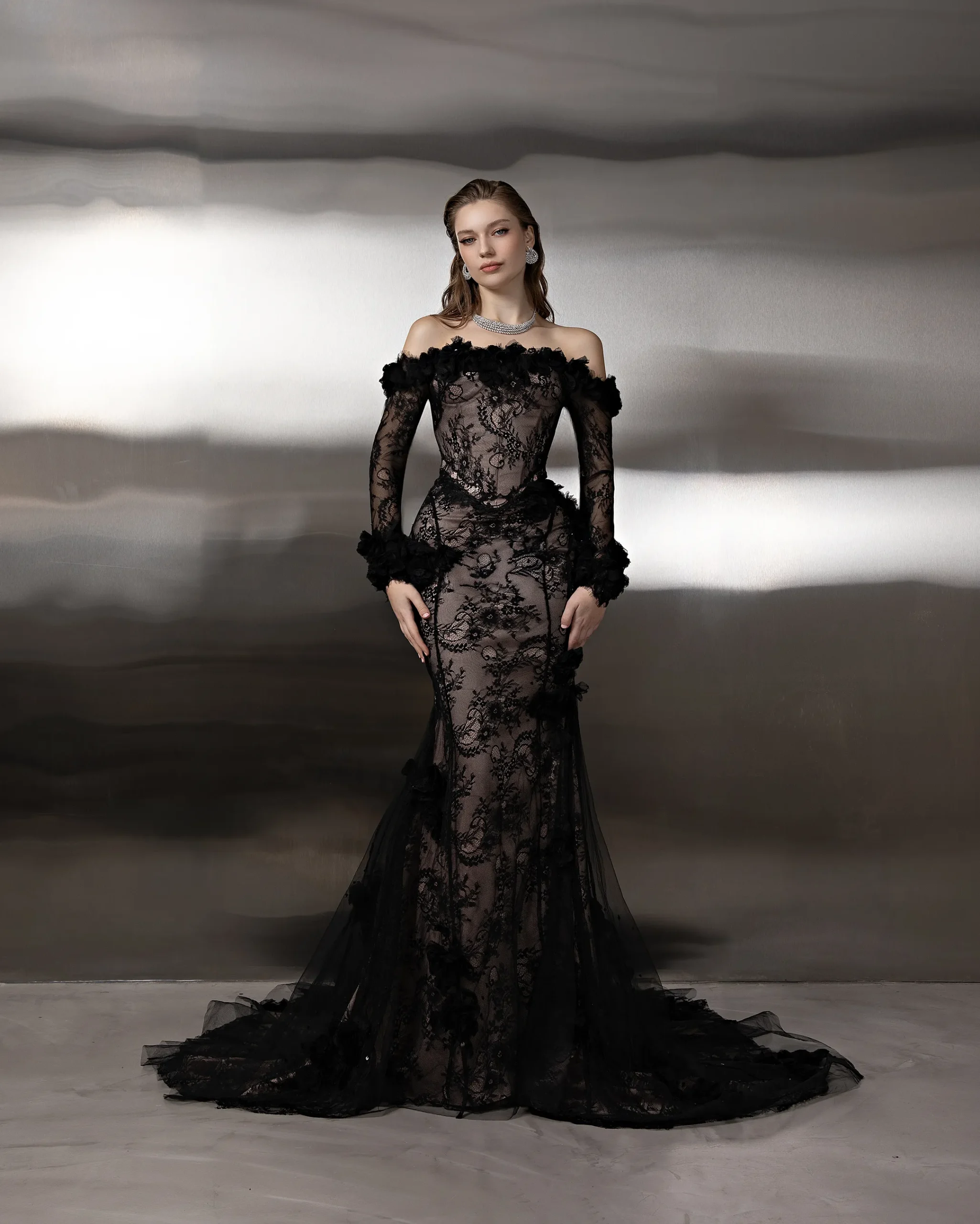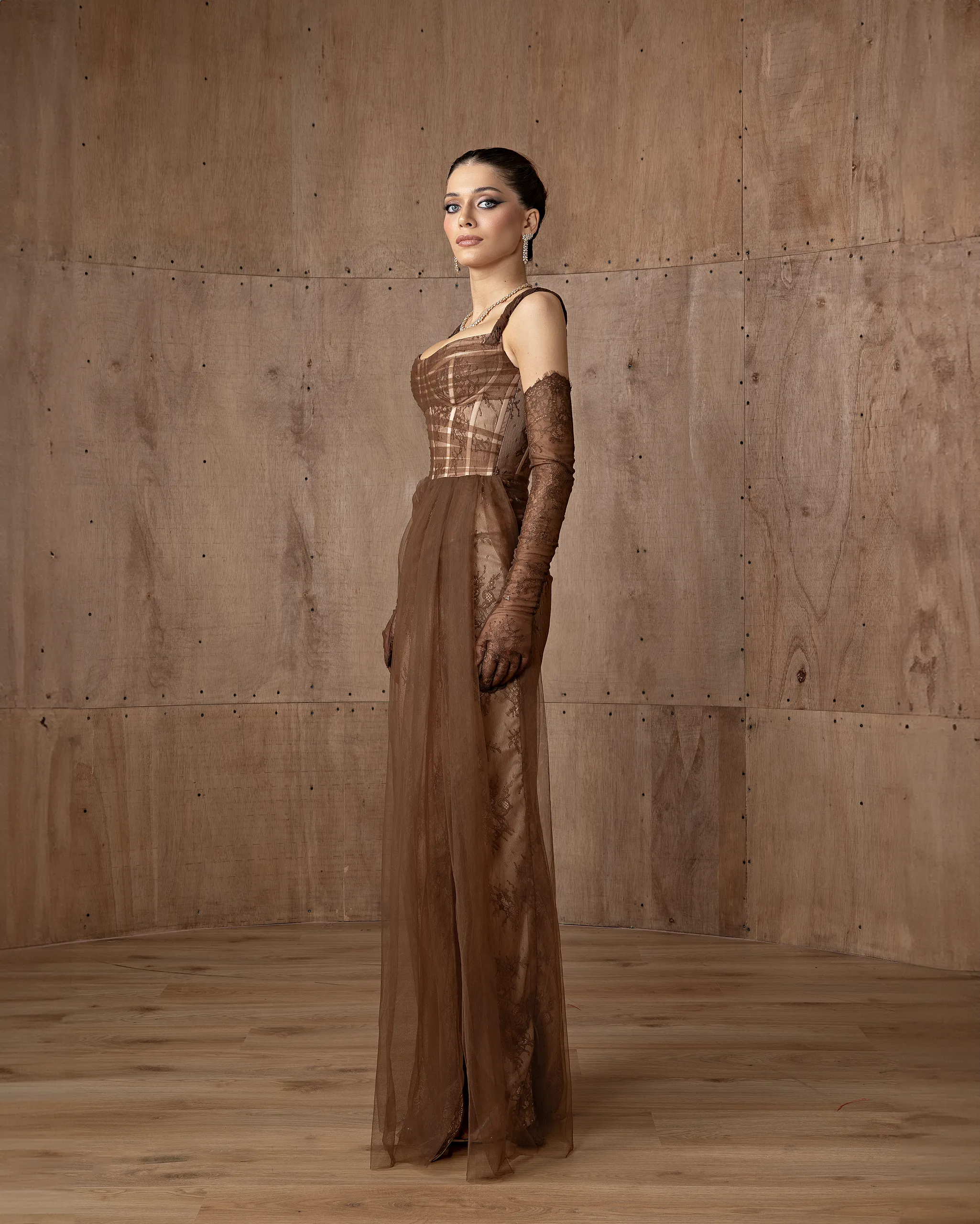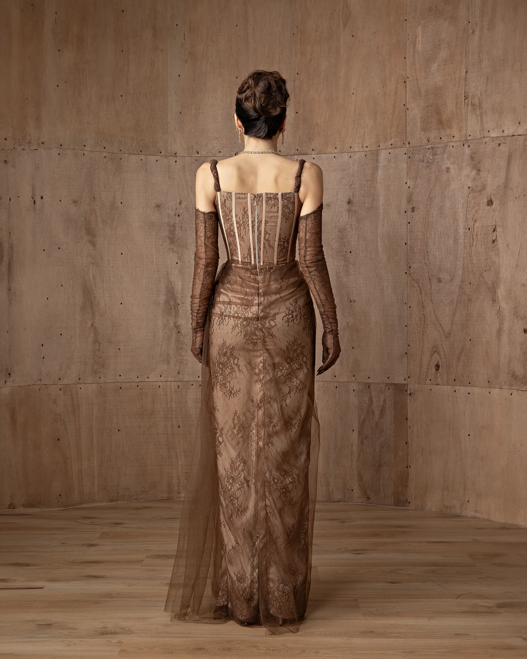 This monochromatic gown features a structured corset bodice layered over a lace column skirt, ethereal tulle overlay adds volume to the hip, with lace opera gloves. This dress is custom made by order to ensure a perfect fit.