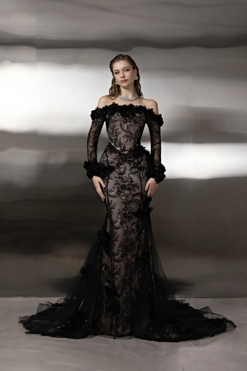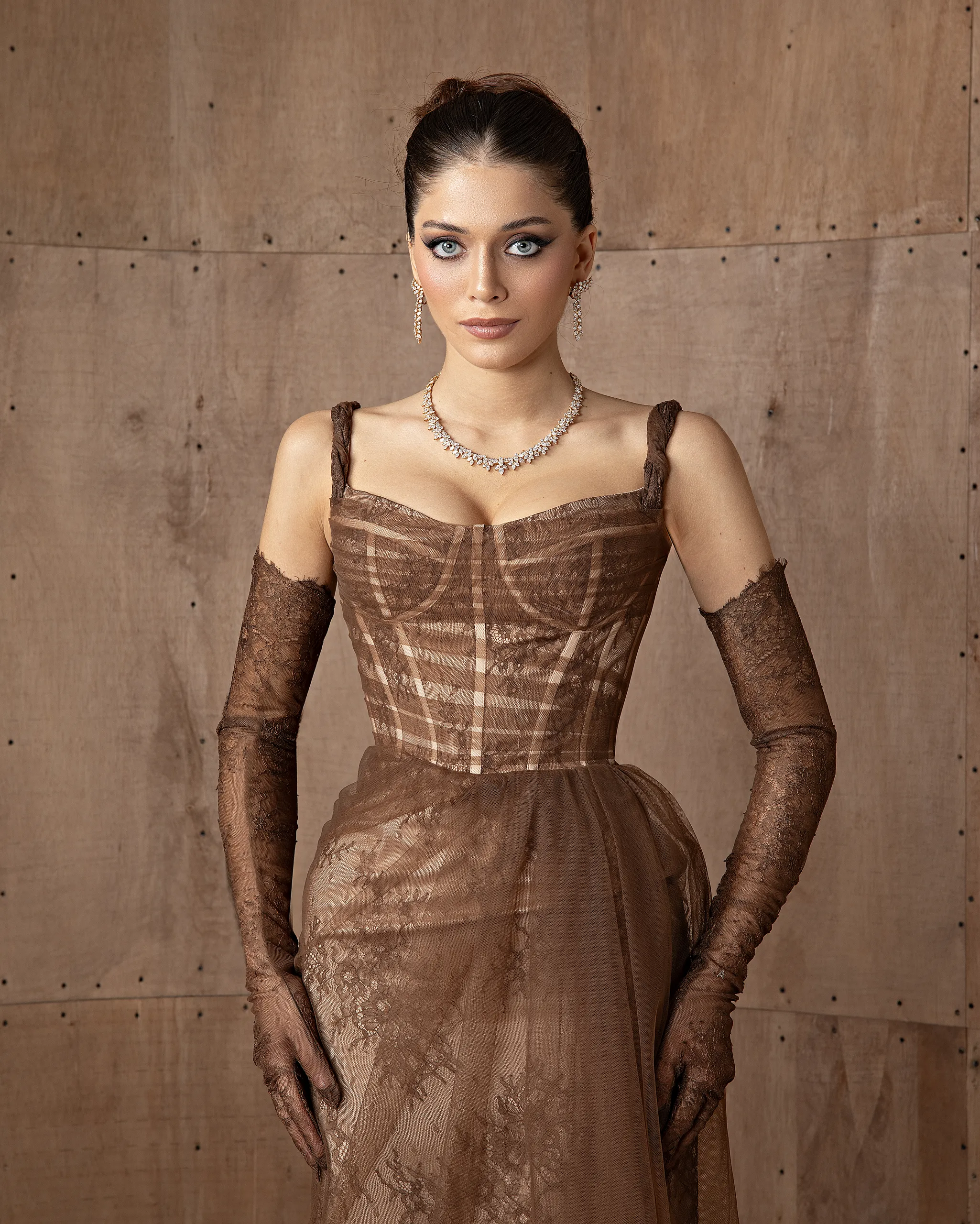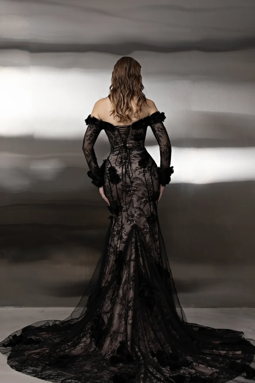 This monochromatic gown features a structured corset bodice layered over a lace column skirt, ethereal tulle overlay adds volume to the hip, with lace opera gloves. This dress is custom made by order to ensure a perfect fit.