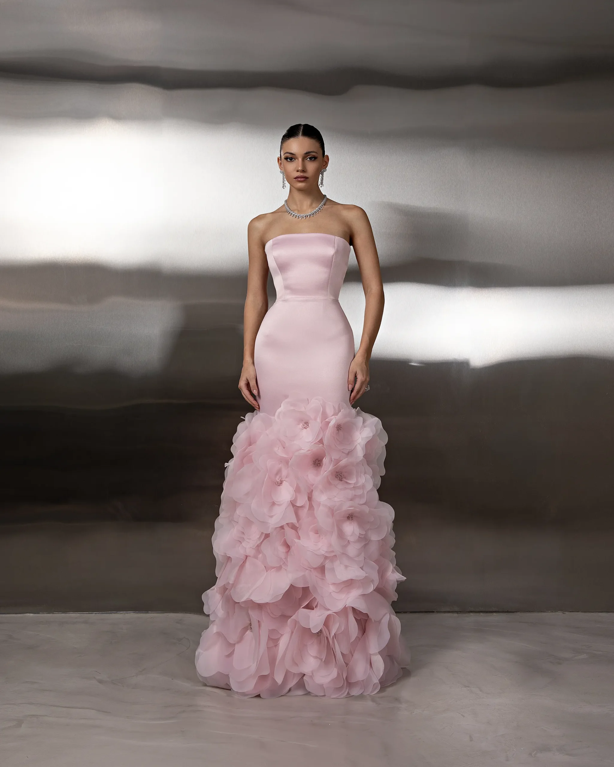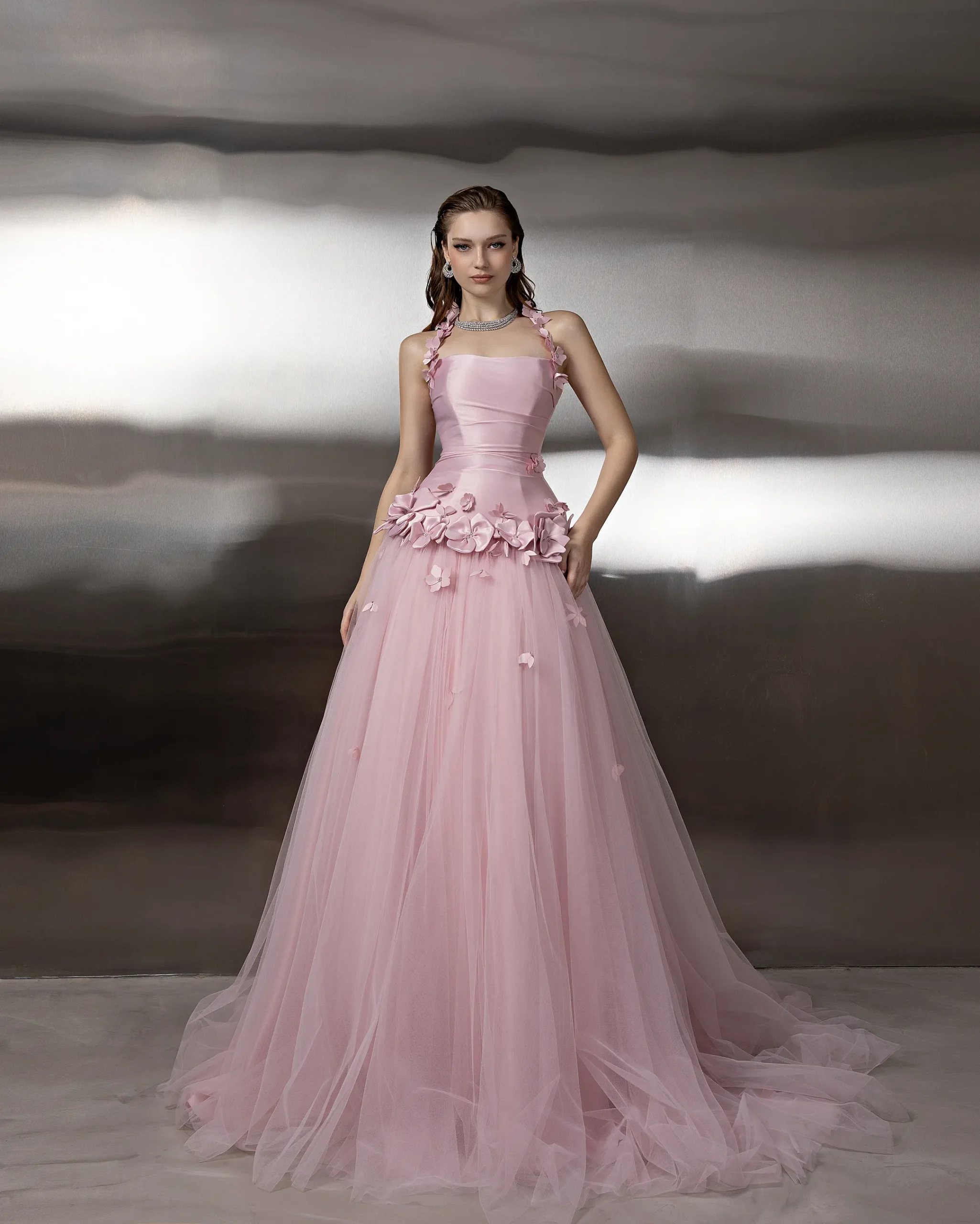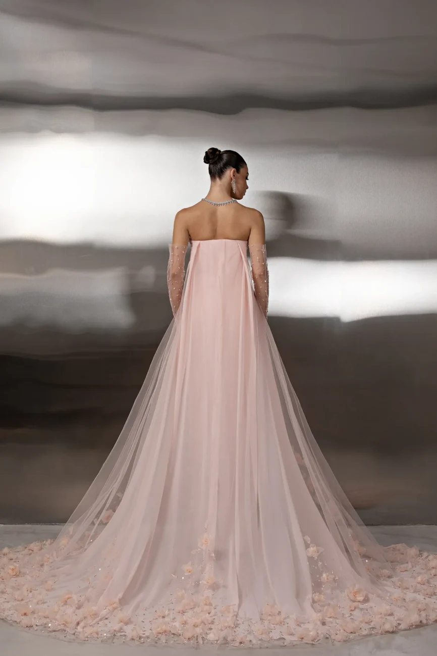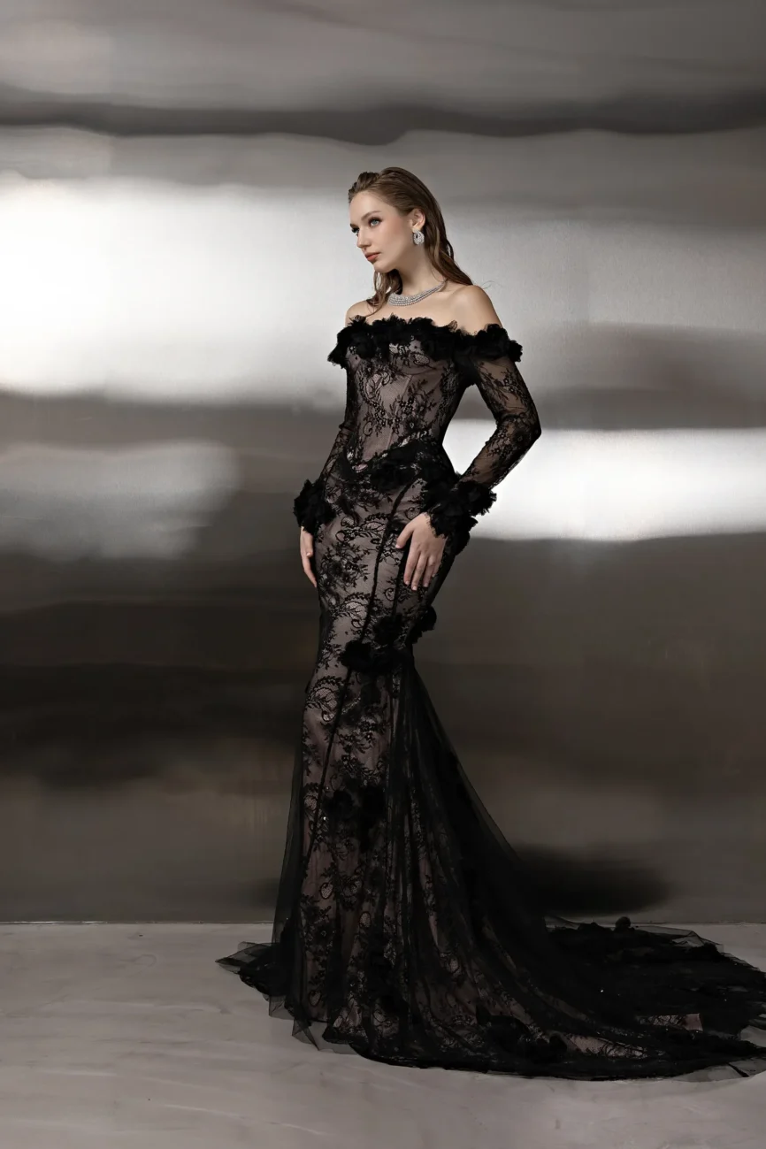 This monochromatic gown features a structured corset bodice layered over a lace column skirt, ethereal tulle overlay adds volume to the hip, with lace opera gloves. This dress is custom made by order to ensure a perfect fit.