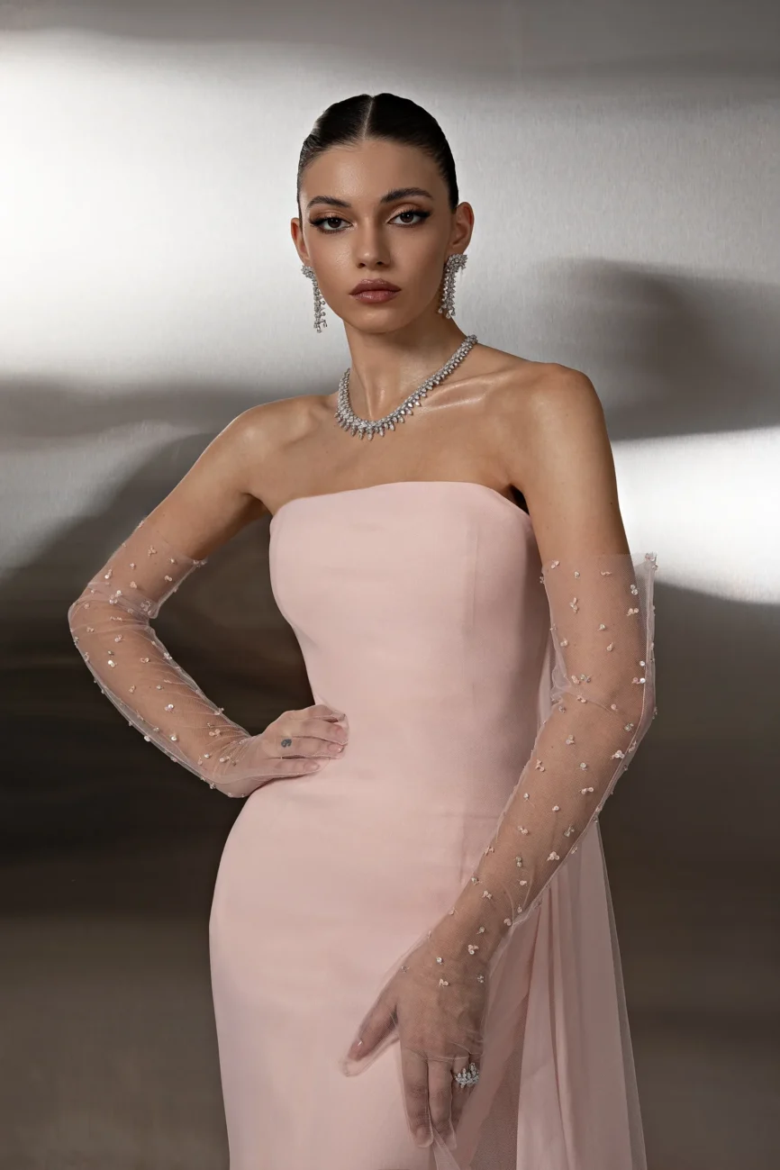 Dress in lace and tulle linned with crepe. Gloves in lace.