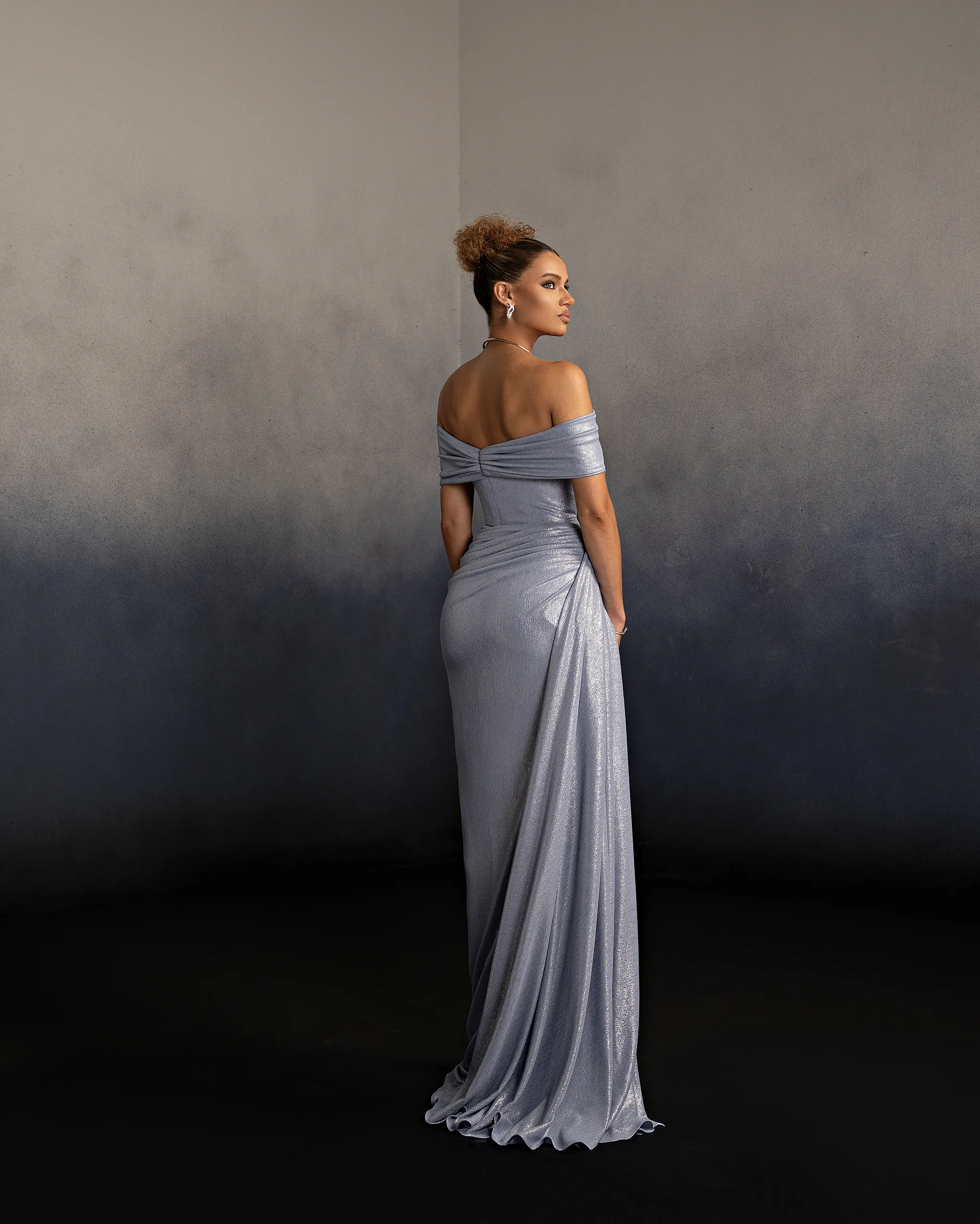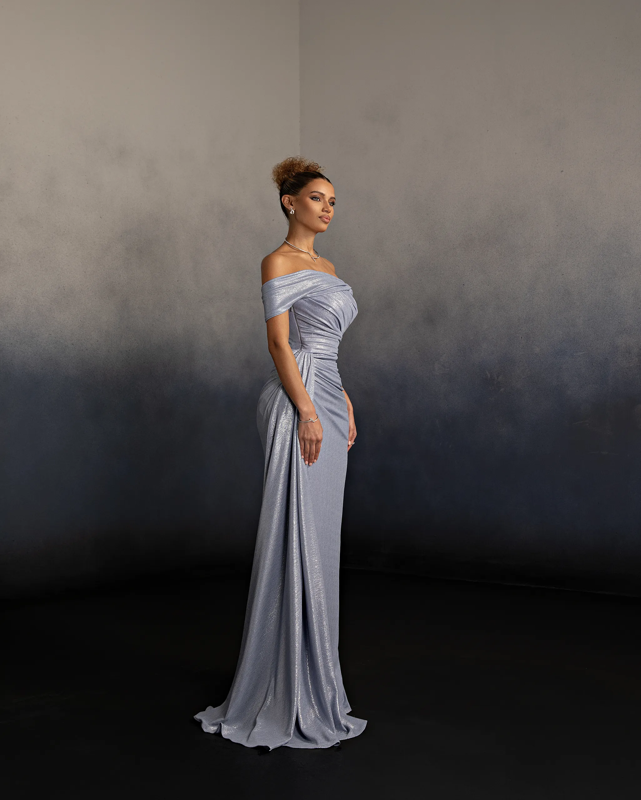 A floor-length, fitted gown featuring an off-shoulder neckline, a finely draped bodice, and skirt with draping through the waist and hips. This dress is custom made by order to ensure a perfect fit.