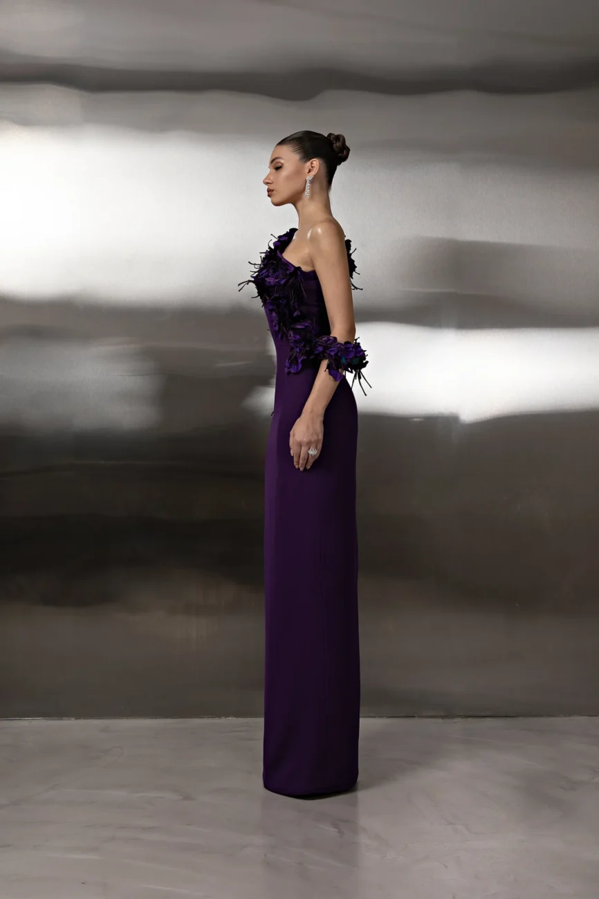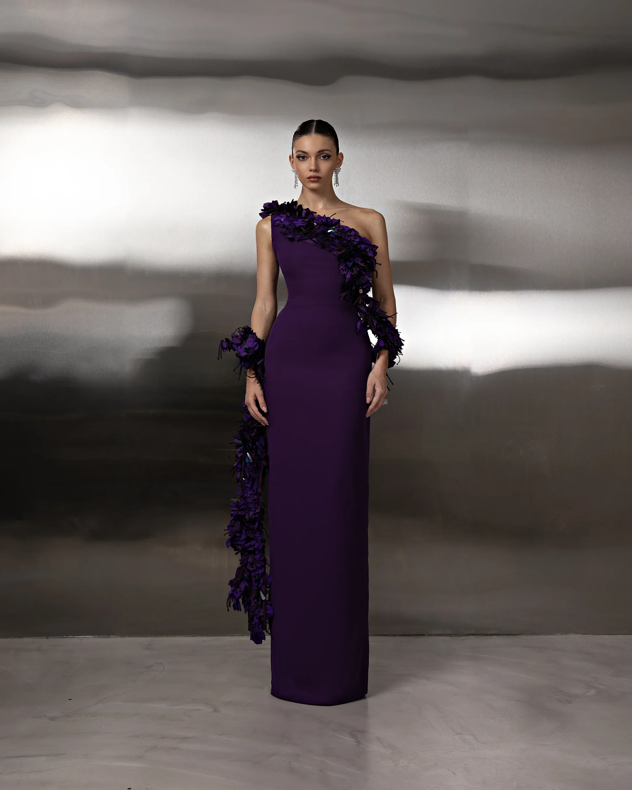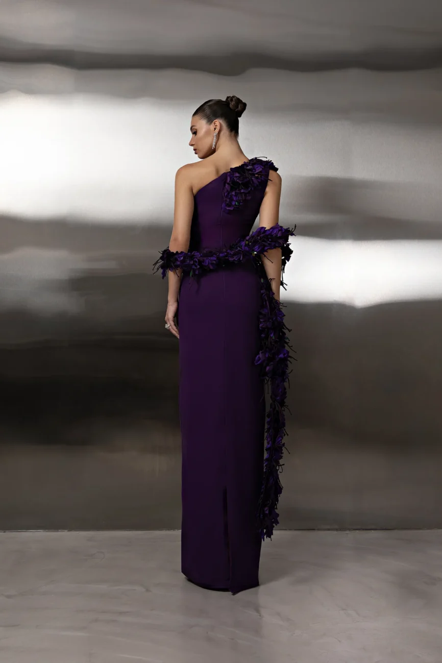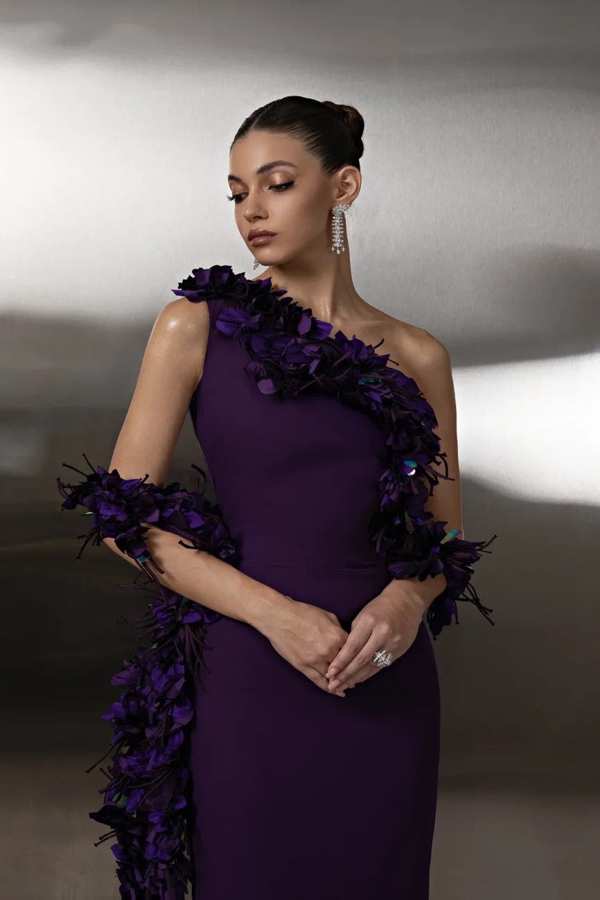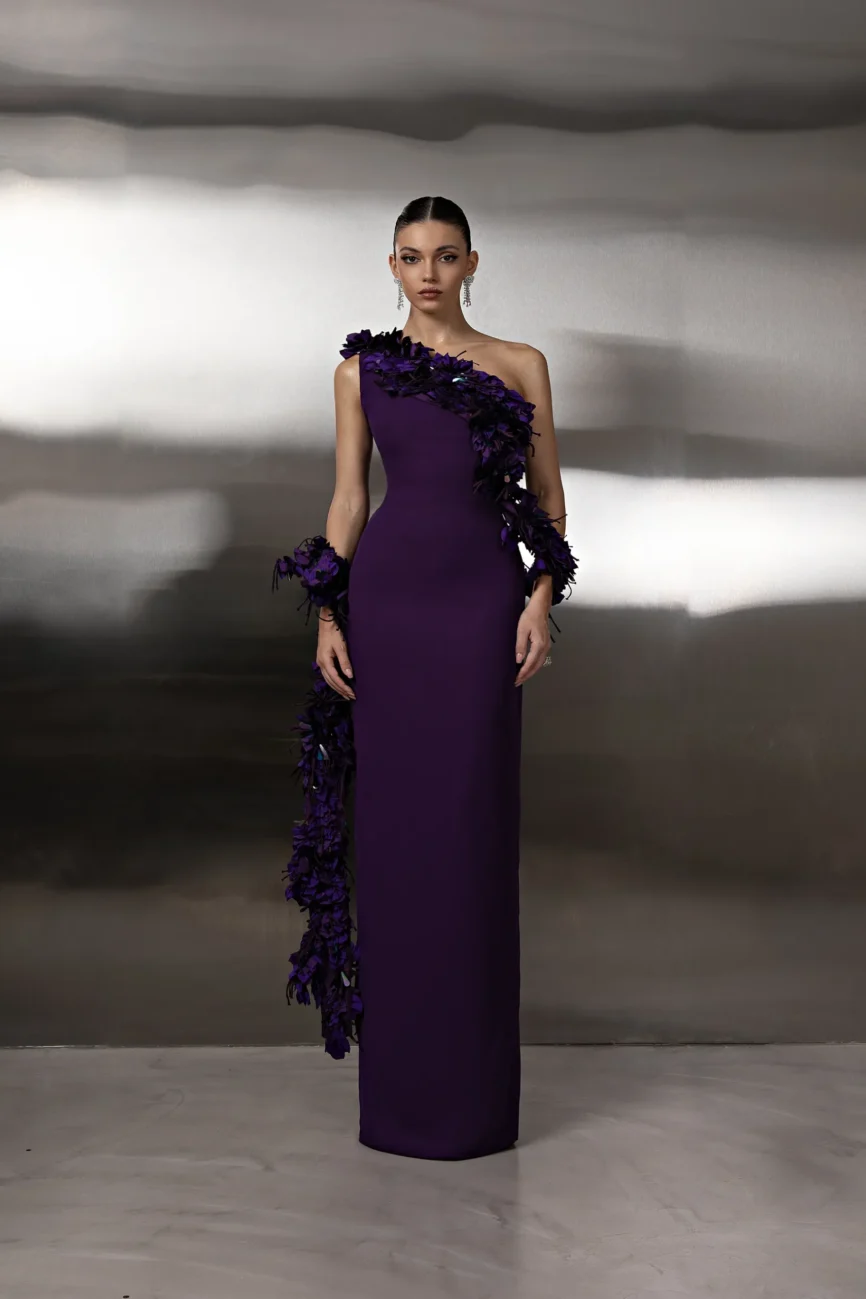 A shimmering emerald green metallic gown featuring a sculpted off-the-shoulder neckline, asymmetric straps, and intricate ruching. This dress is custom made by order to ensure a perfect fit.