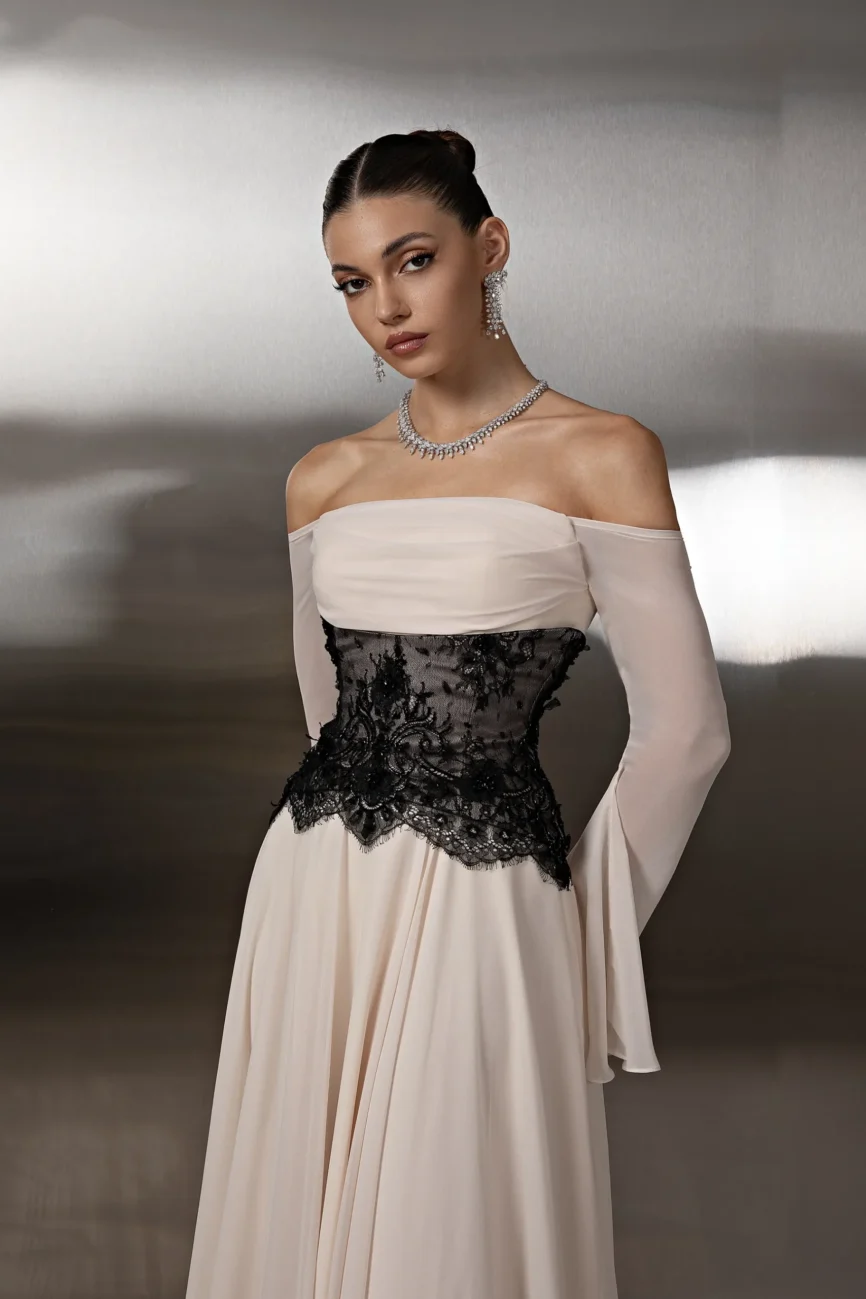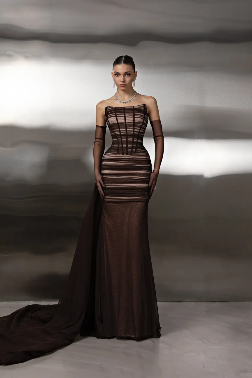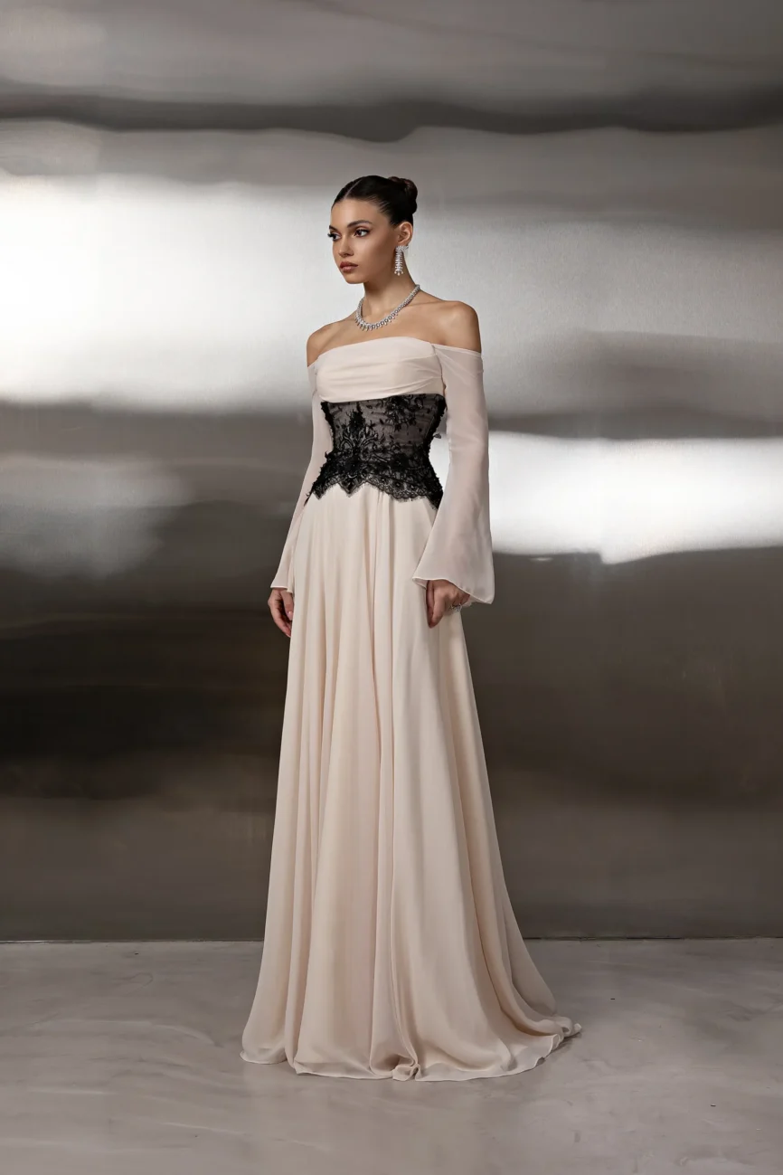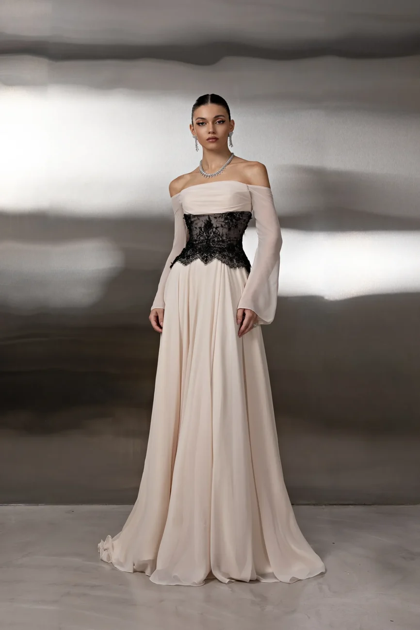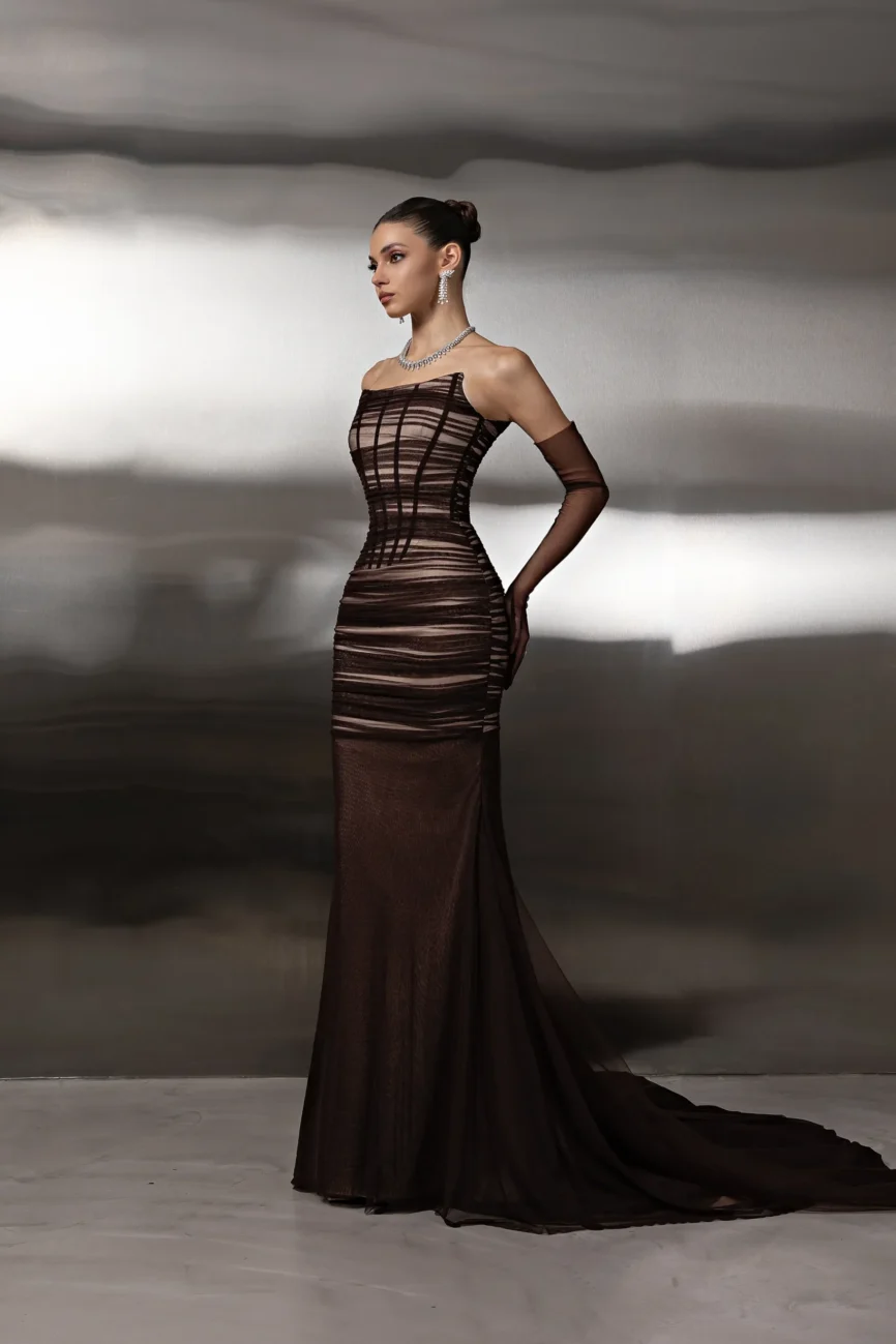 A shimmering emerald green metallic gown featuring a sculpted off-the-shoulder neckline, asymmetric straps, and intricate ruching. This dress is custom made by order to ensure a perfect fit.