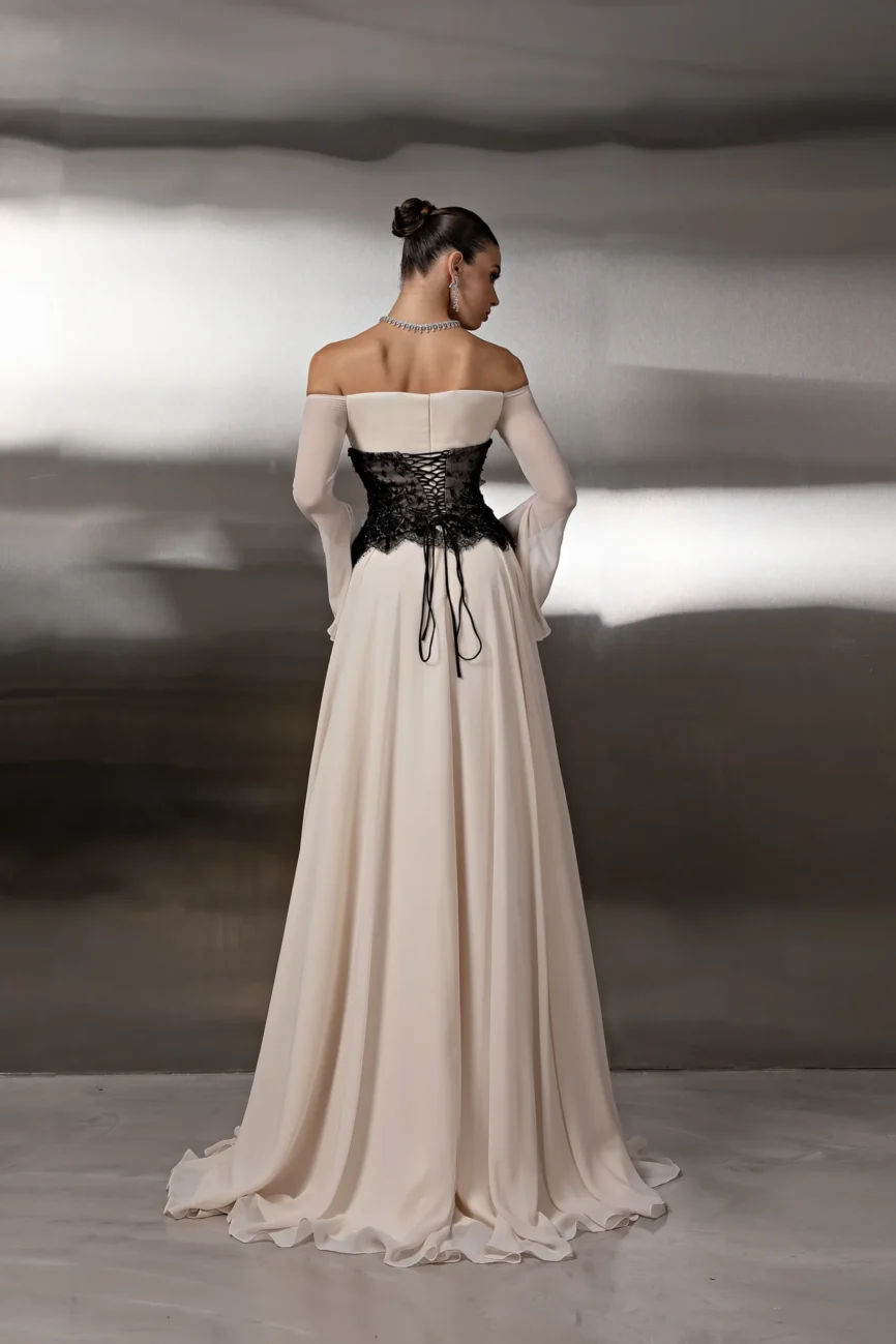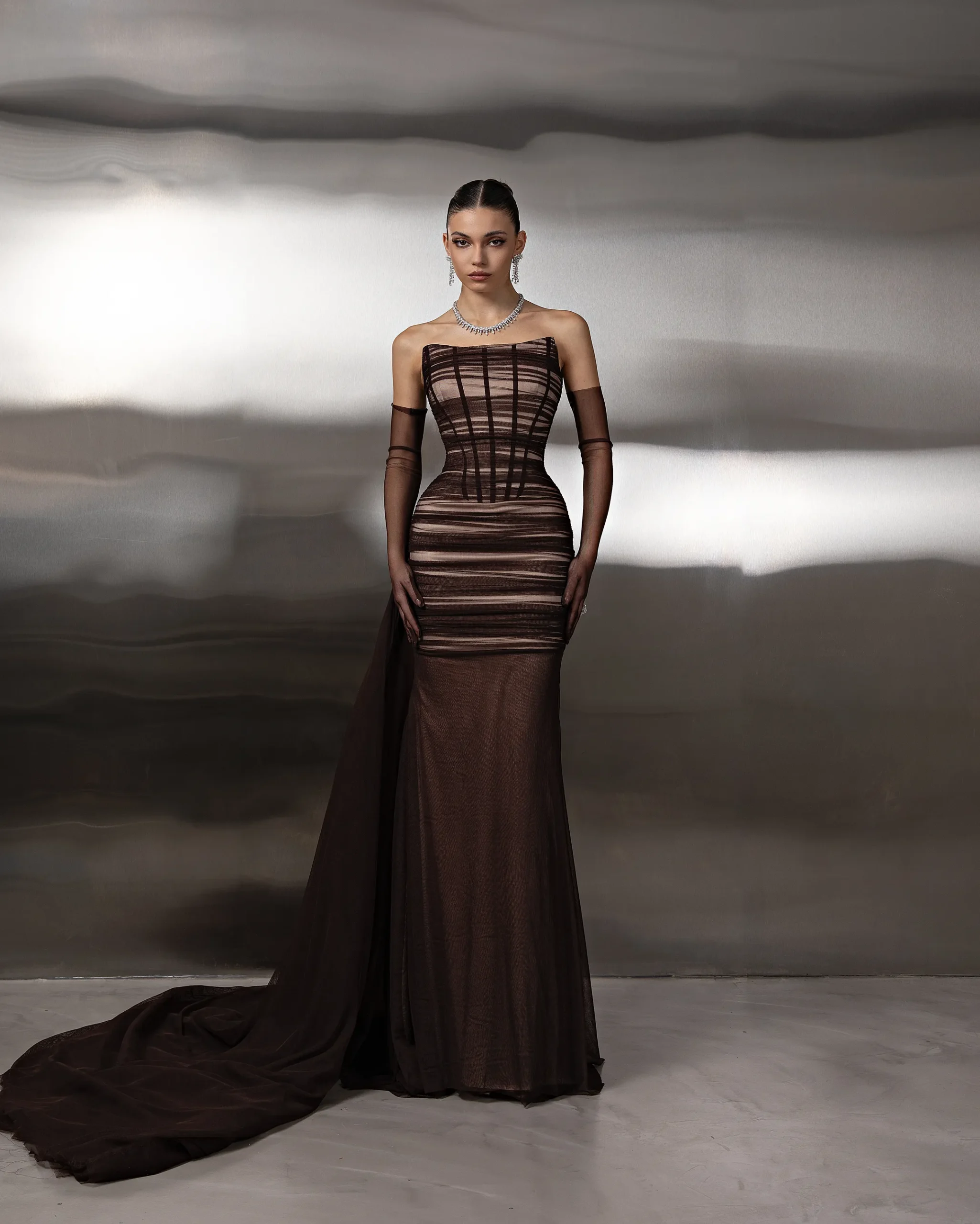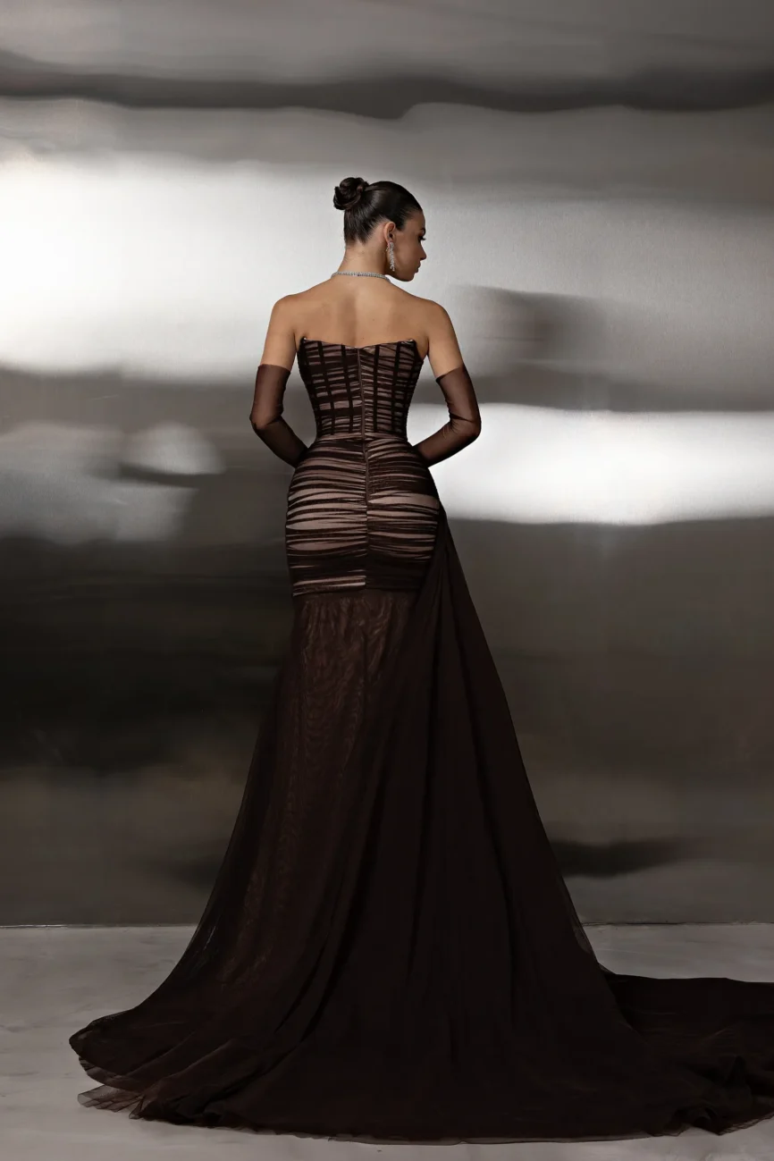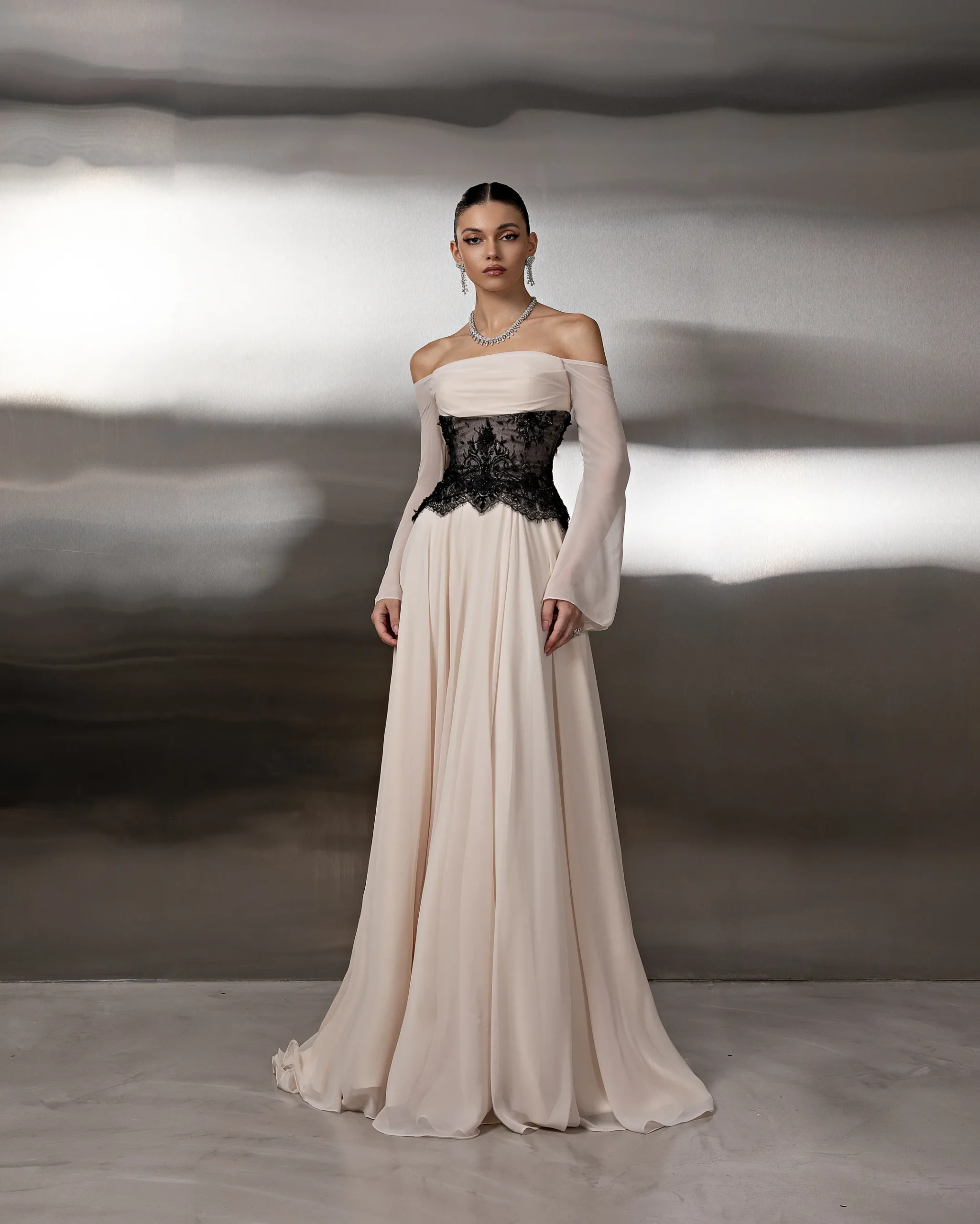 A shimmering emerald green metallic gown featuring a sculpted off-the-shoulder neckline, asymmetric straps, and intricate ruching. This dress is custom made by order to ensure a perfect fit.