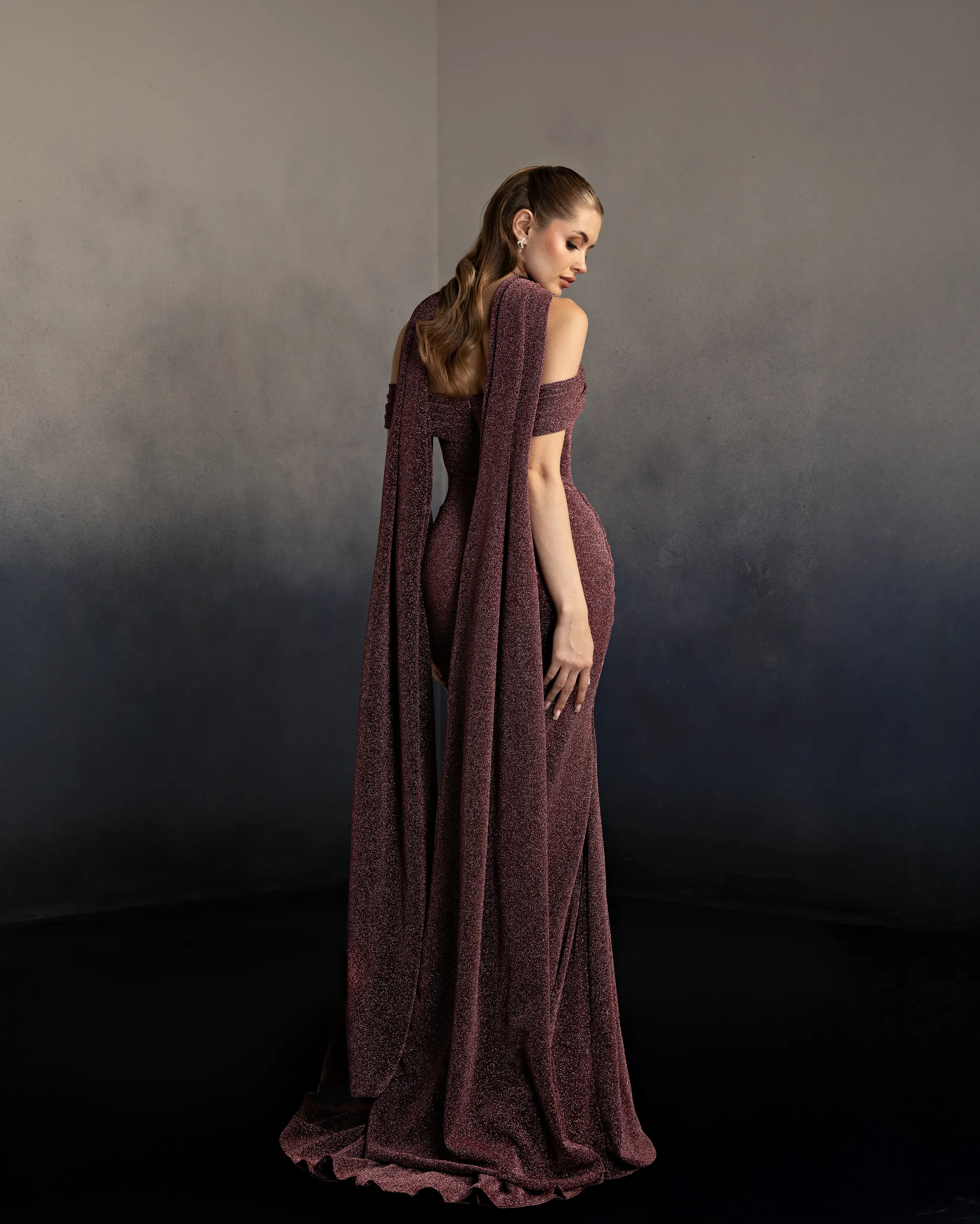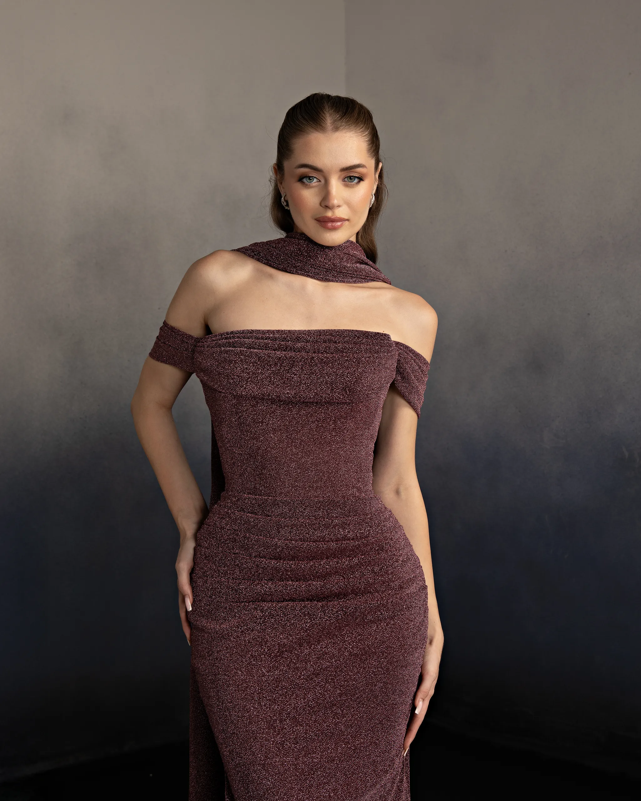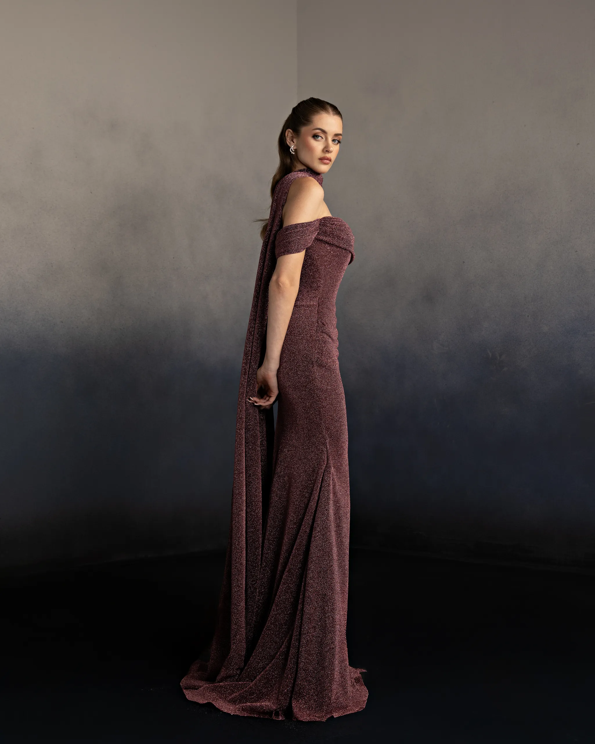 A fitted off-shoulder gown with soft draping across the bodice. Designed in a sleek floor-length silhouette with a slight flare at the hem and a matching neck scarf. This dress is custom made by order to ensure a perfect fit.
