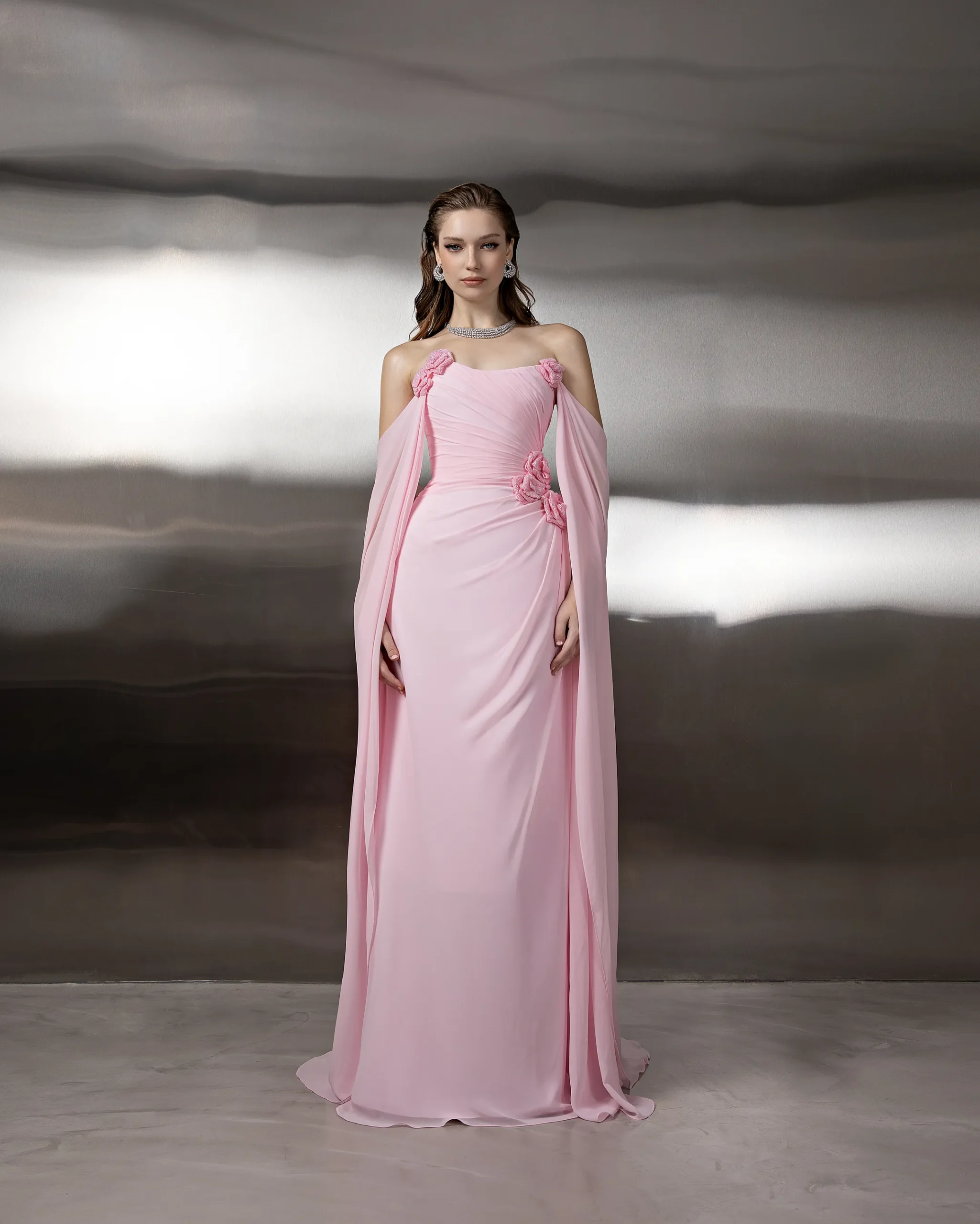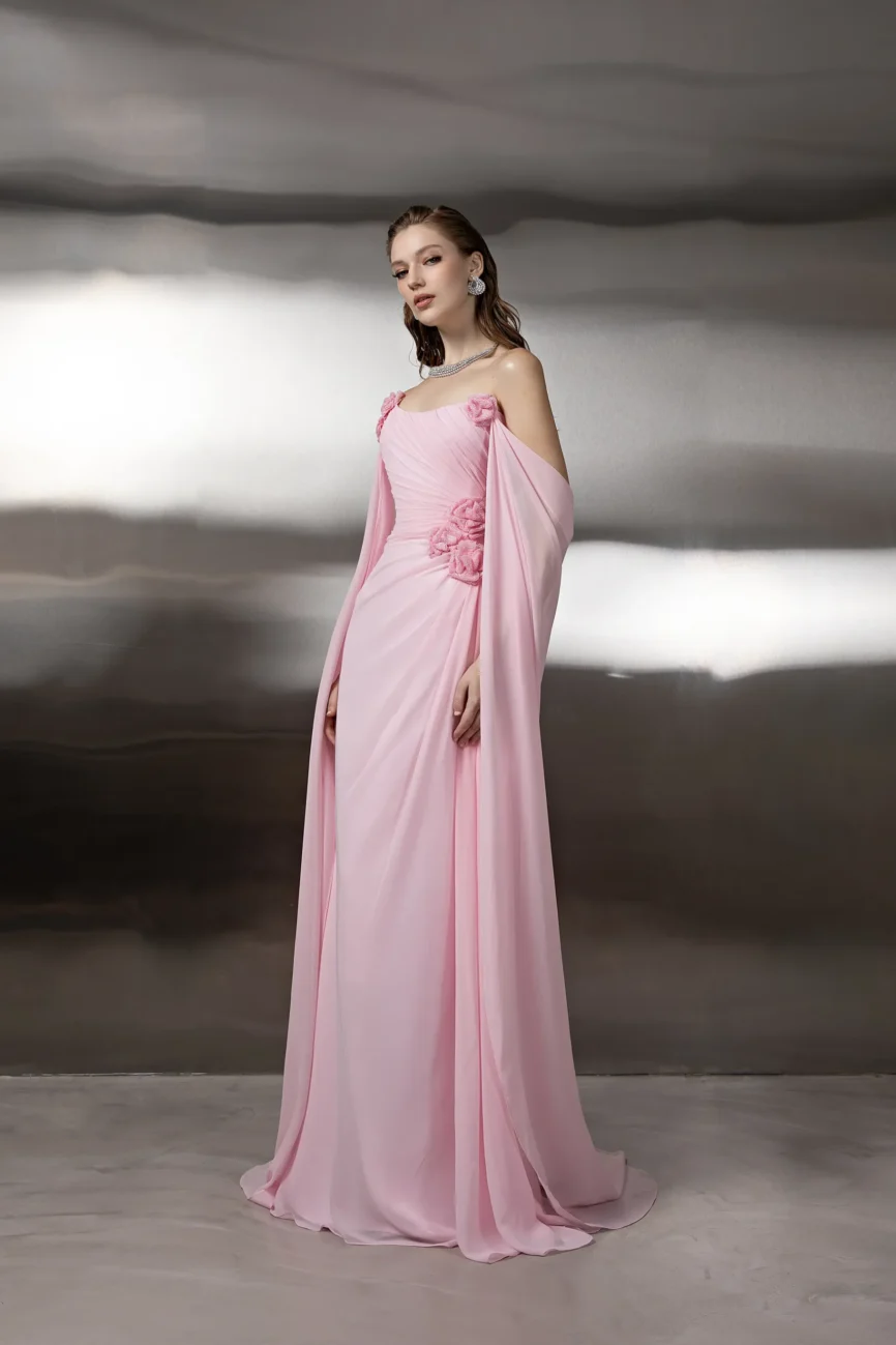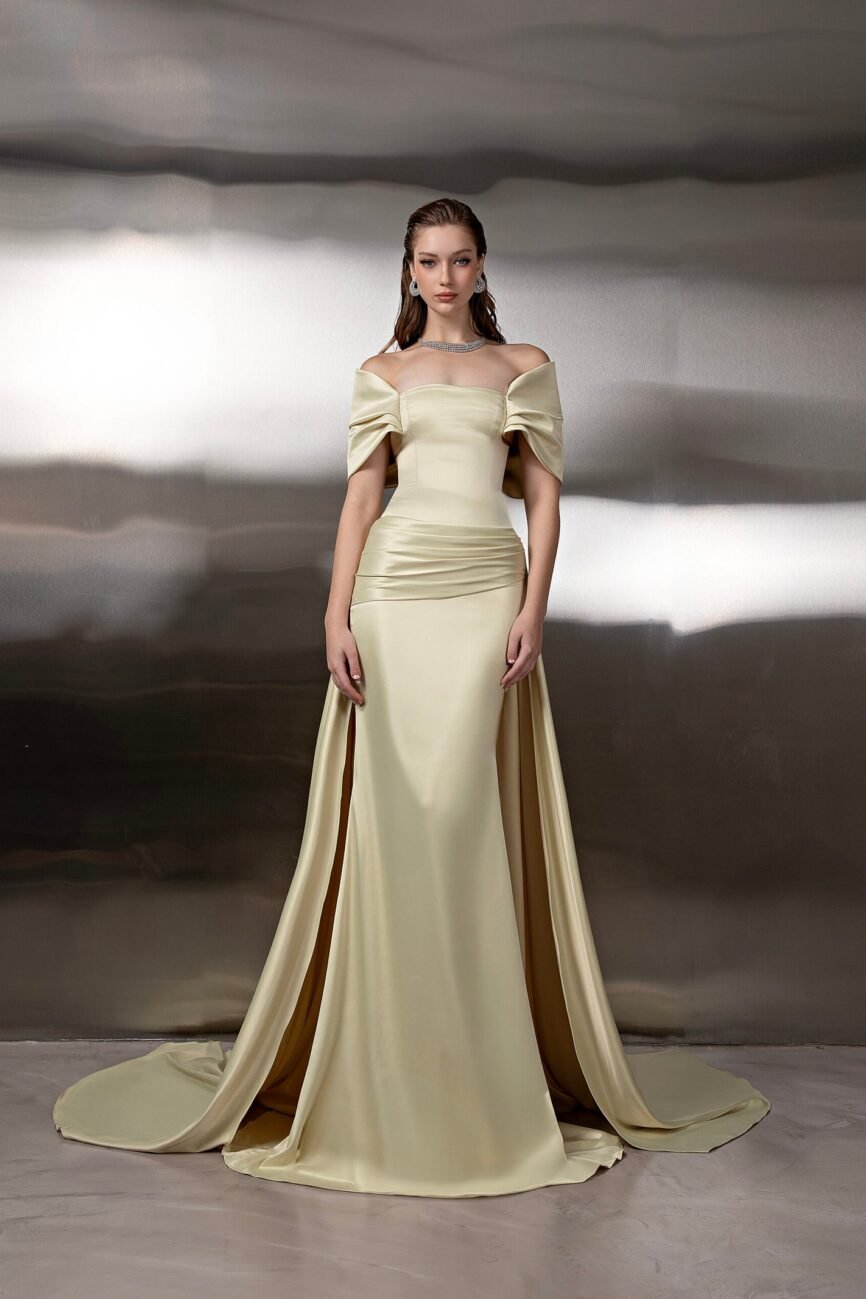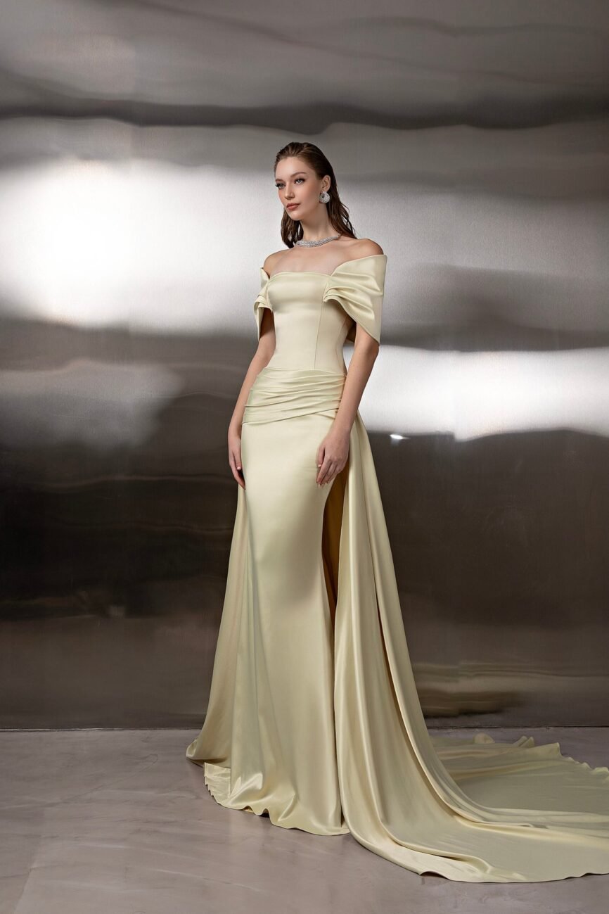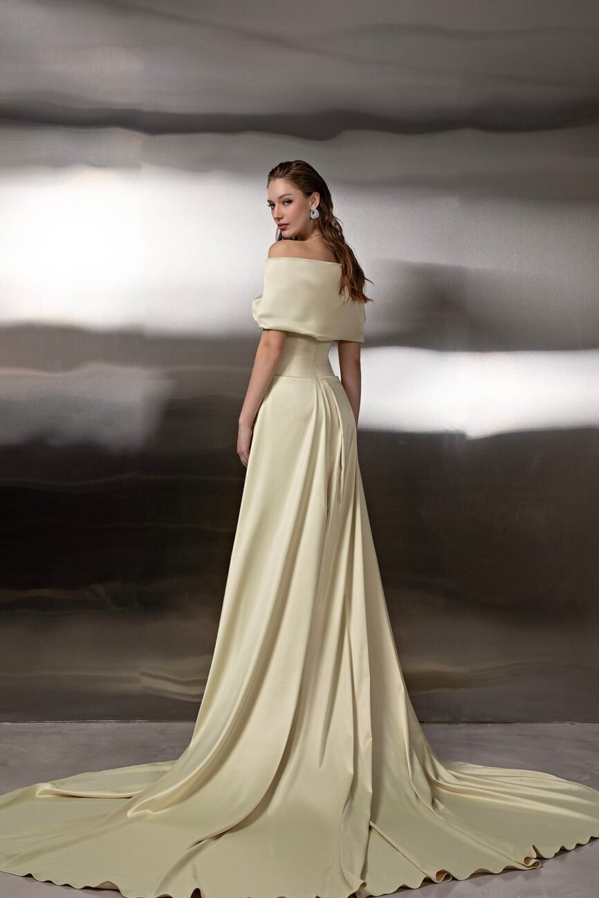This pale yellow chiffon gown features a pleated halter neckline with off-the-shoulder draped sleeves,with pleated skirt. This dress is custom made by order to ensure a perfect fit.