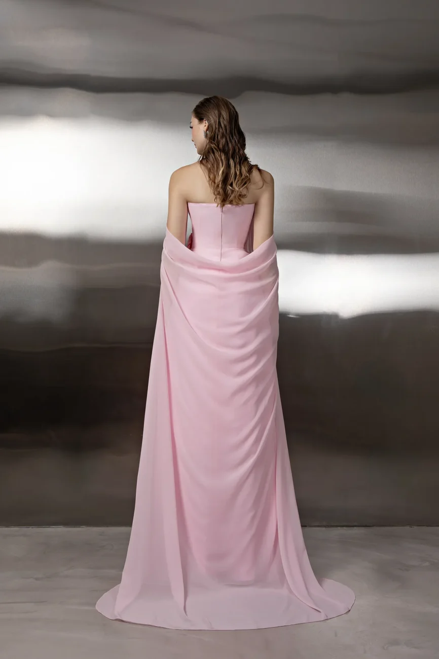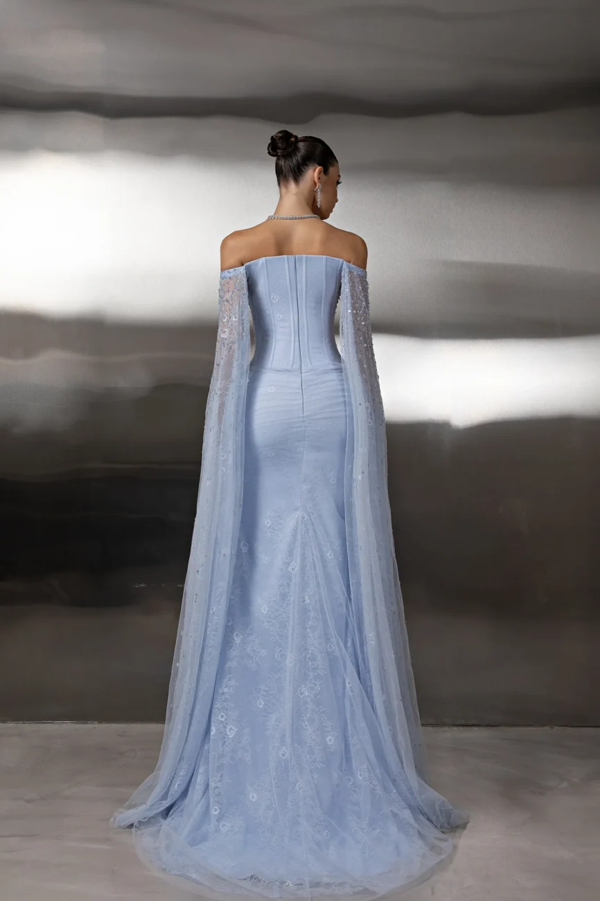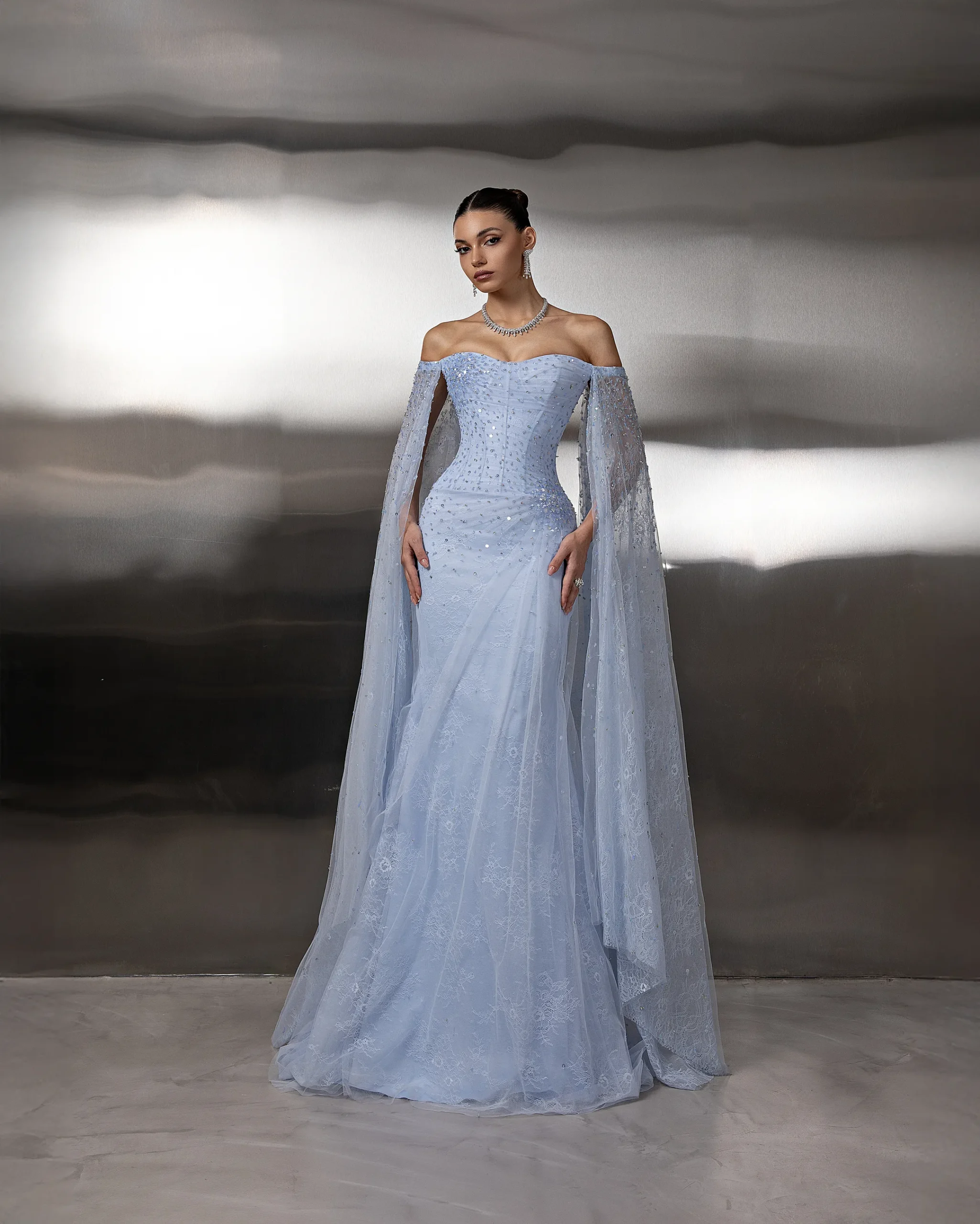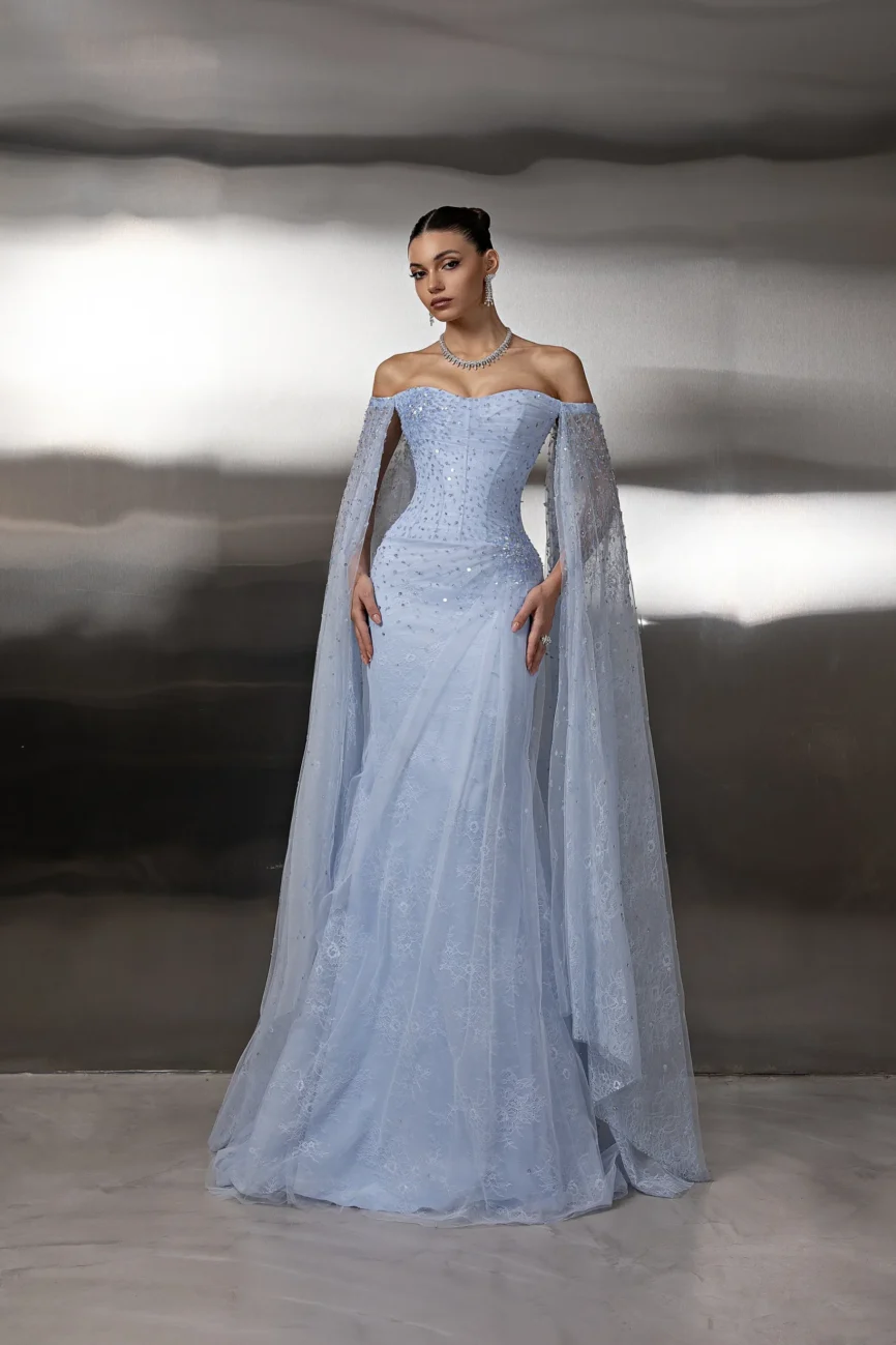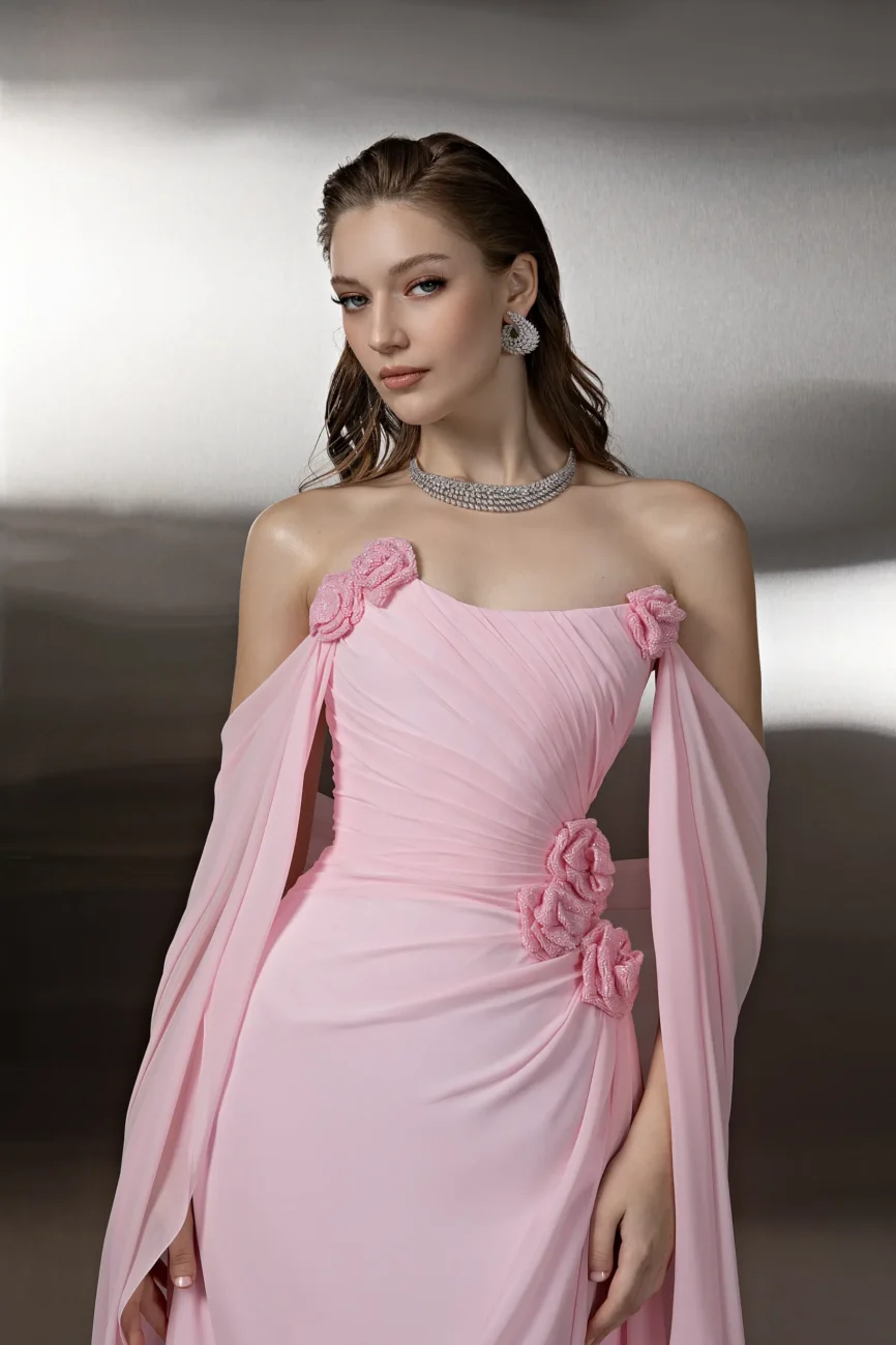 This pale yellow chiffon gown features a pleated halter neckline with off-the-shoulder draped sleeves,with pleated skirt. This dress is custom made by order to ensure a perfect fit.