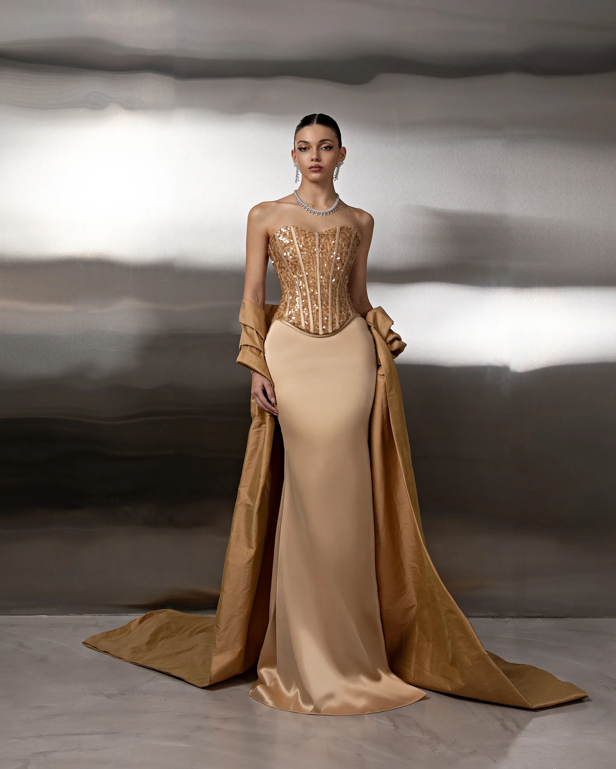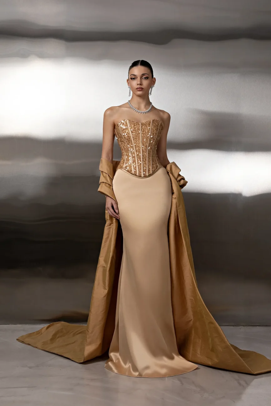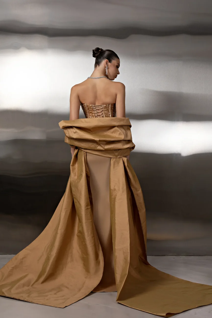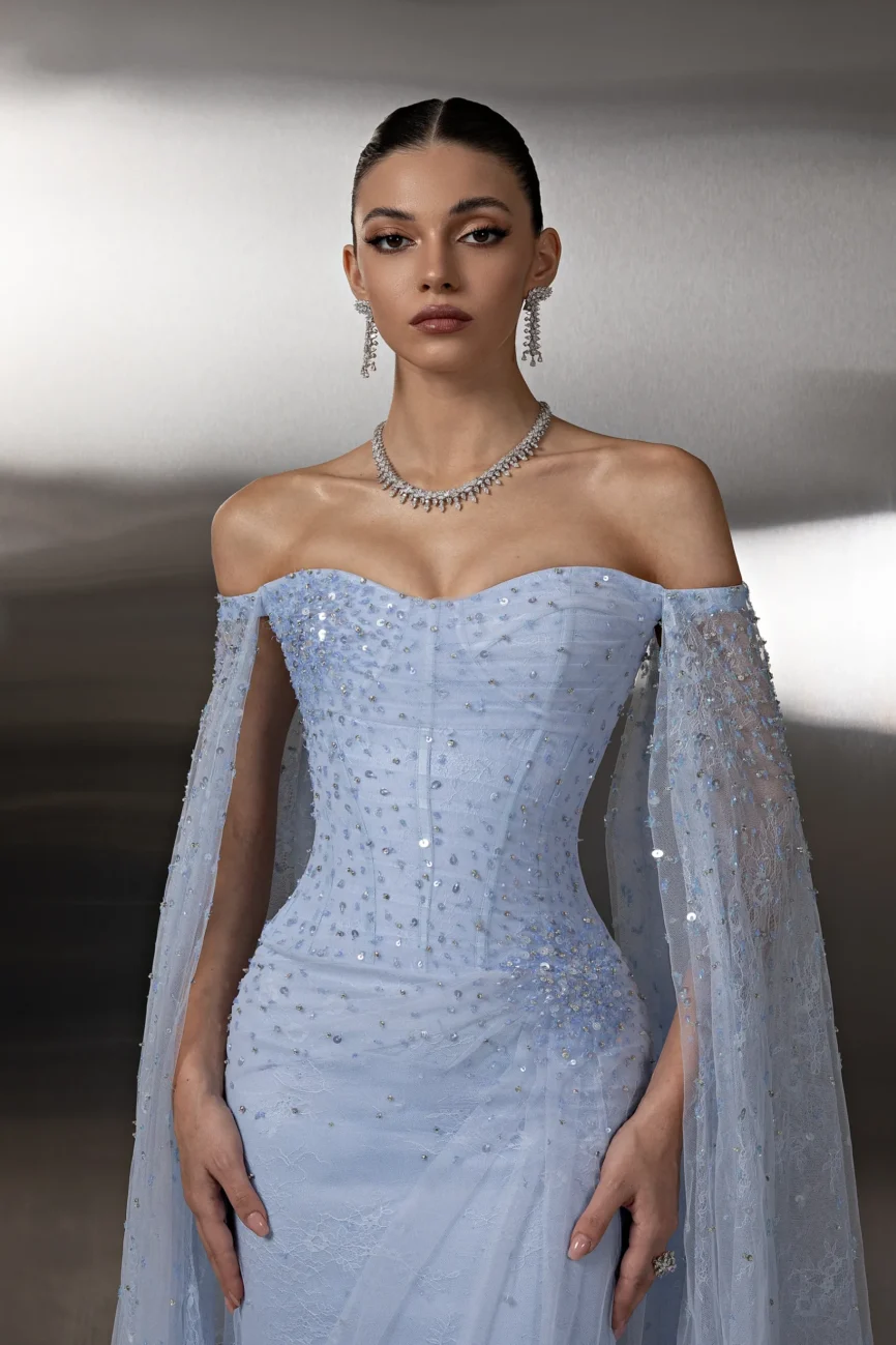 This pale yellow chiffon gown features a pleated halter neckline with off-the-shoulder draped sleeves,with pleated skirt. This dress is custom made by order to ensure a perfect fit.