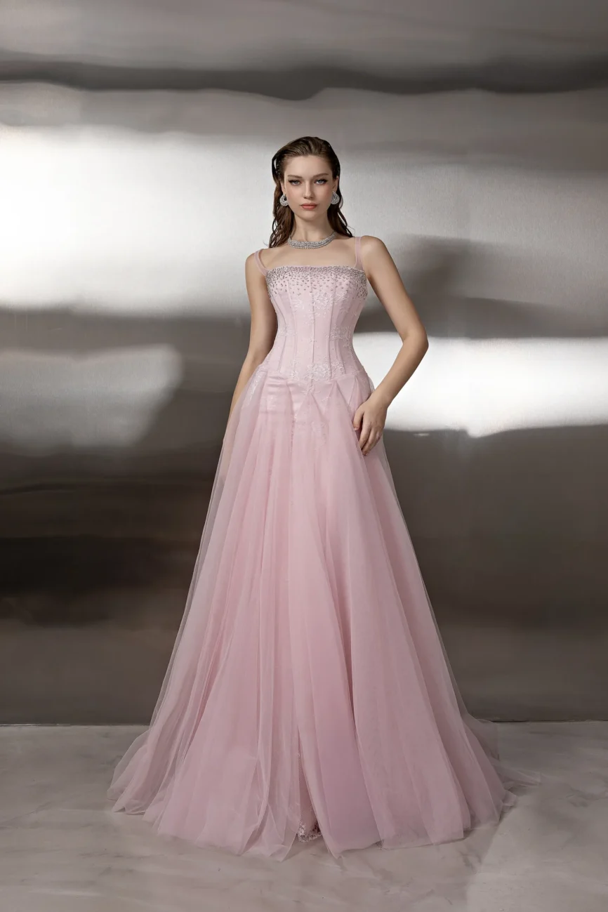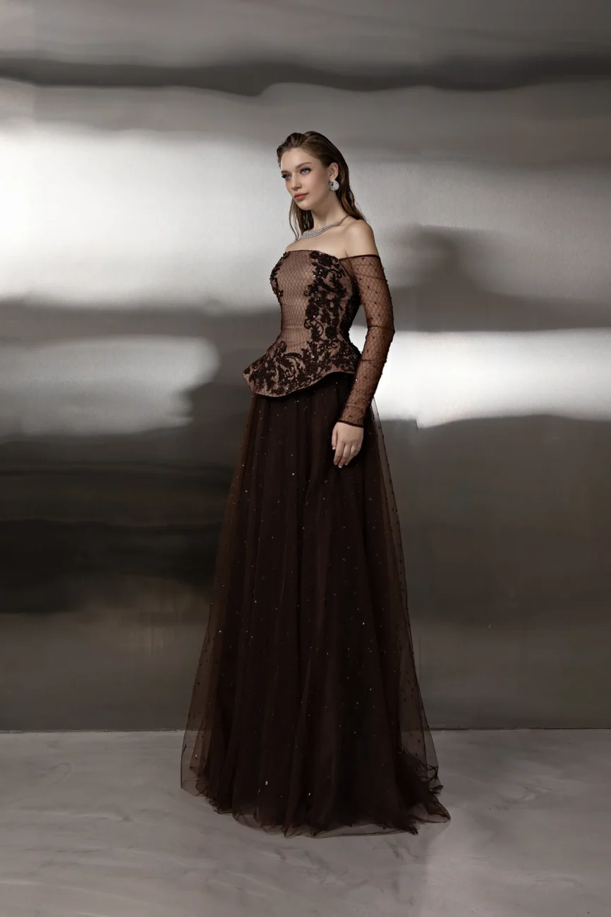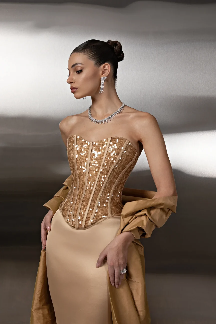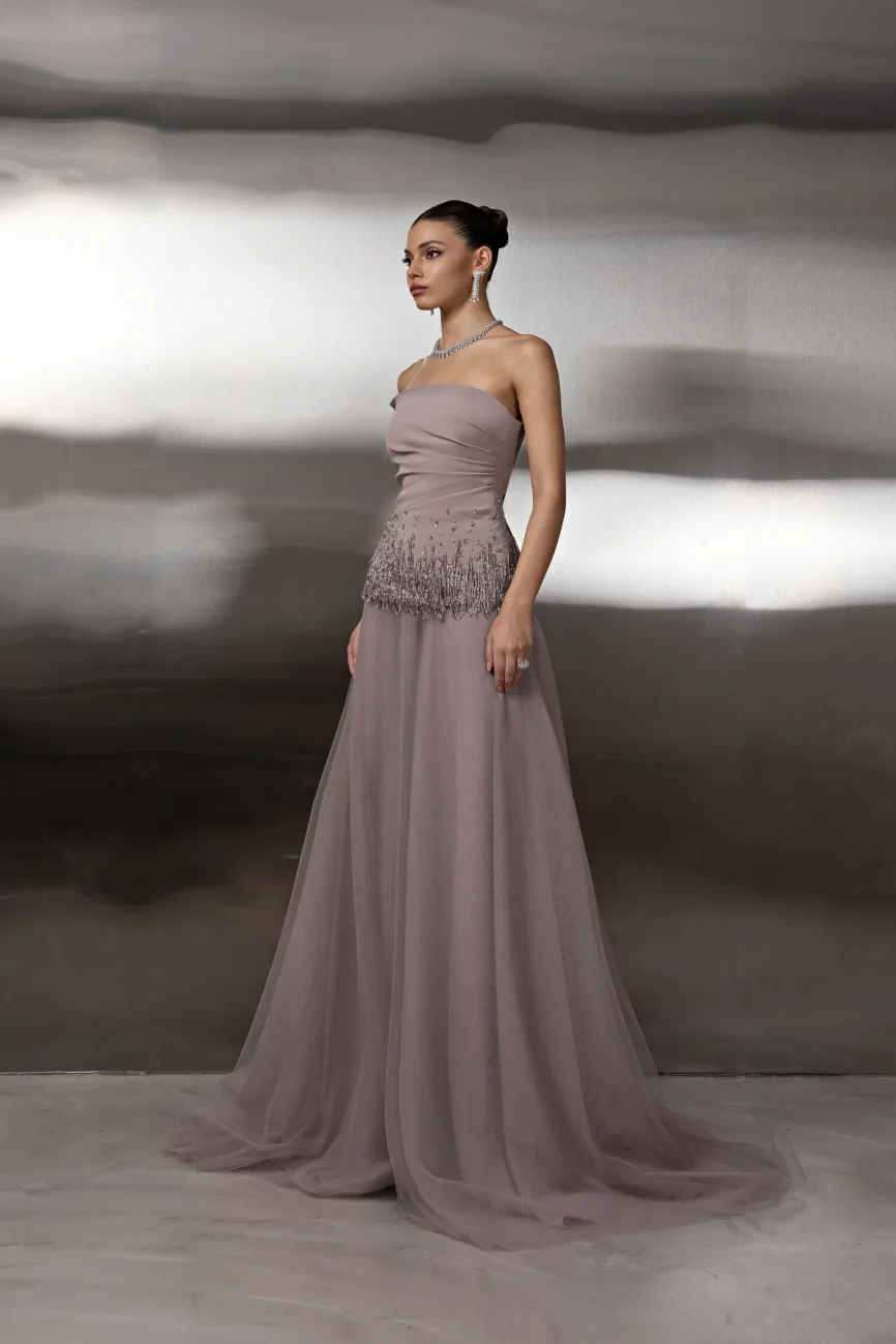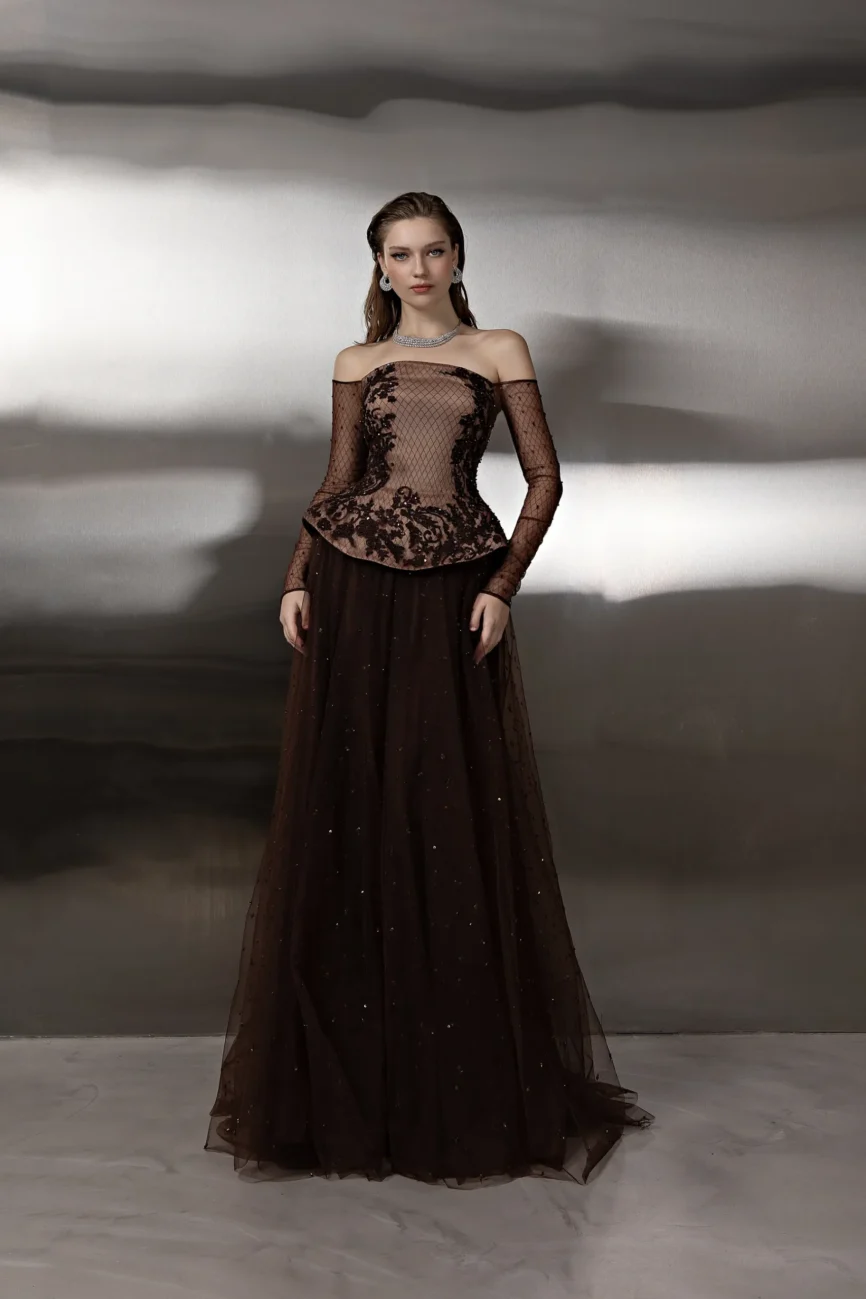 This pale yellow chiffon gown features a pleated halter neckline with off-the-shoulder draped sleeves,with pleated skirt. This dress is custom made by order to ensure a perfect fit.