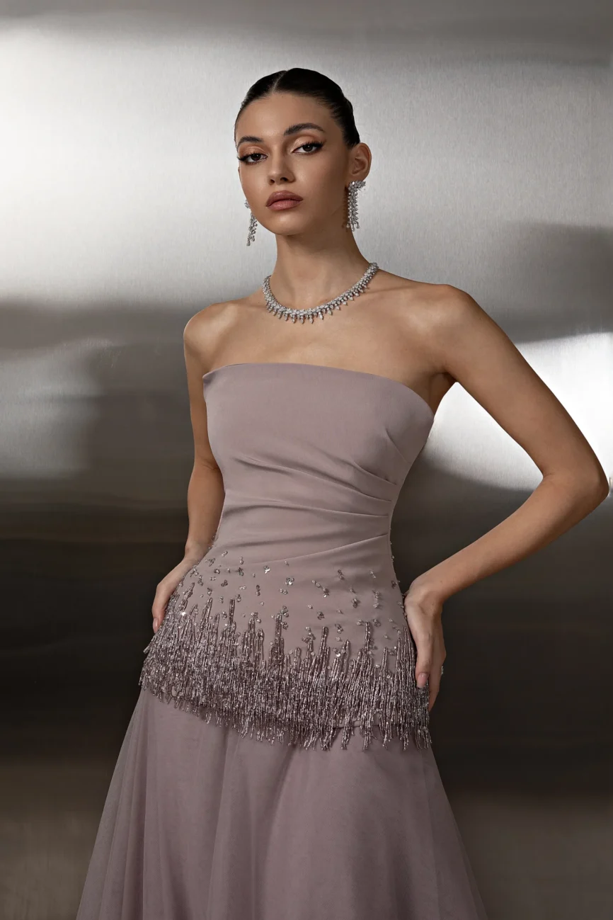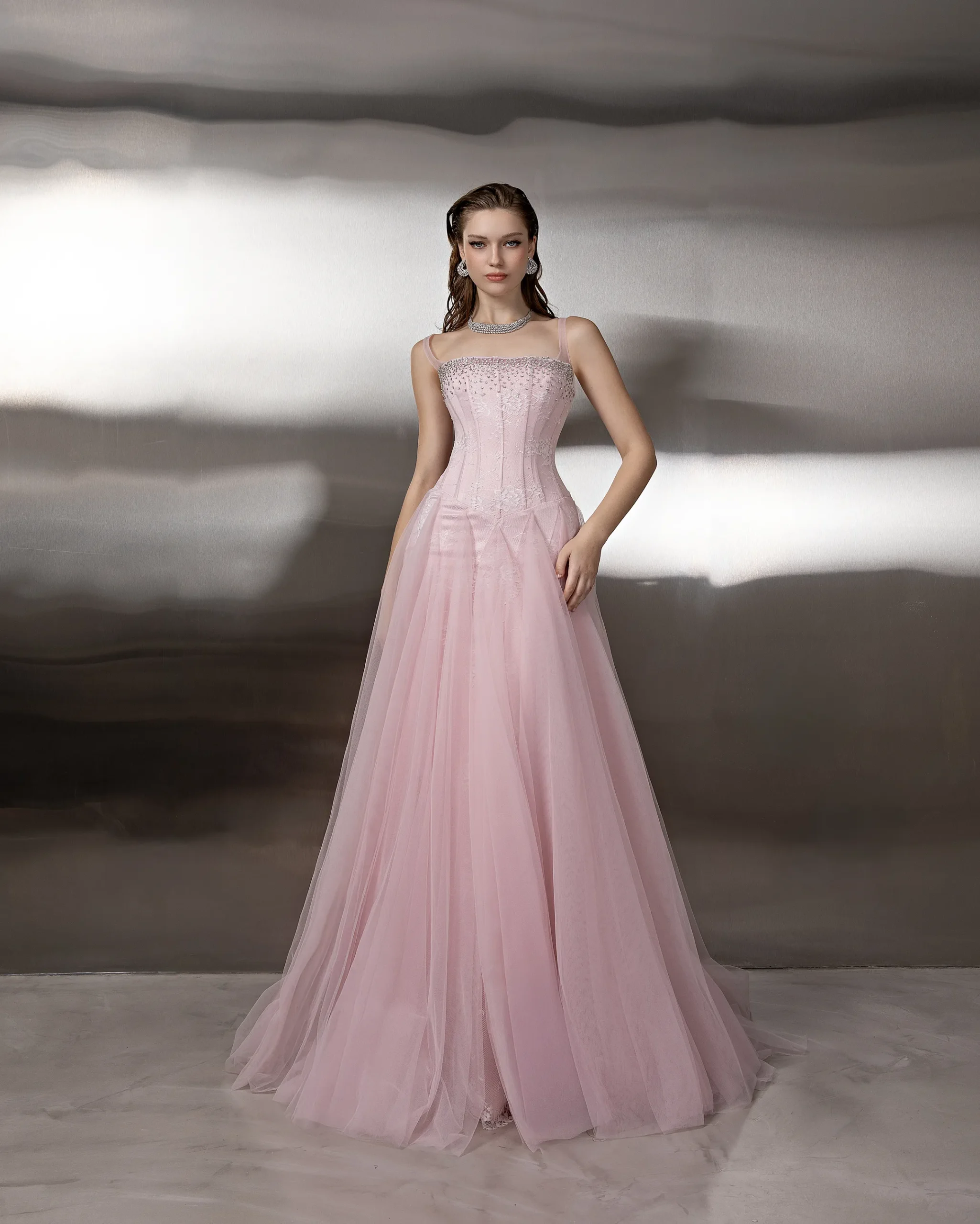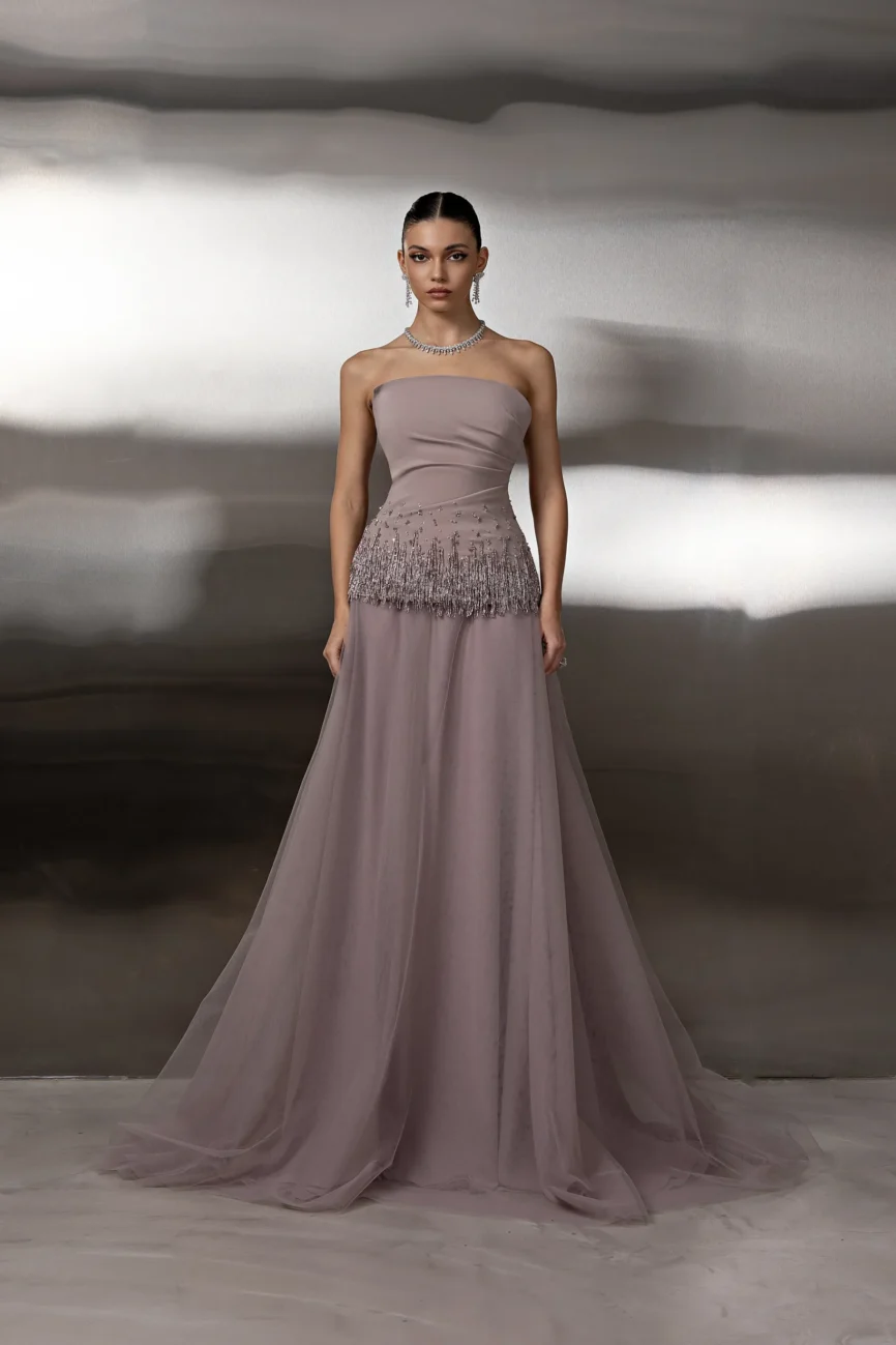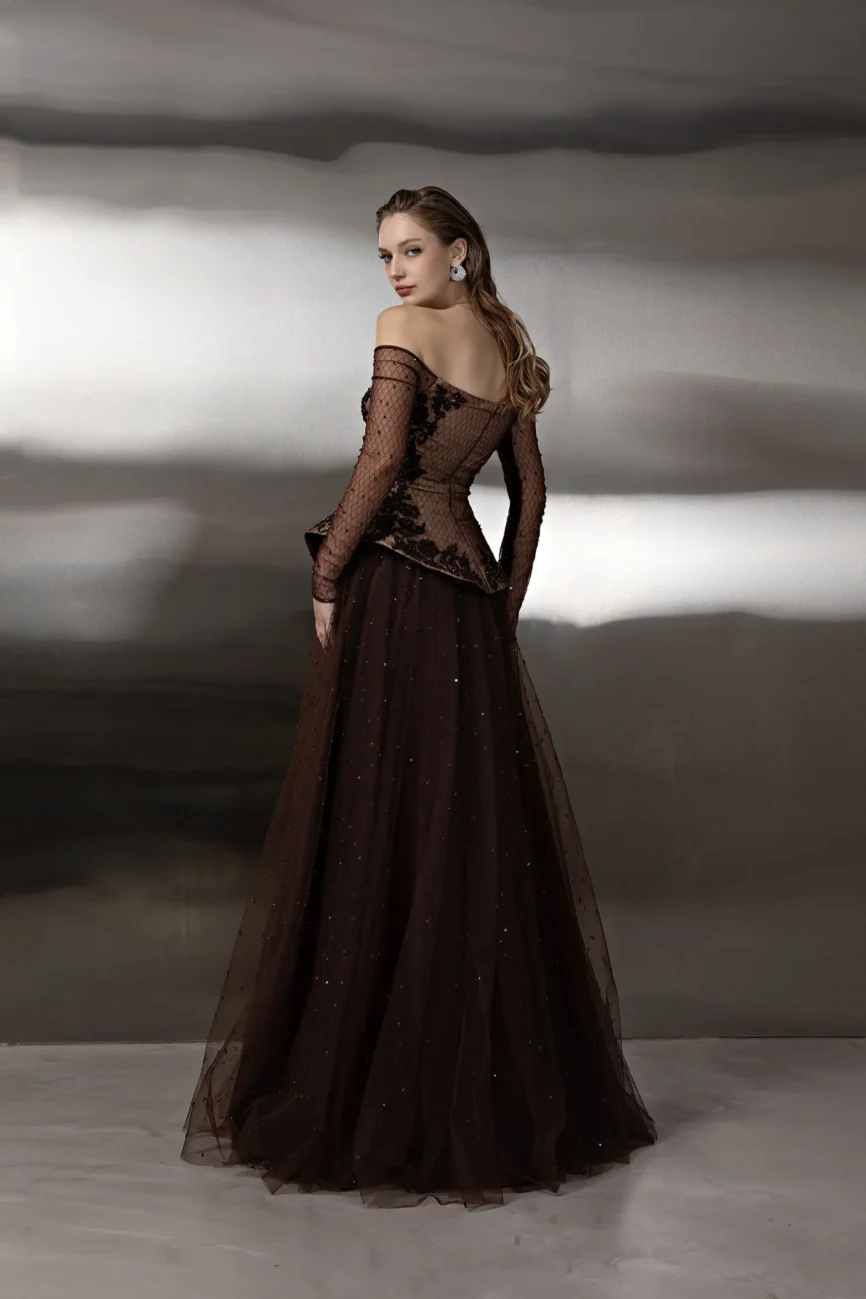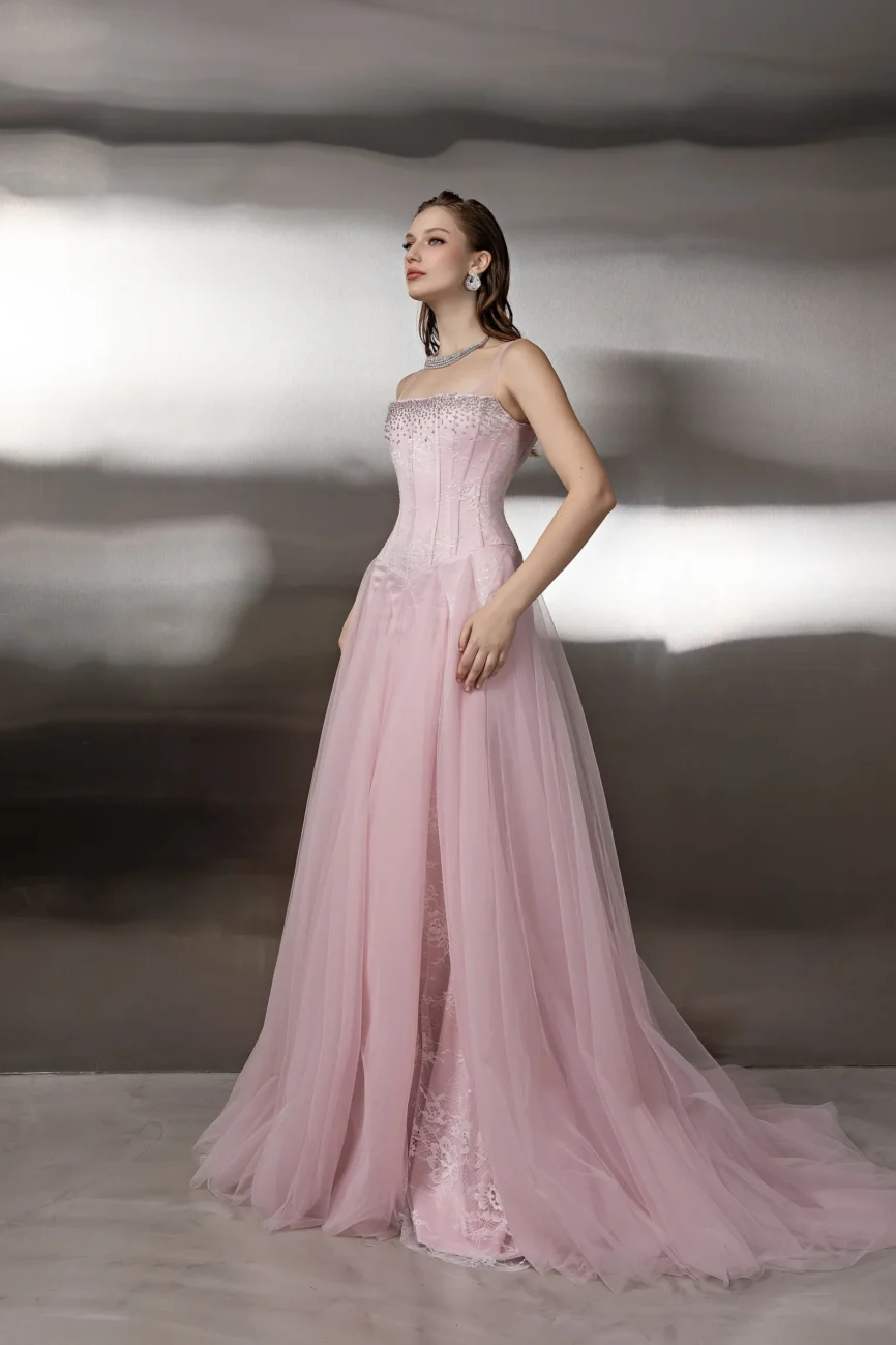 This pale yellow chiffon gown features a pleated halter neckline with off-the-shoulder draped sleeves,with pleated skirt. This dress is custom made by order to ensure a perfect fit.