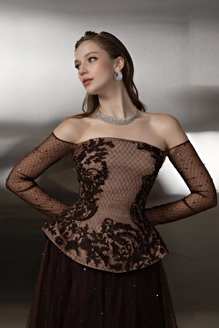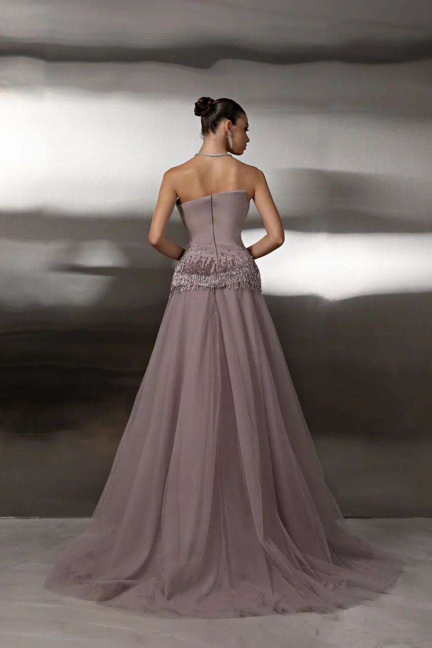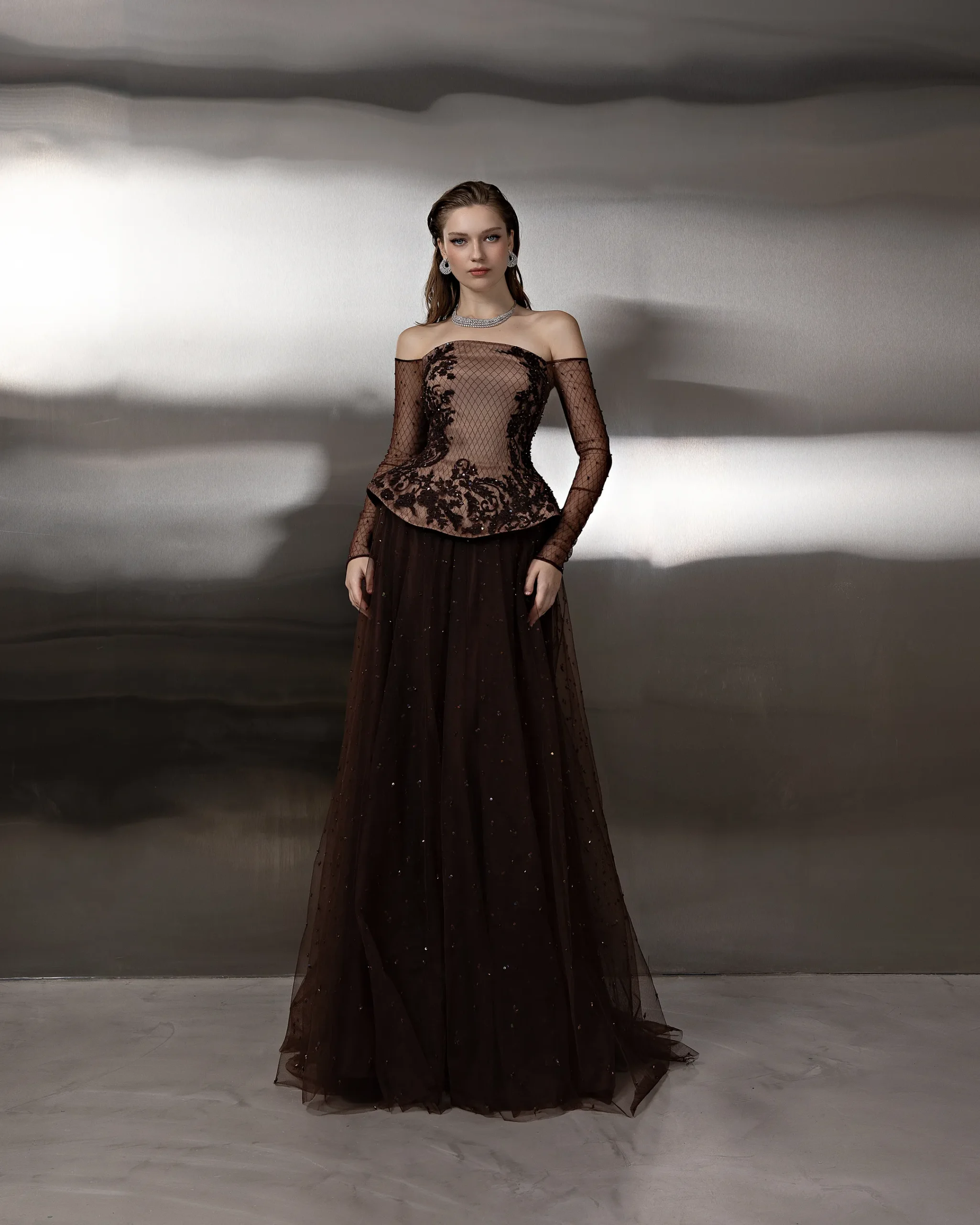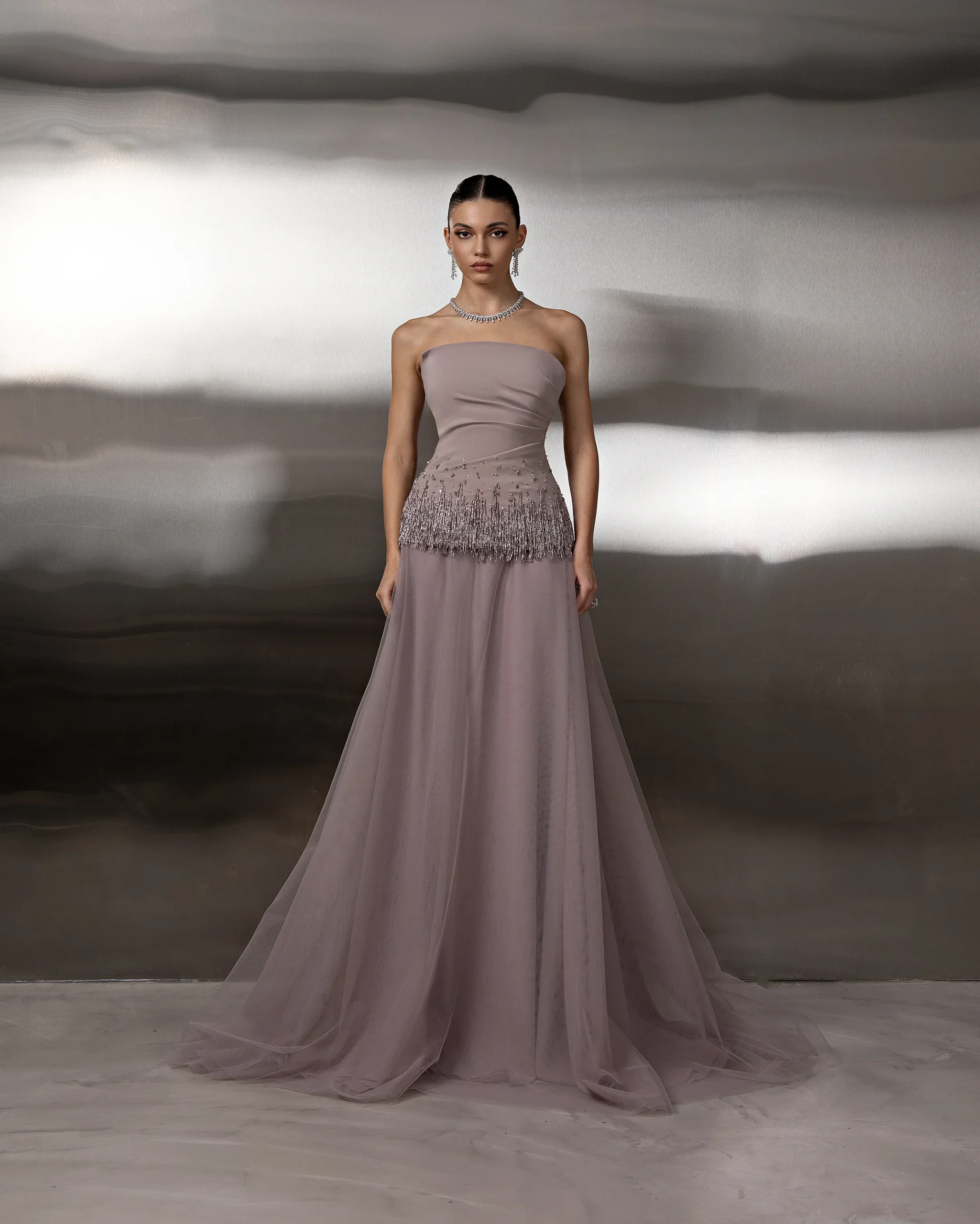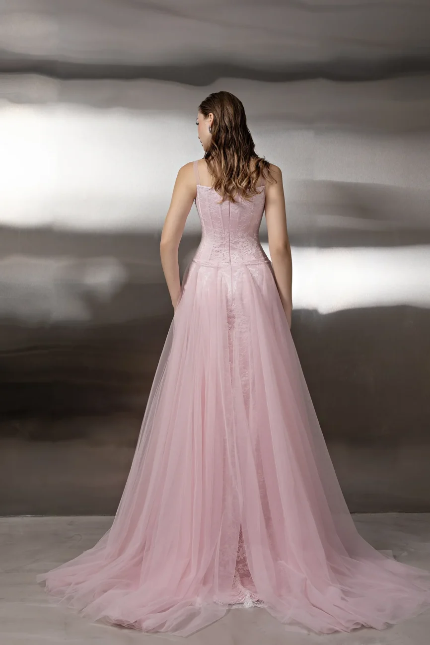 This pale yellow chiffon gown features a pleated halter neckline with off-the-shoulder draped sleeves,with pleated skirt. This dress is custom made by order to ensure a perfect fit.