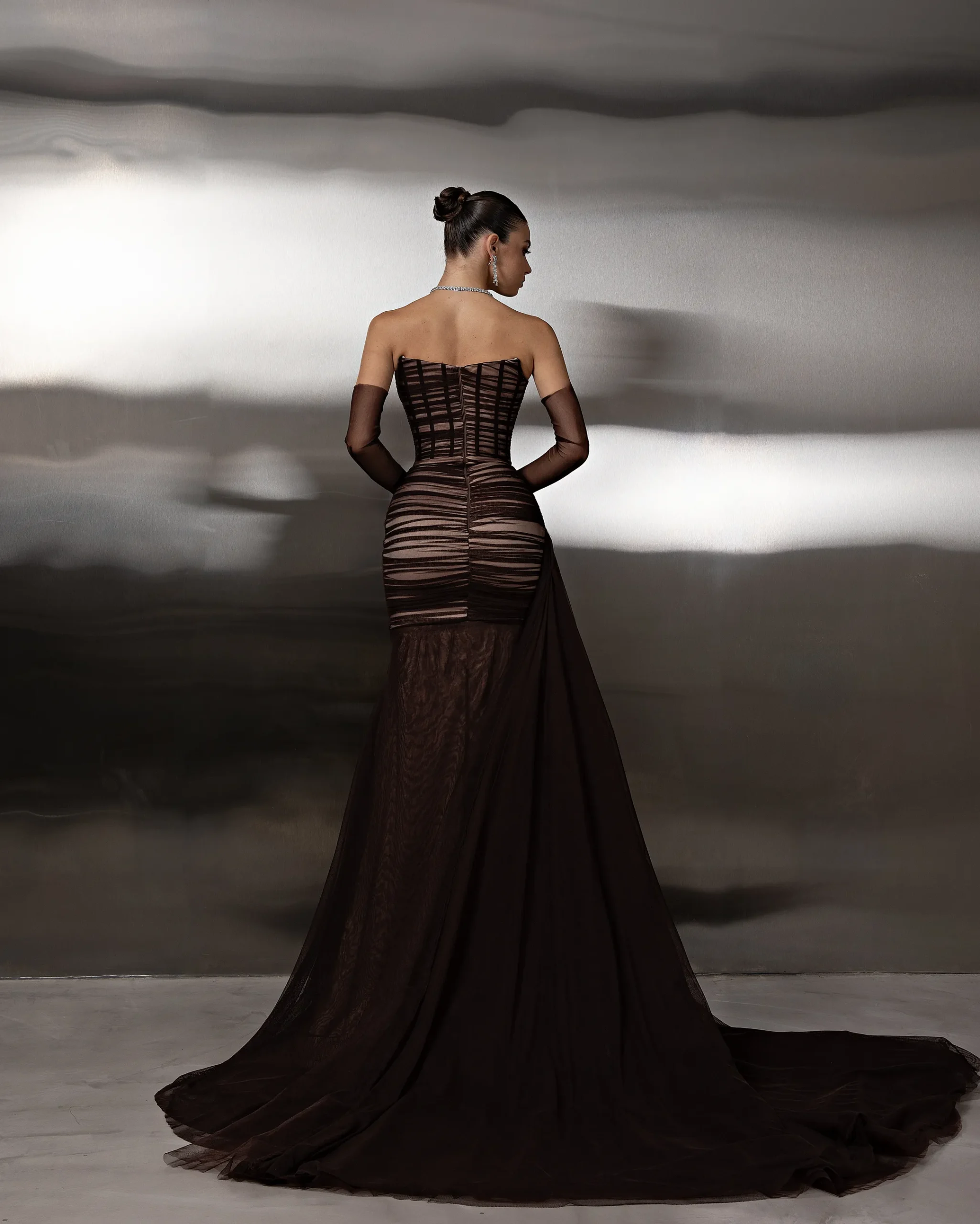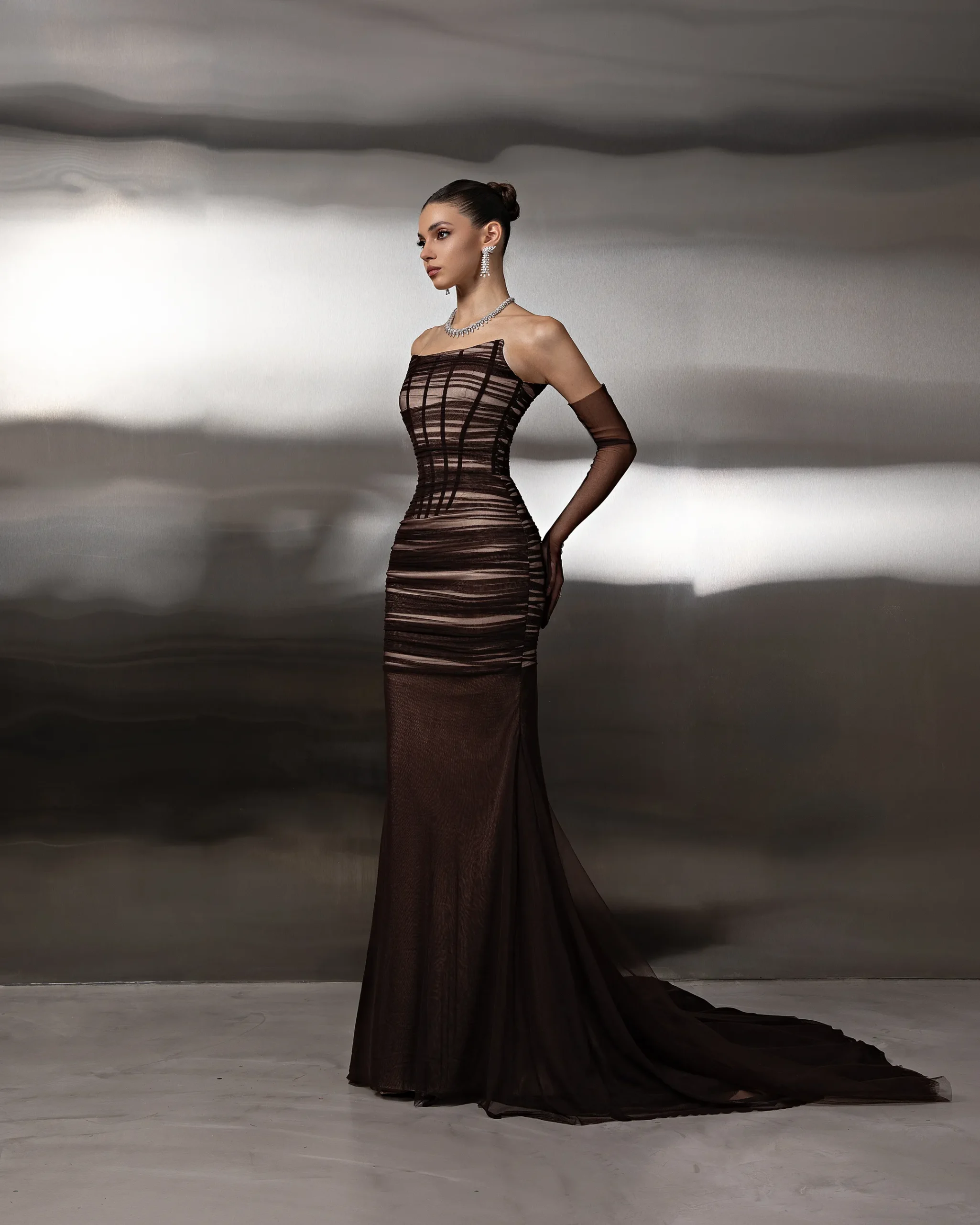 Mesh corset-style gown featuring structured vertical detailing, strapless neckline, and matching sheer gloves, finished with a fluid skirt and soft train for a sleek, modern silhouette. This dress is custom made by order to ensure a perfect fit.