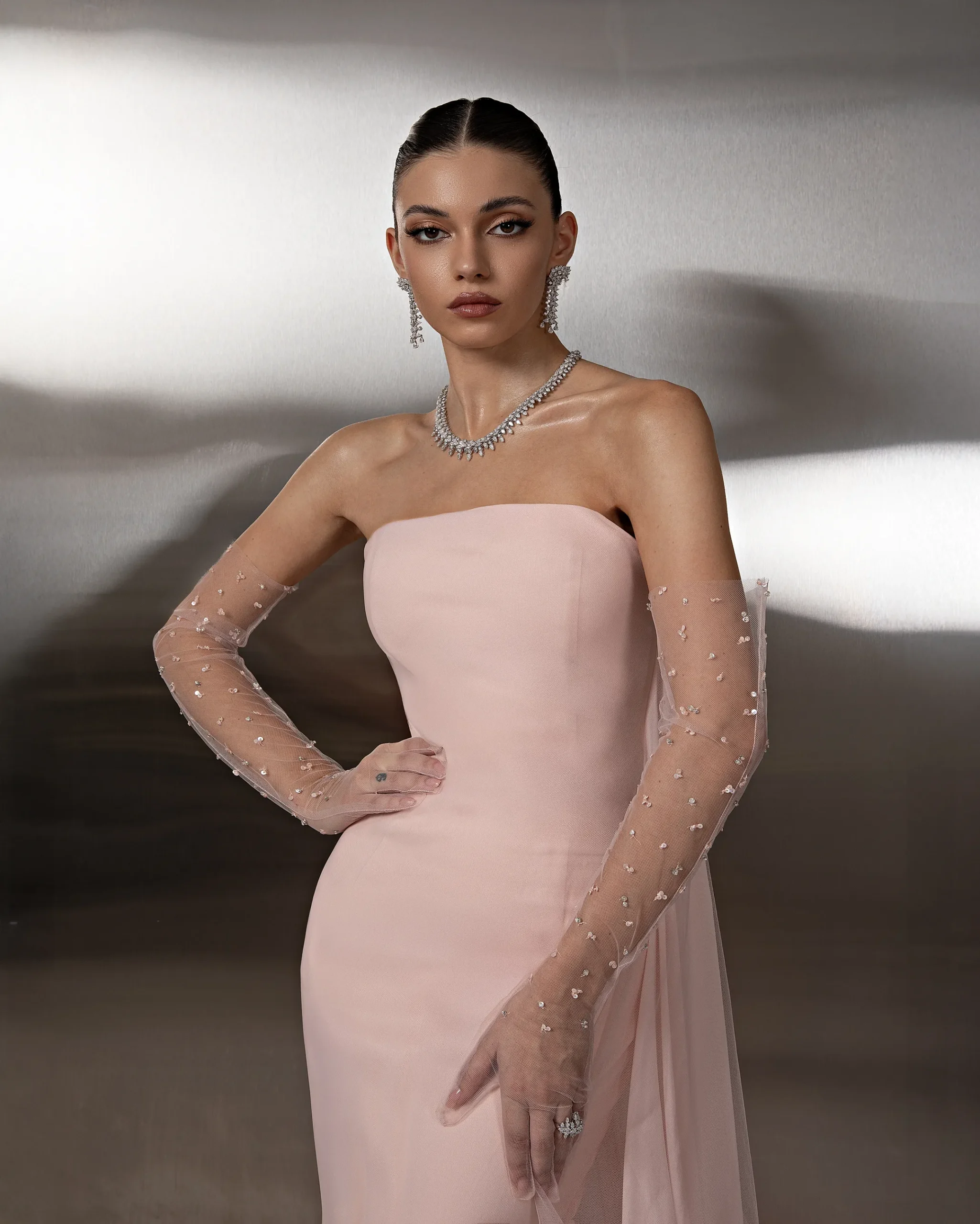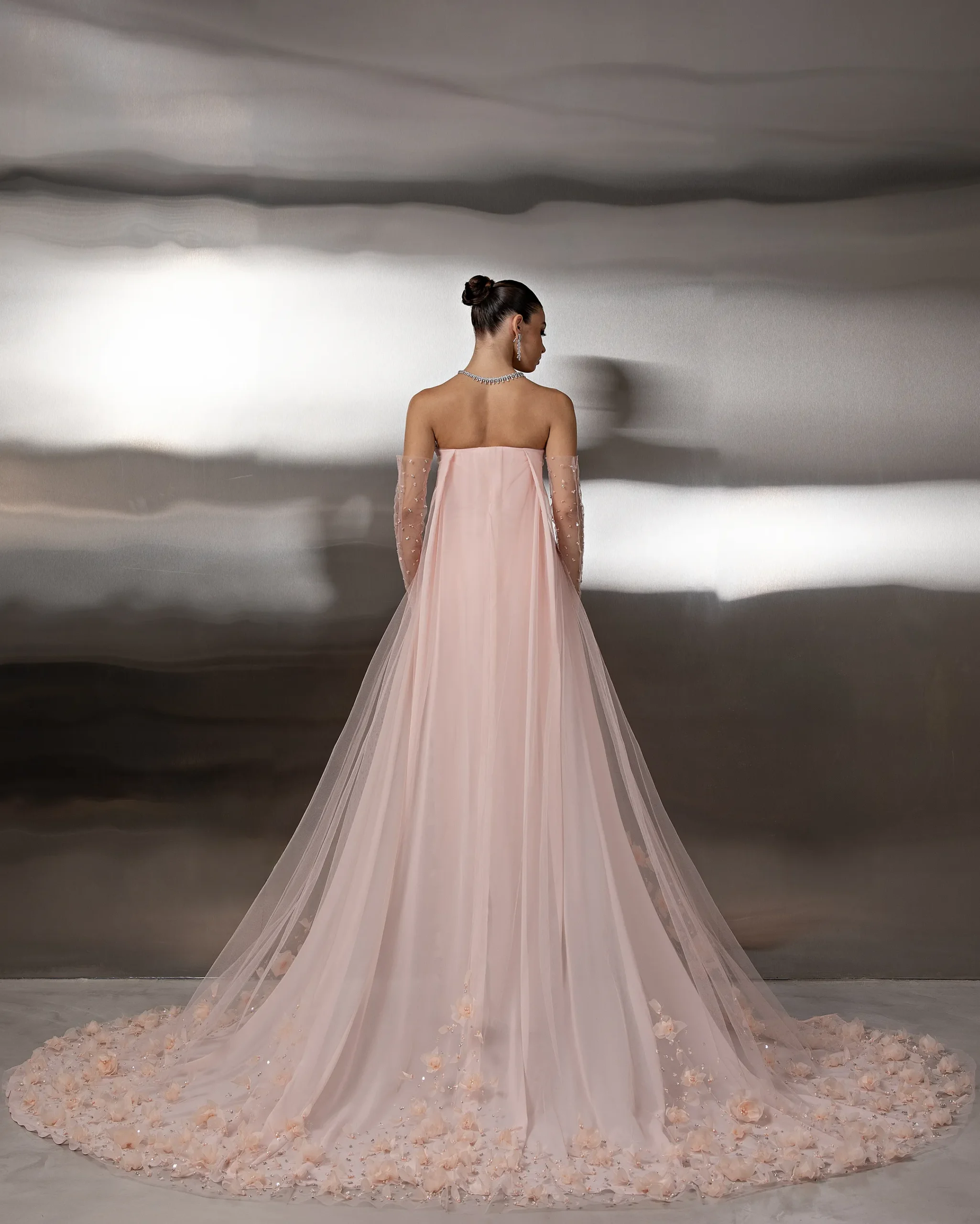A strapless, floor-length gown with a fitted silhouette, featuring sheer embellished gloves and a flowing tulle cape with delicate floral detailing at the hem. This dress is custom made by order to ensure a perfect fit.