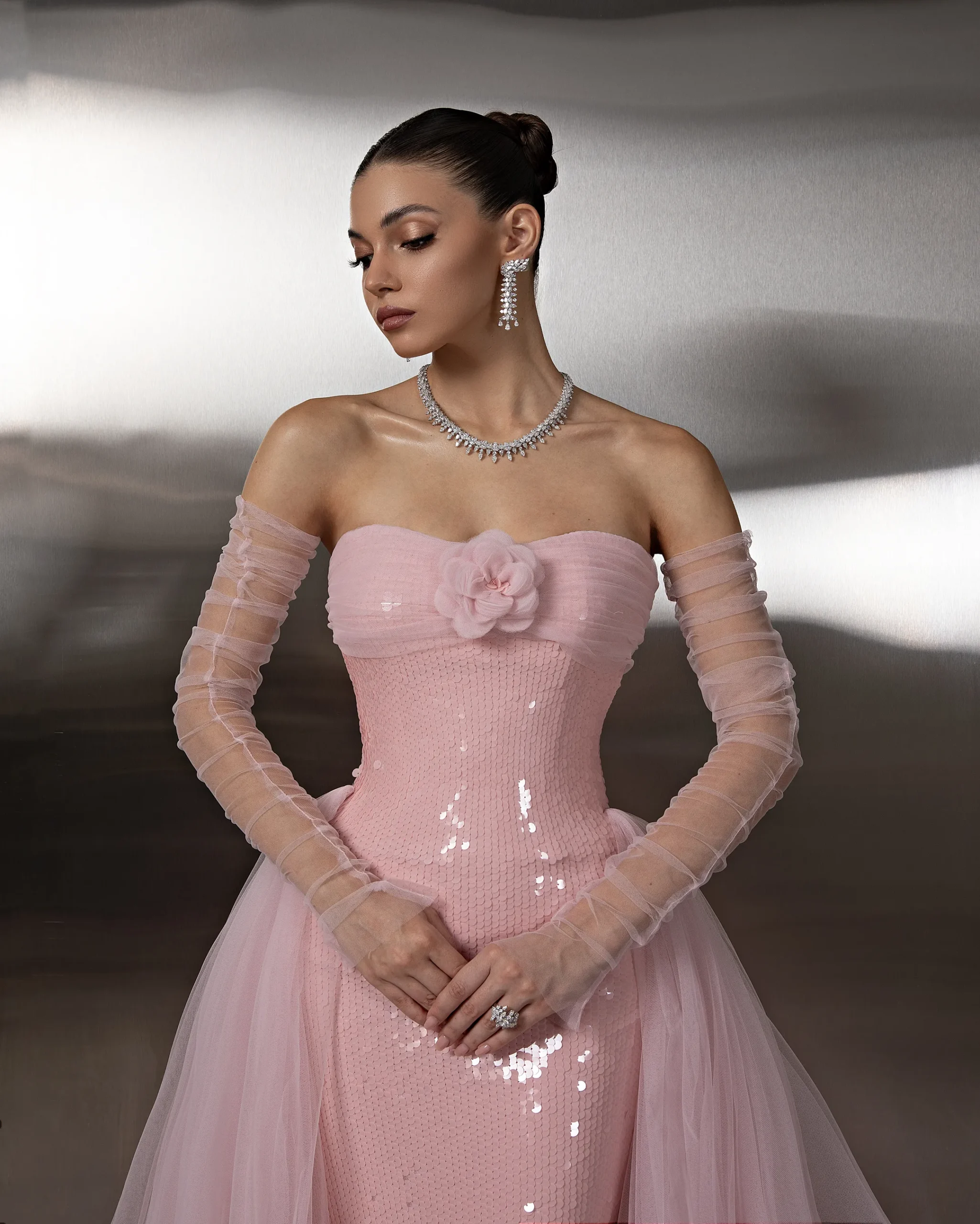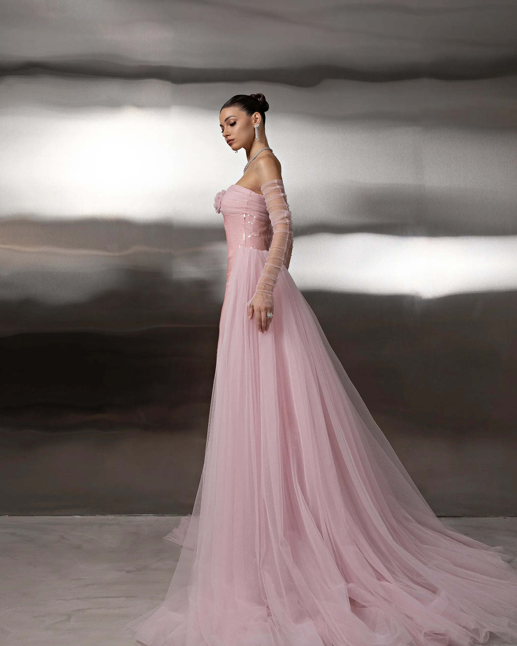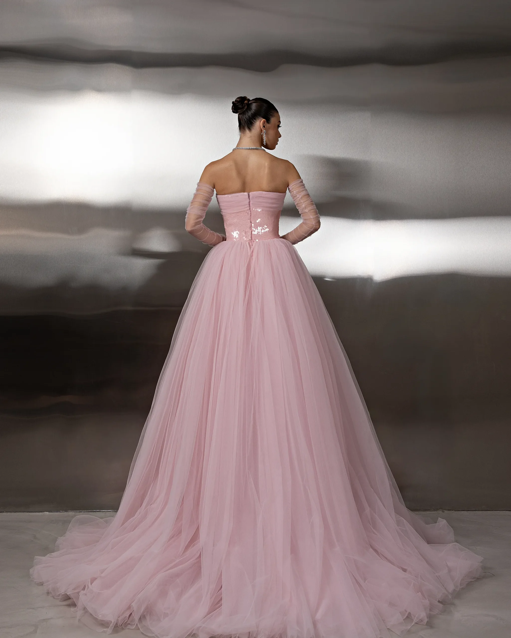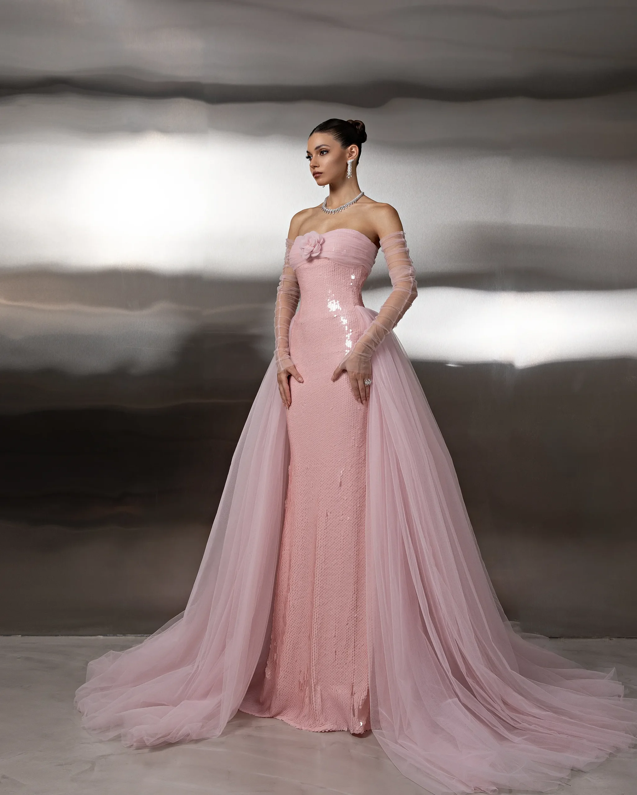 Elegant strapless gown with a sequined fitted bodice, sheer tulle detached sleeves, and a flowing layered tulle overskirt/ cape, creating a refined and graceful silhouette. This dress is custom made by order to ensure a perfect fit.